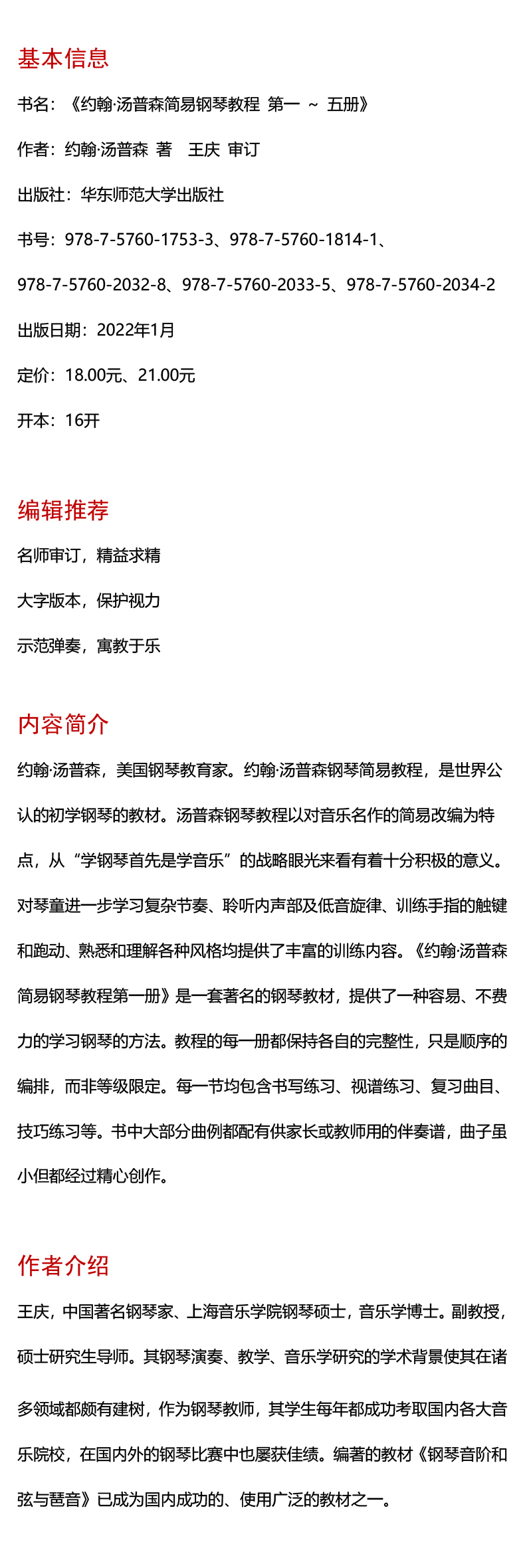 约翰汤普森简易钢琴教程第1-5册 大字版 儿童钢琴演奏学习教程教材教学 附带示范演奏音频 正版 华东师范大学出版社