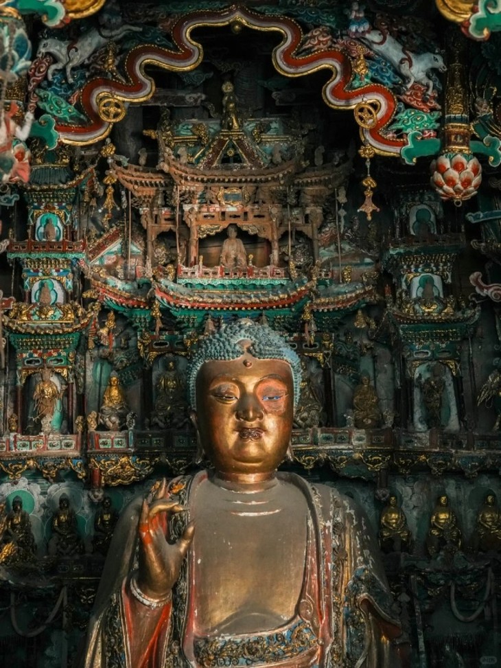 这是一座佛教禅宗寺院,是中国雕塑艺术史上的“悬塑绝唱”,是一场震撼人心灵的美学盛宴,1000 多尊彩塑如层峦叠嶂一般耸立着。169.6平方米的大雄宝殿里,这是从云端落下的富丽堂皇的极乐世界,乐伎轻歌曼舞,飞天安详飘动。