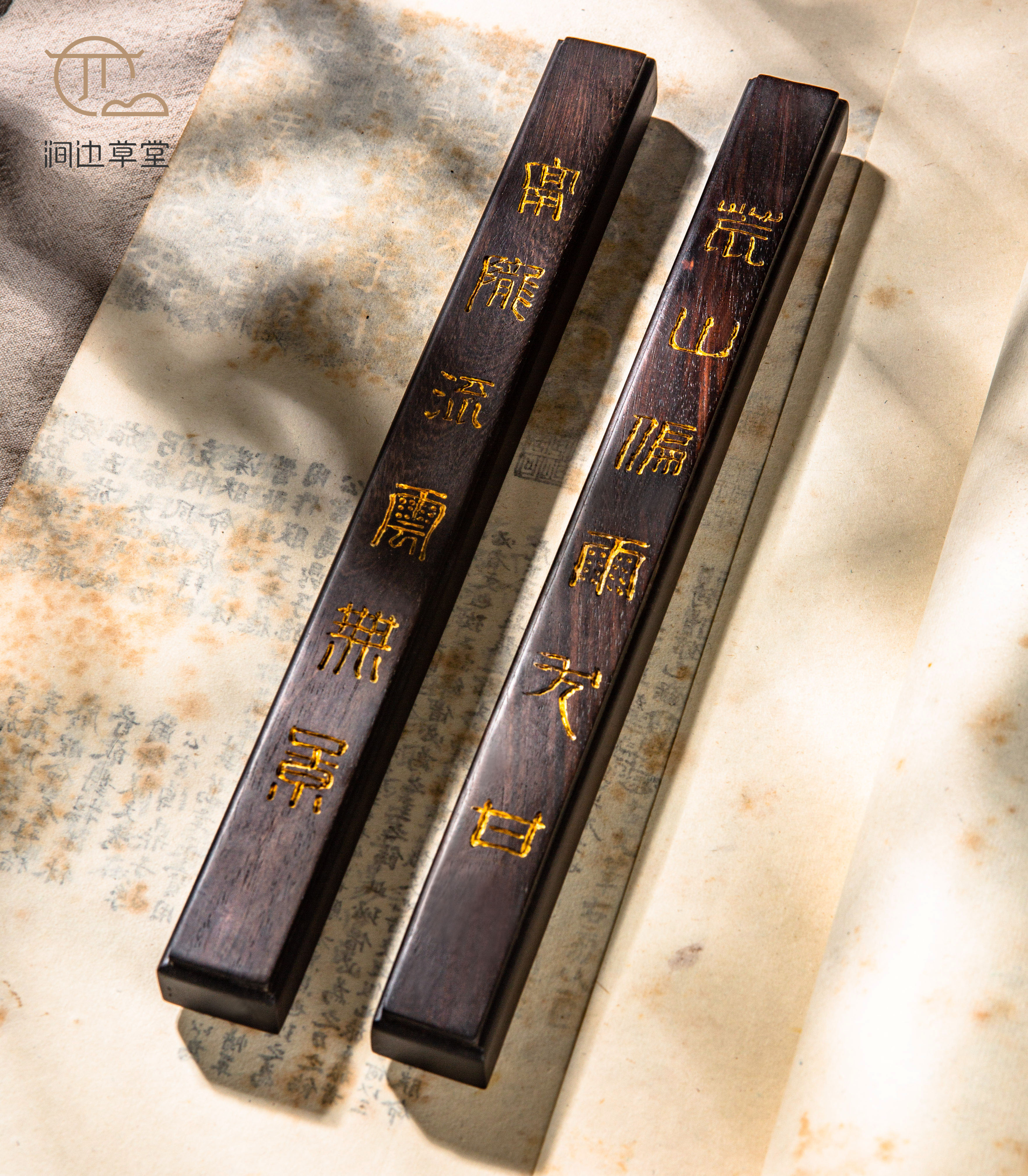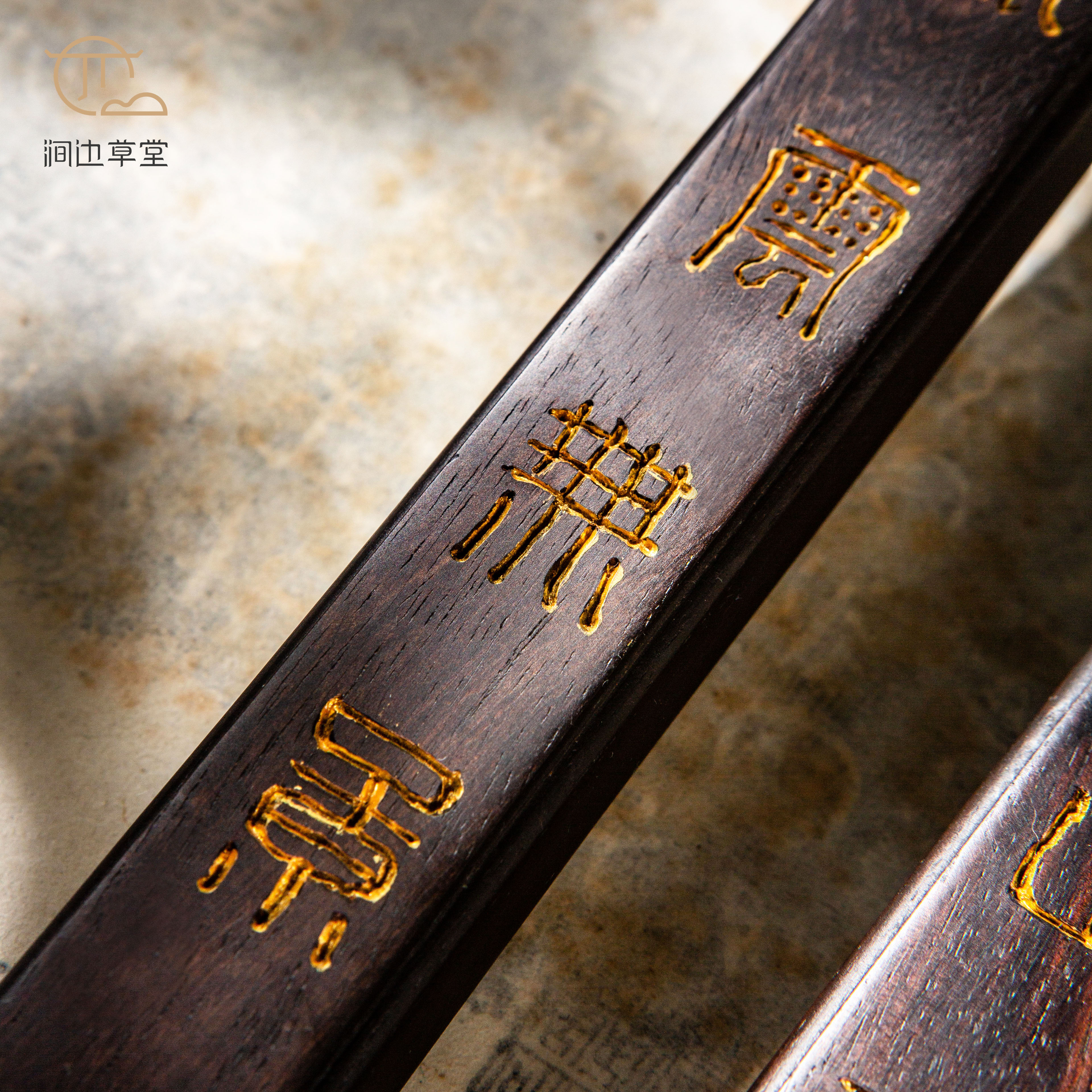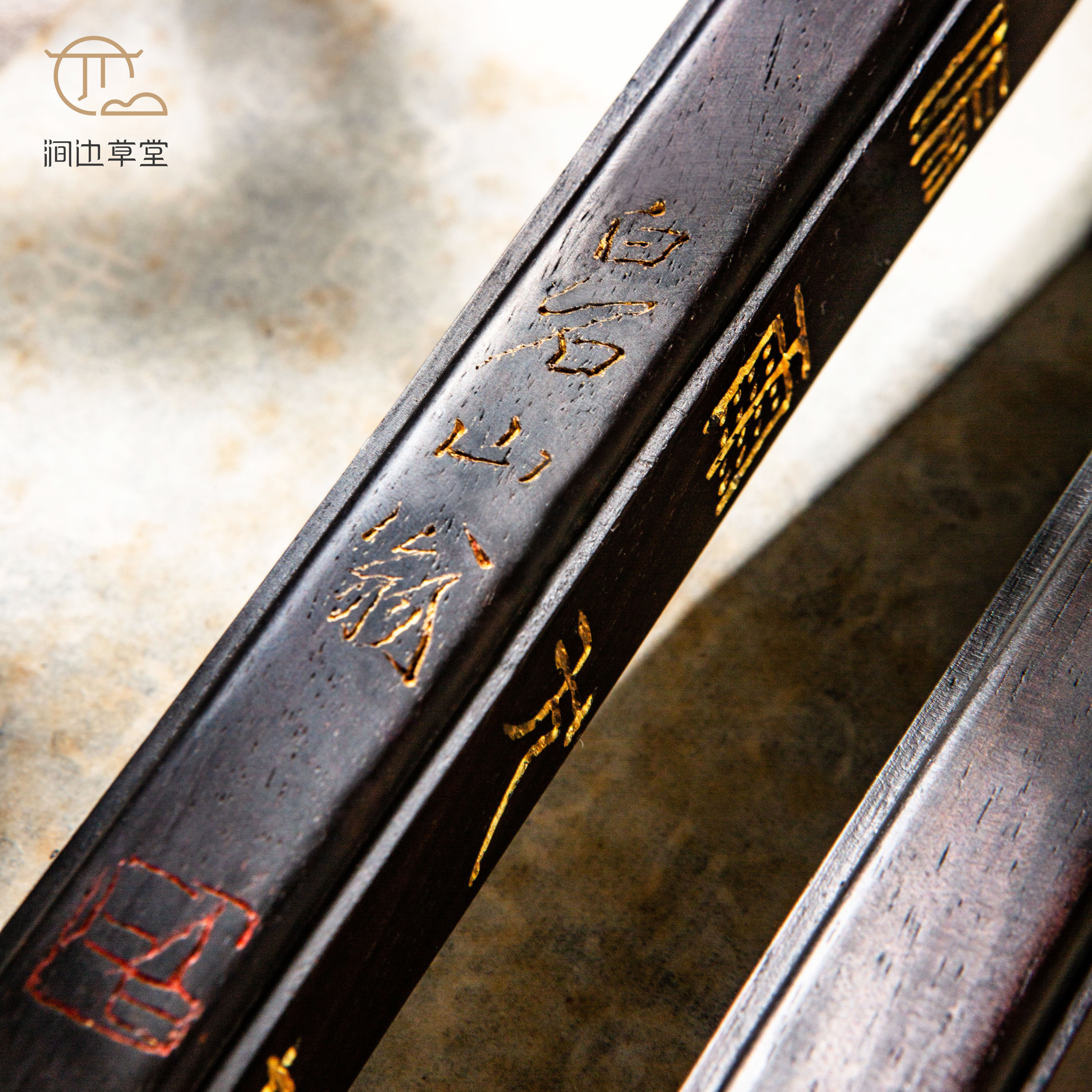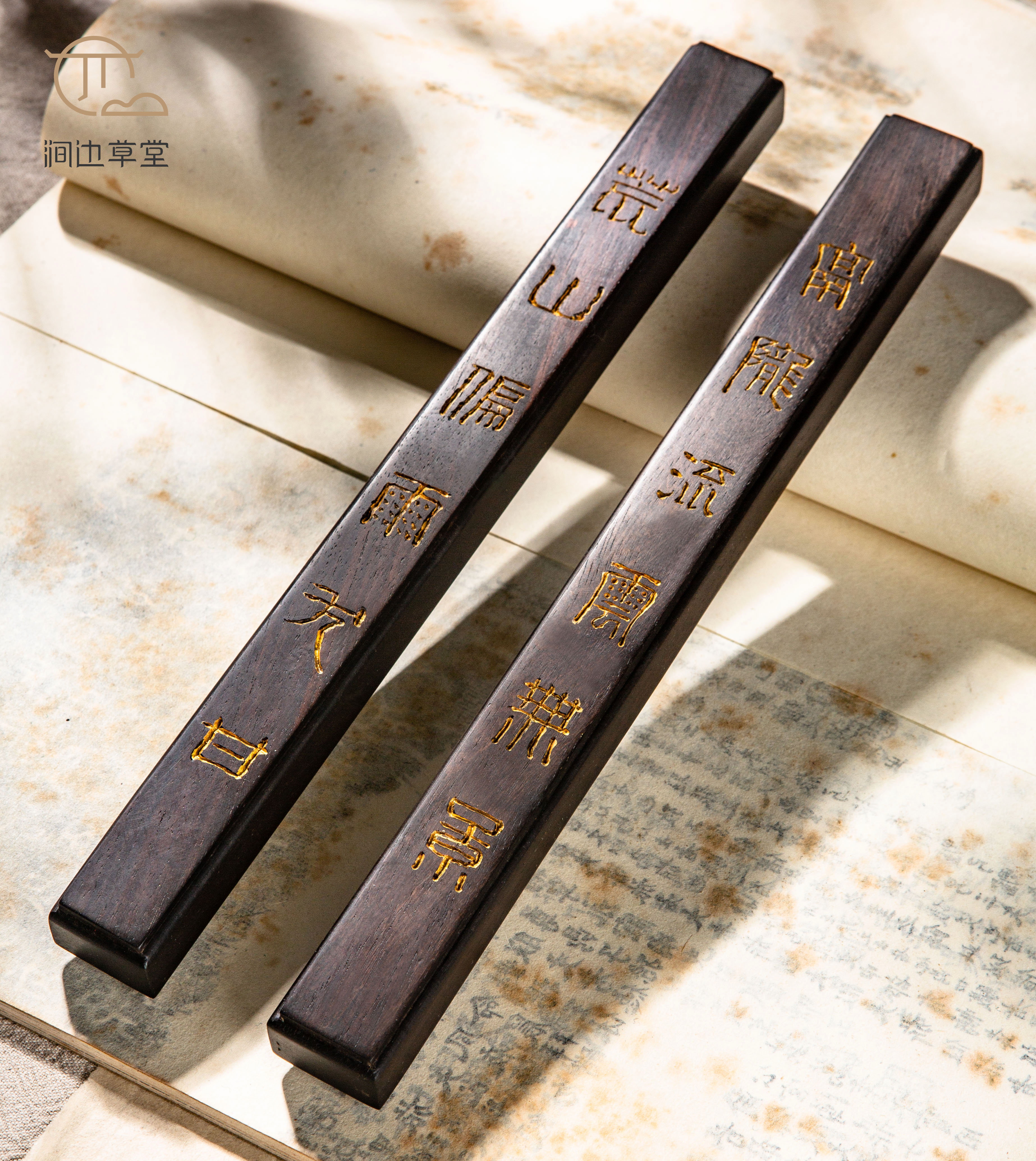 此镇纸选料为清代中期老红木家具材料,此种材料在清代晚期就已经绝种,十分稀有。涧边草堂工艺美术师用此材料纯手工精雕近现代书画名家书房联,纯手工雕工精细,每一对都带边款,是收藏及实用的俱佳品。承载了200年历史岁月的老红木原材料加上书画名家的文学底蕴及精彩书法,创造出不可多得的韵味,一生用此镇尺一对足矣。