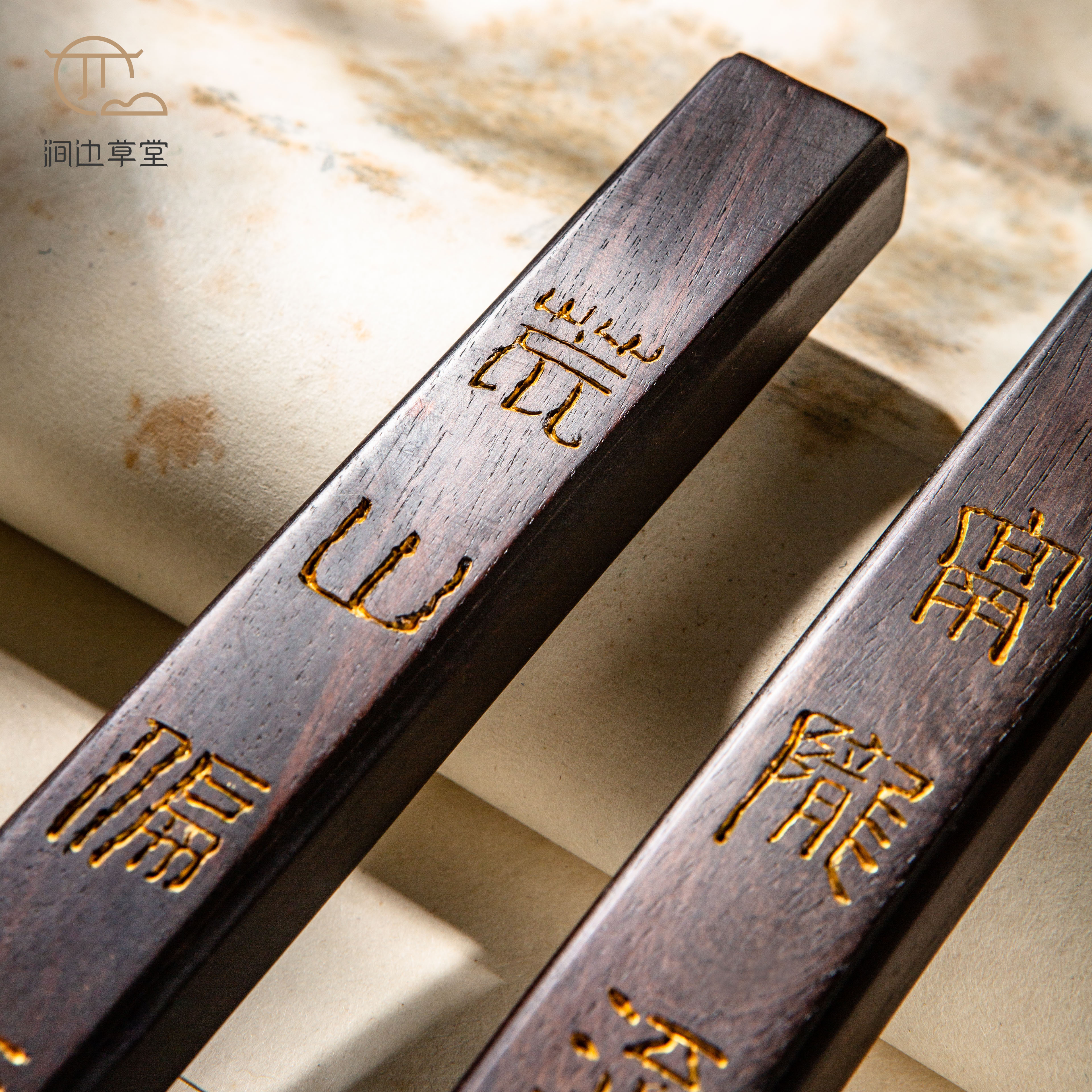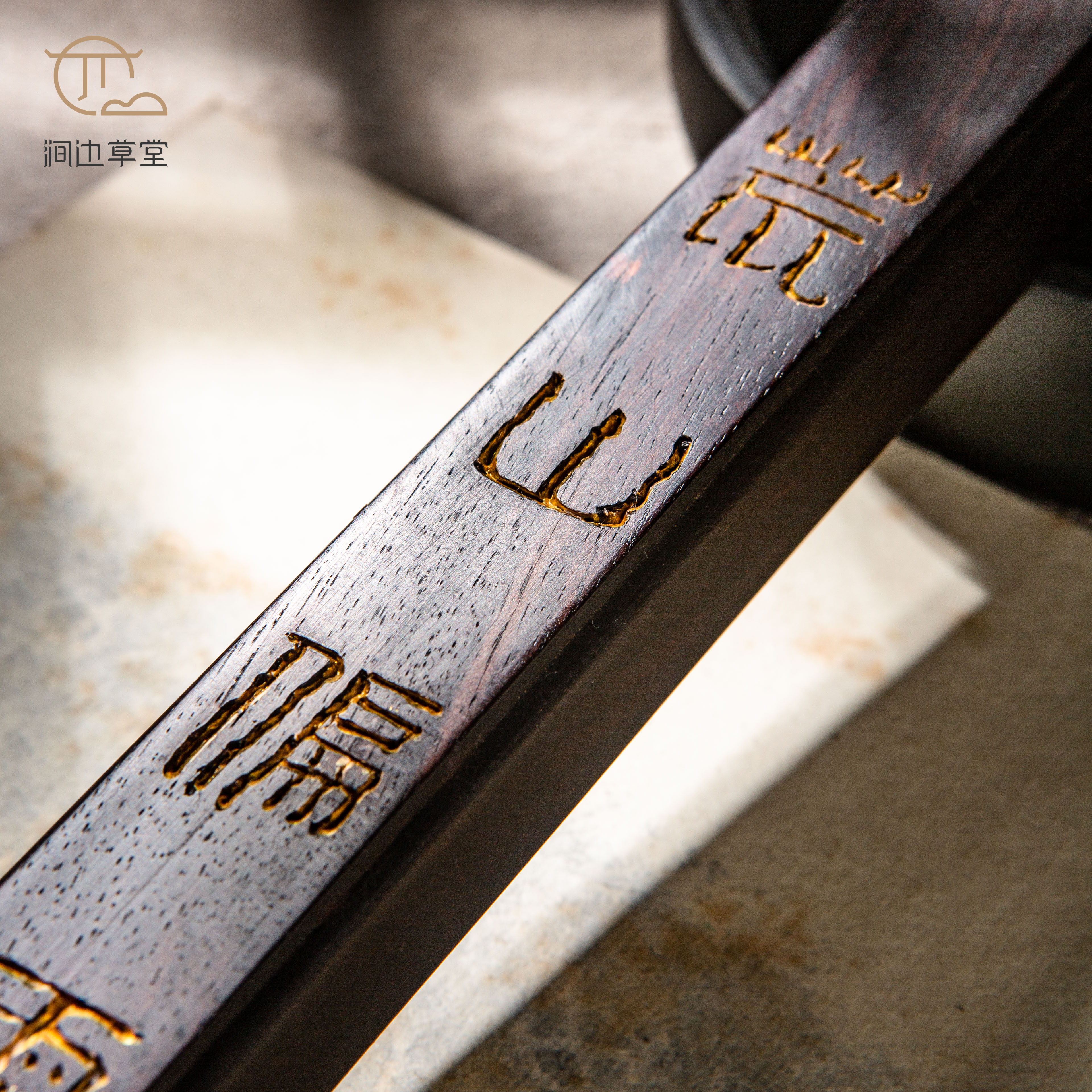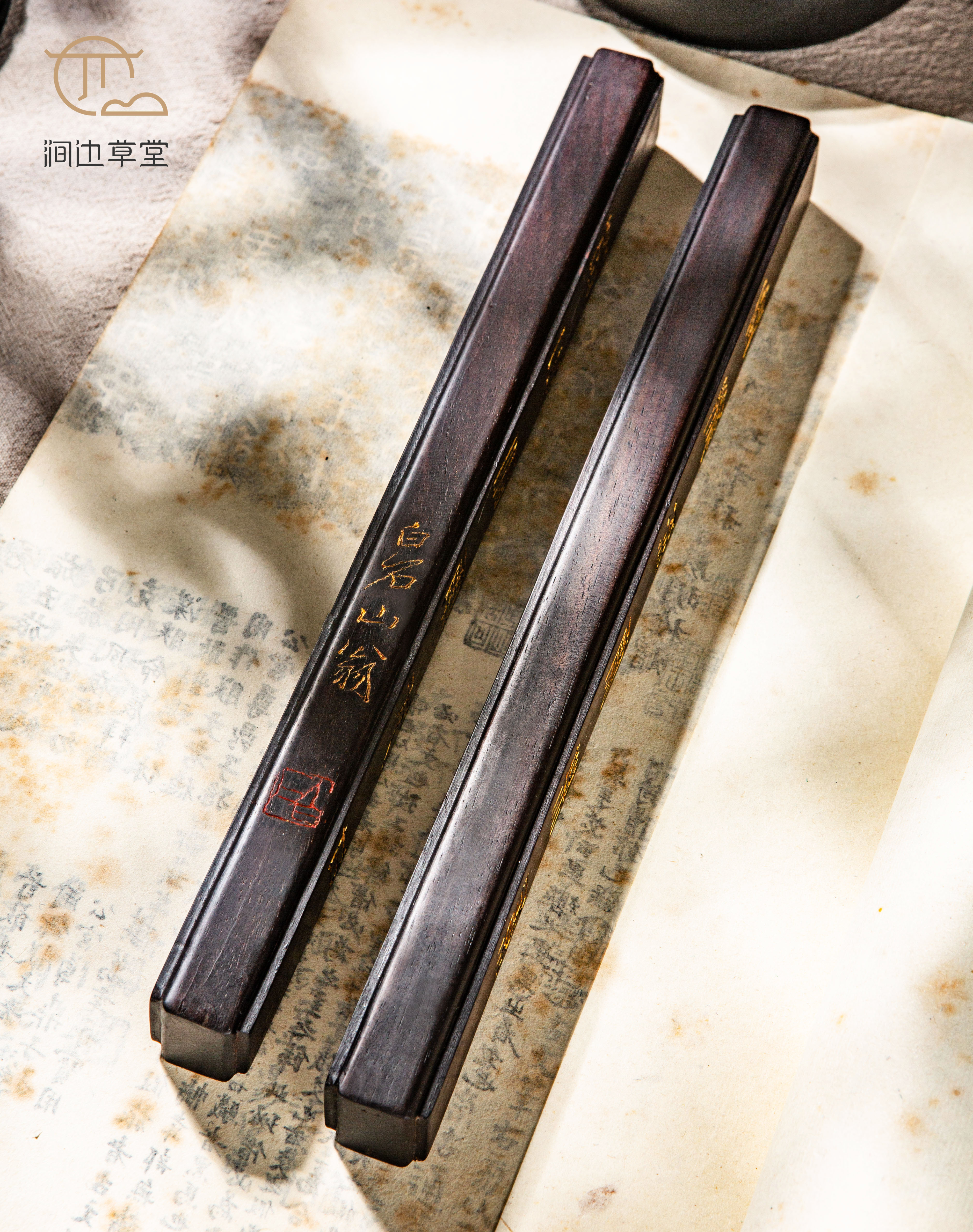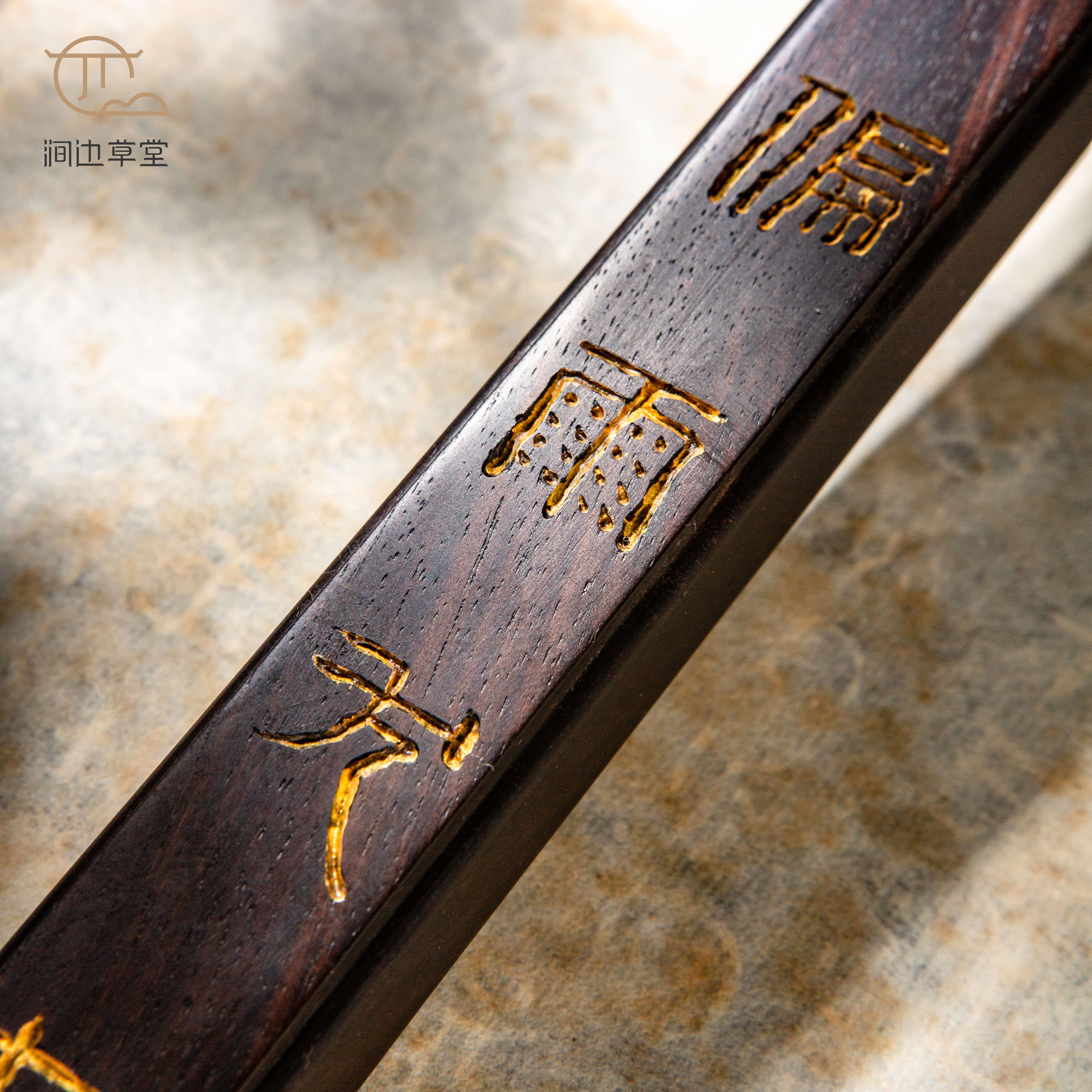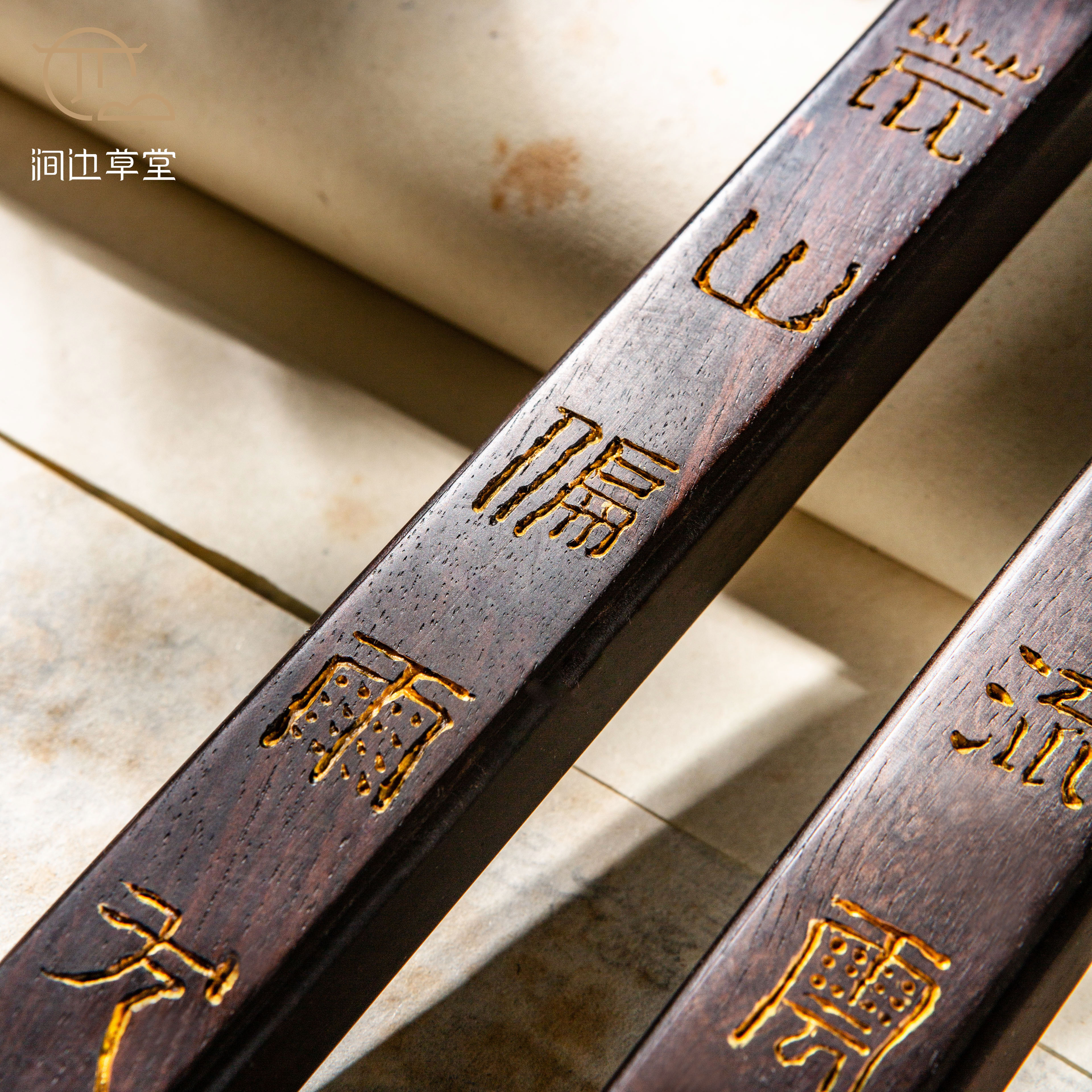 此镇纸选料为清代中期老红木家具材料,此种材料在清代晚期就已经绝种,十分稀有。涧边草堂工艺美术师用此材料纯手工精雕近现代书画名家书房联,纯手工雕工精细,每一对都带边款,是收藏及实用的俱佳品。承载了200年历史岁月的老红木原材料加上书画名家的文学底蕴及精彩书法,创造出不可多得的韵味,一生用此镇尺一对足矣。