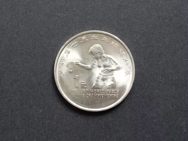 世乒赛纪念币,全名为“第43届世界乒乓球锦标赛”纪念币,1995年4月26日发行,面值1元,发行量为1000万枚,上海造币厂承制。