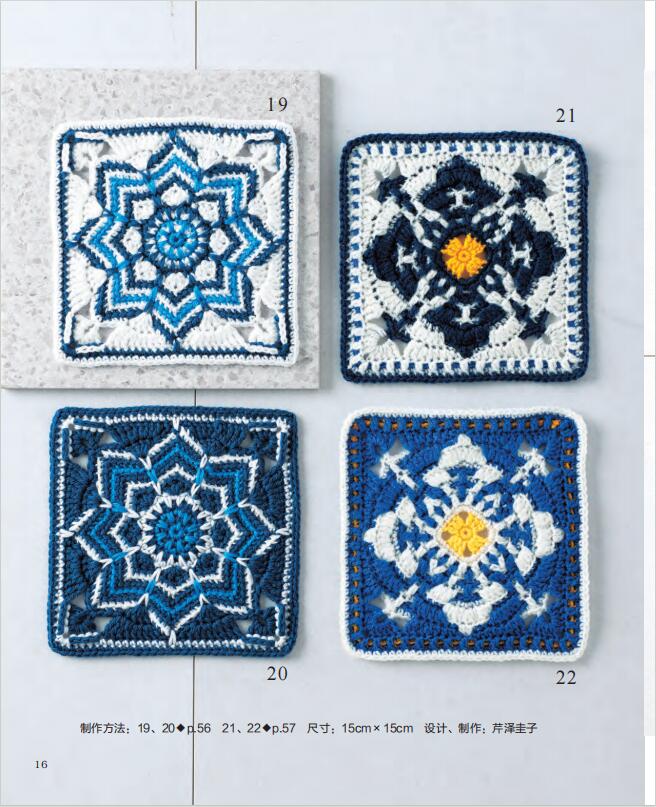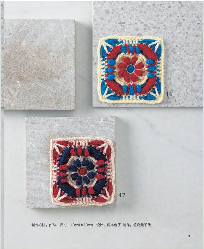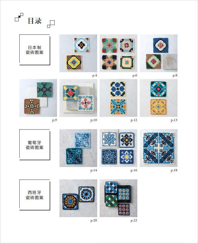 日本制瓷砖图案 p.4、p.6、p.8、p.9、p.10、p.12、p.13葡萄牙瓷砖图案 p.14、p.16、p.18西班牙瓷砖图案 p.20、p.22墨西哥瓷砖图案 p.24、、p.25、p.26、p.27、p.28、p.30、p.32应用作品 手提包p.5、针插p.11、小包p.15、靠垫p.21、纸巾盒套p.31