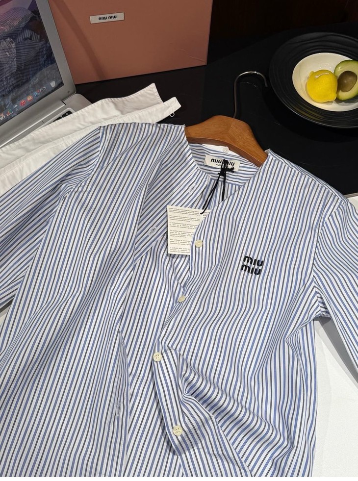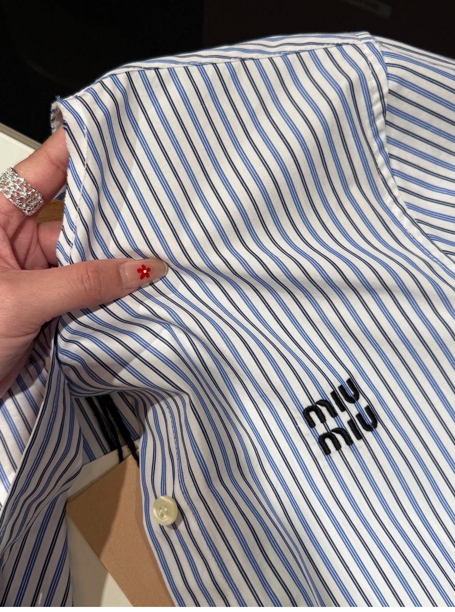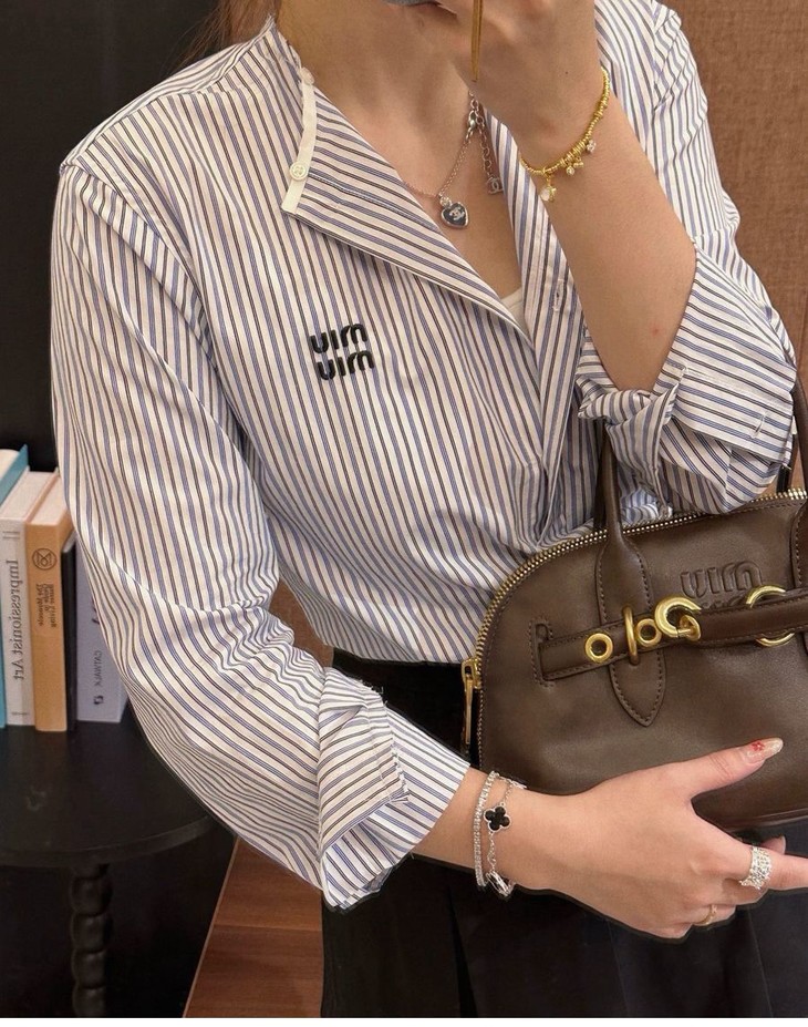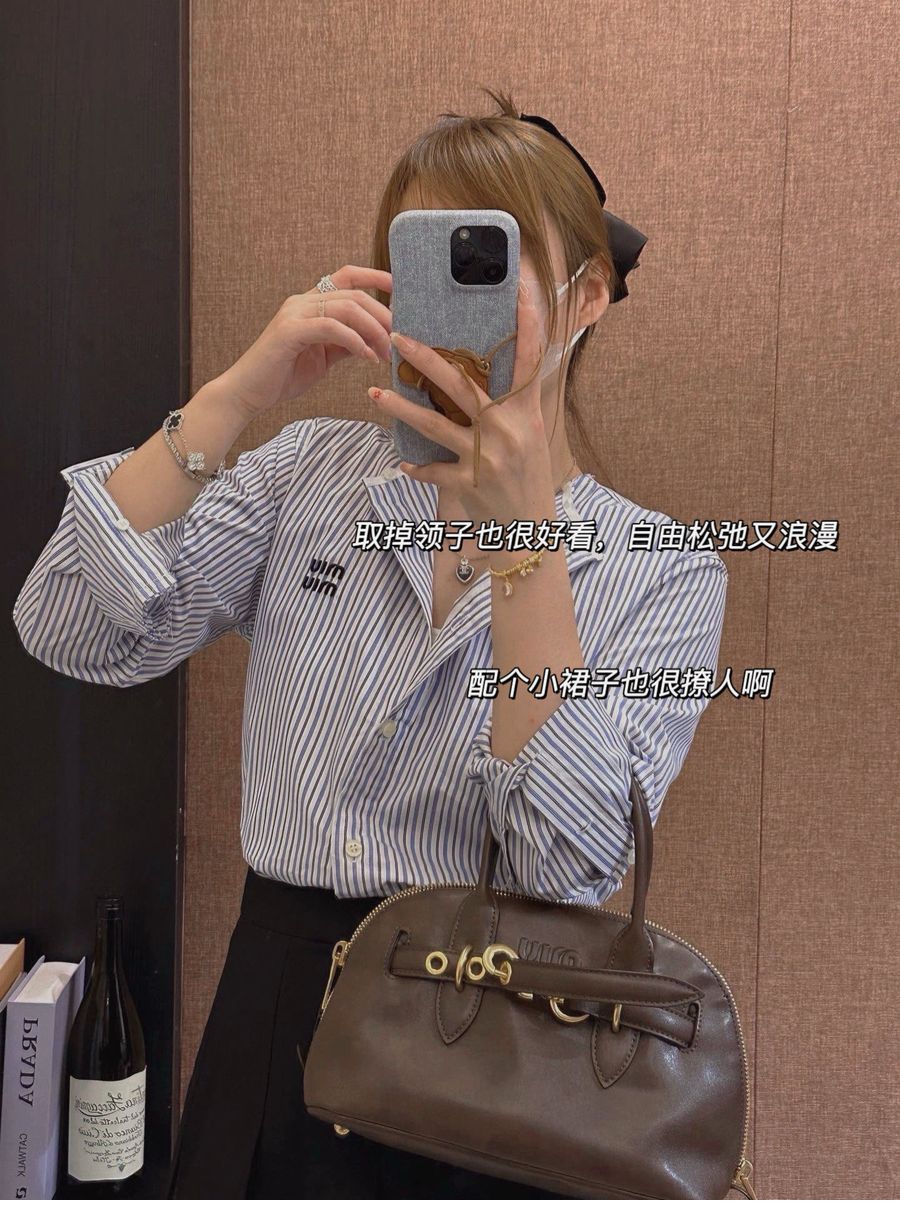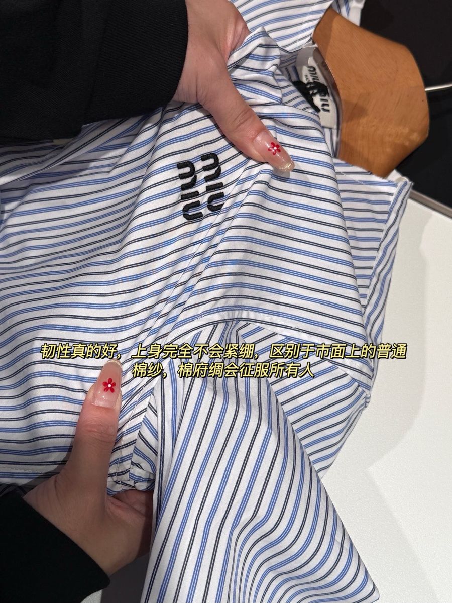 七夕限定首发新款!!采用法式衬衫灵魂的经典蓝白条,既有清新的学院风,又能穿出法式优雅感,这一刻miu的贵气感和活力少年感有了最完美的融合!