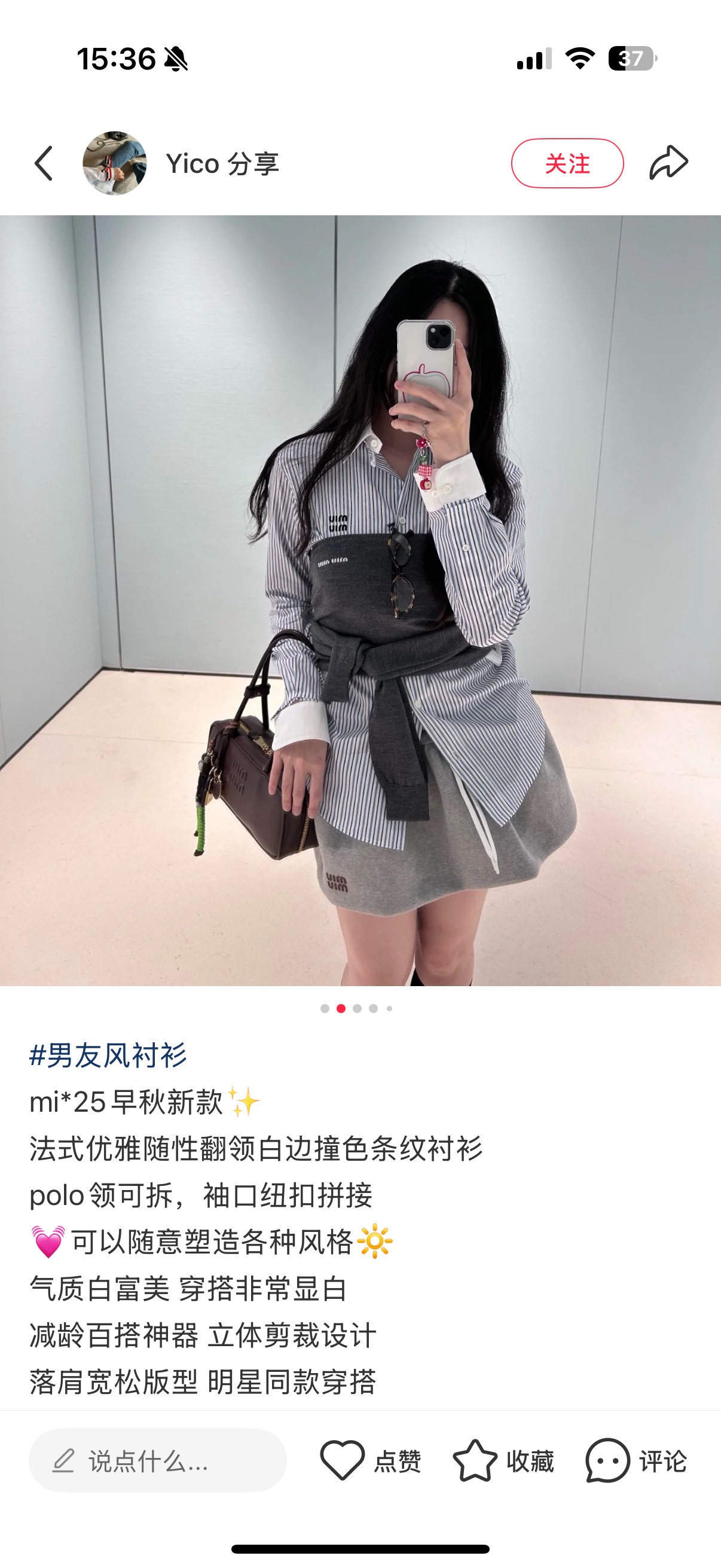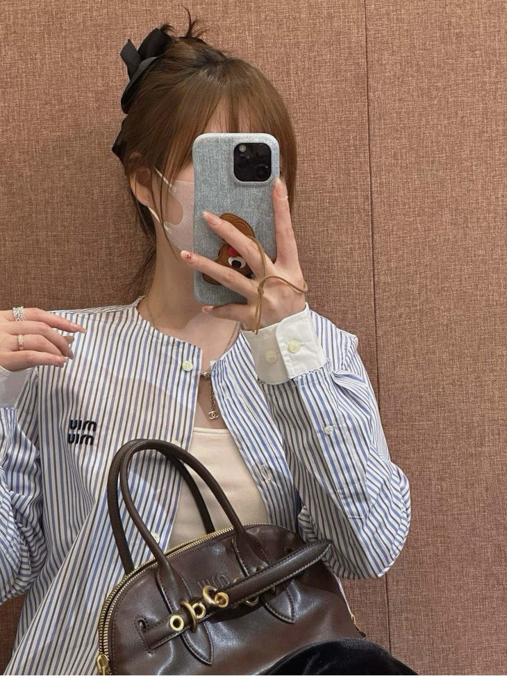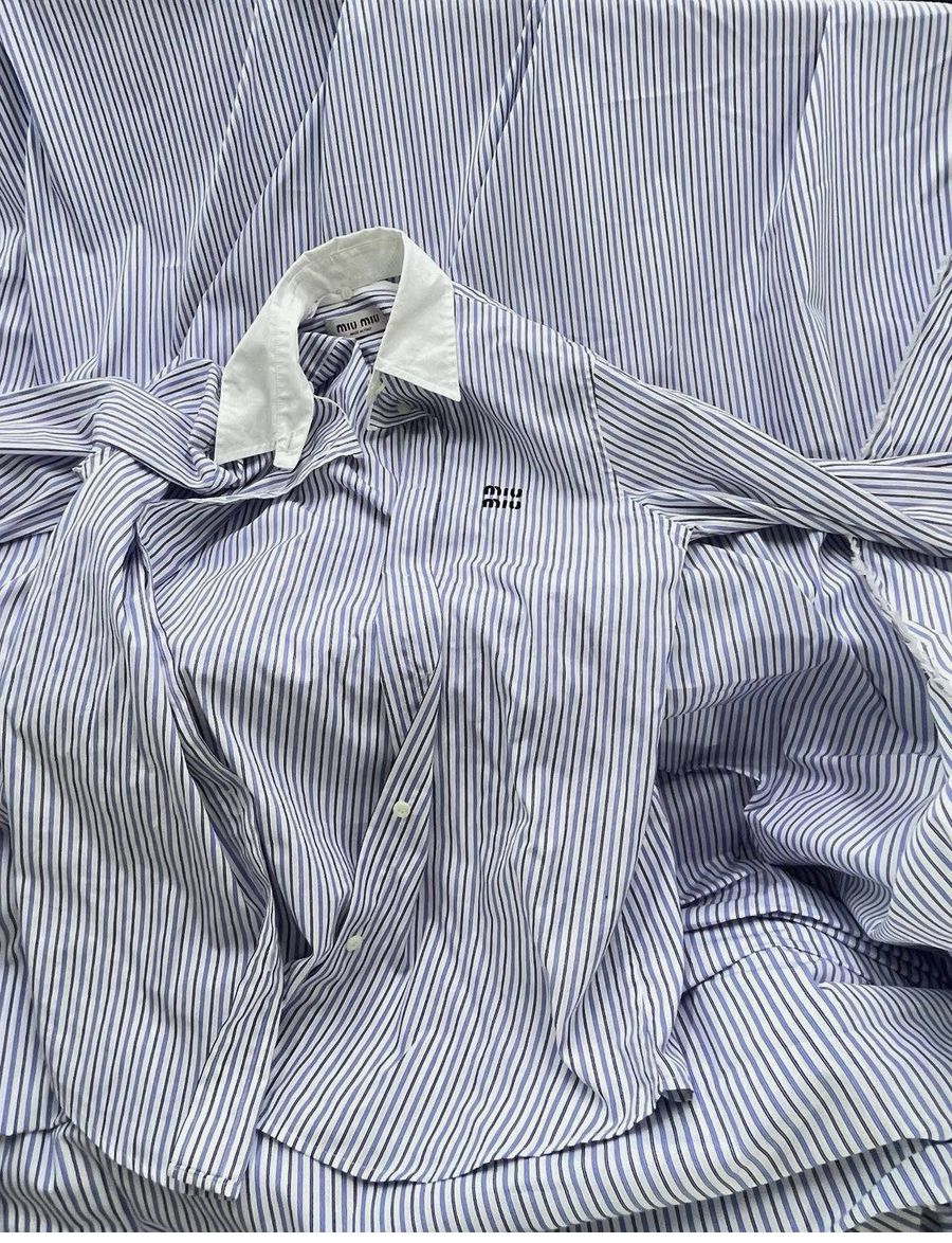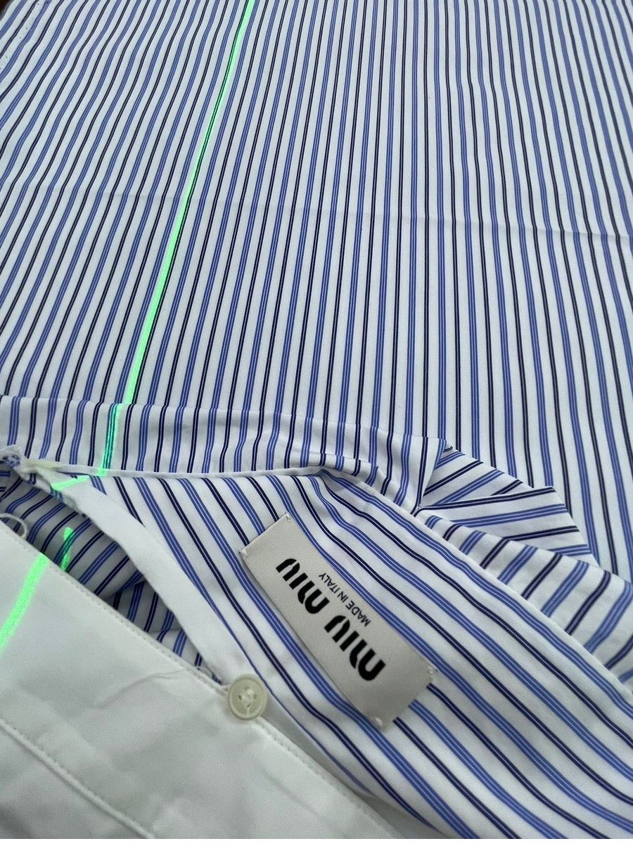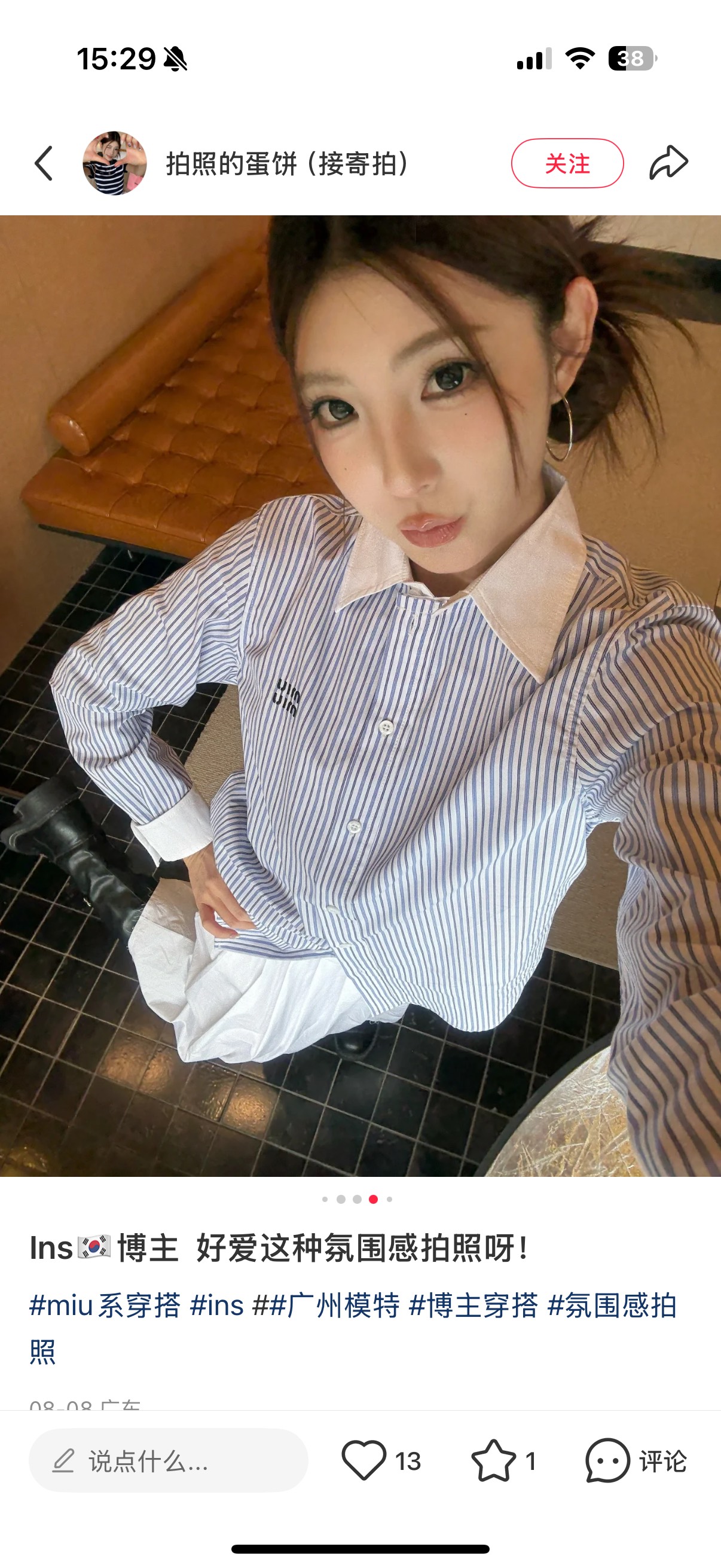 七夕限定首发新款!!采用法式衬衫灵魂的经典蓝白条,既有清新的学院风,又能穿出法式优雅感,这一刻miu的贵气感和活力少年感有了最完美的融合!