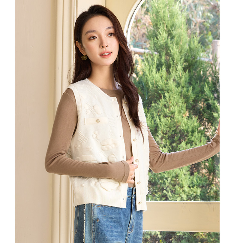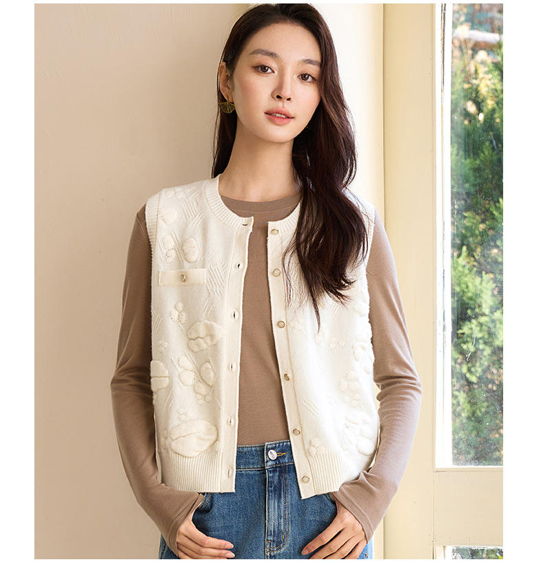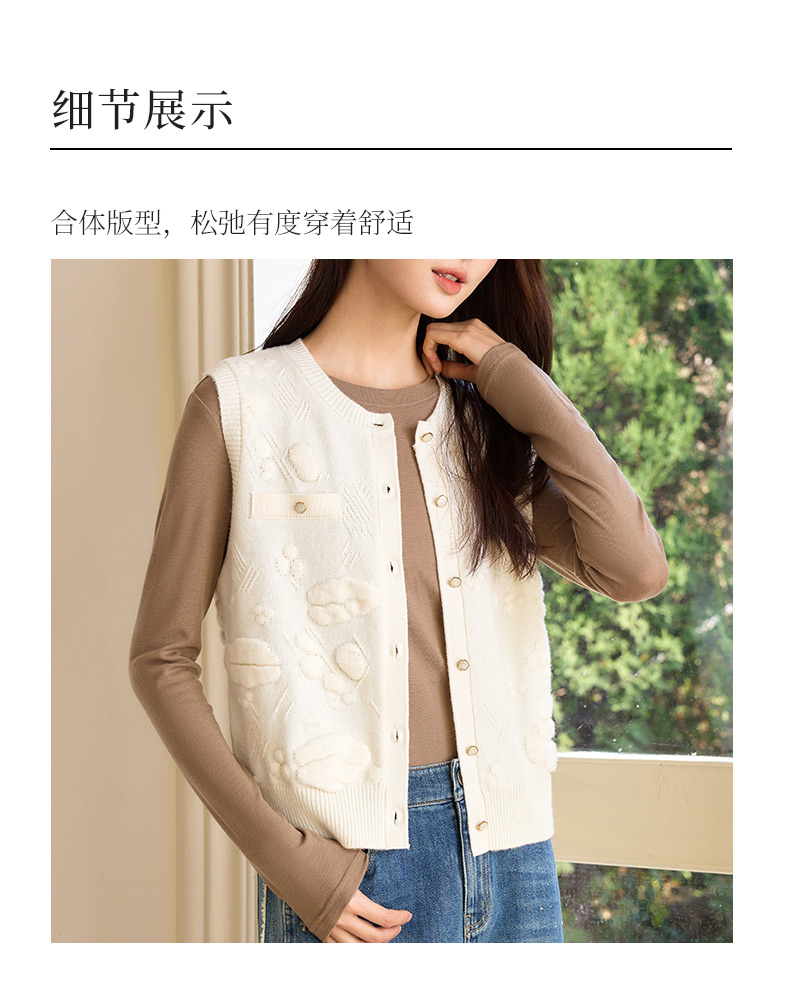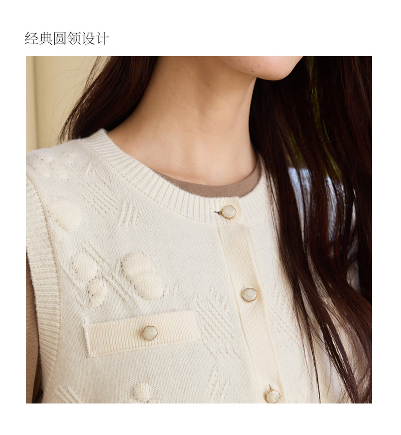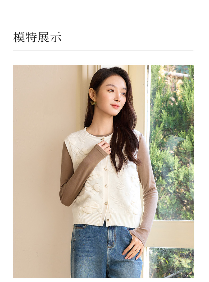 玳莎提花圆领针织马甲女2025年早春新款100%羊毛圆领马夹内搭上衣 FA33001