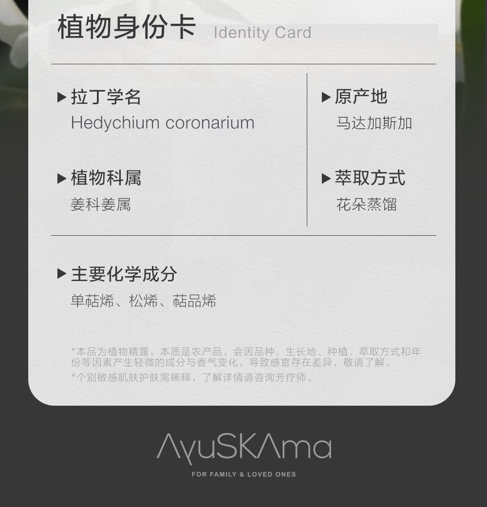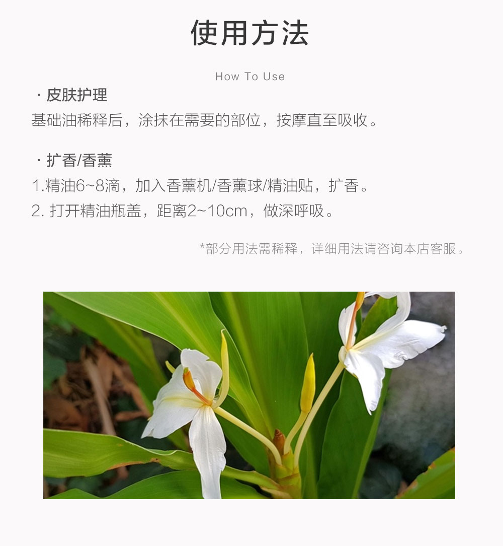精油的用法实在太多,大家可以下拉到最后看看,实在拿不准就来问问客服。还是要提醒提醒大家,野姜花是纯精油,必须用纯植物油稀释后才能使用,建议面部浓度≤1%,身体≤3%。孕妇、2岁以下婴幼儿以及特殊体质者,必须先咨询专业人士,同时要避免宠物长时间接触。首次使用前,记得在手腕内侧做敏感测试,观察24小时无红肿反应后再继续。