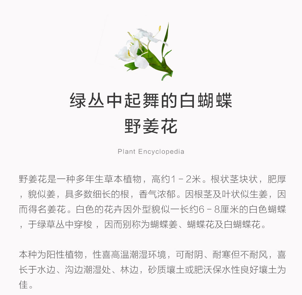 野姜花Hedychium coronarium,它是姜科姜属的多年生草本植物,通过花朵蒸馏的方式萃取出精油,完美融合了75%的姜的辛辣感与25%的淡花香,既保留了姜科植物的温暖底色,又裹挟着鲜花般的灵动气息。香气很有层次,整体前调是洗净衣物般的清新皂感,中调交织着淡雅花香与微辛绿意,仿佛雨后森林的第一口呼吸,后调则沉淀为温暖的植物木质调,成为复方精油中不可或缺的中调桥梁,与薰衣草的明快头调、广藿香的沉稳尾调相得益彰。