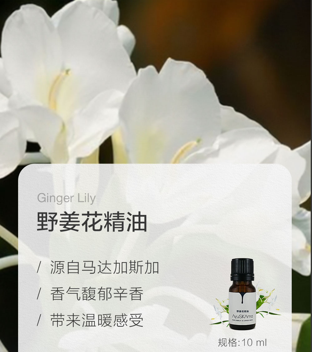 而野姜花精油的魅力,在于它能同时安抚情绪与调理身体的双重能量。高压迷茫时,其清冽香气能驱散焦虑乌云;精神疲惫时,又能唤醒沉睡的活力,改善神经衰弱;夜晚扩香,更能化作无形的安抚,助你坠入梦乡。生理调理上,野姜花精油的功效同样令人惊喜。单萜烯成分是呼吸系统的贴心卫士,蒸汽吸入能缓解鼻塞多痰,让呼吸重回顺畅;对女性而言,能温暖子宫,缓解经期不适,产后护理还能帮助消除血块;稀释后按摩肩颈腰部,温和的热力能舒缓肌肉僵硬,比生姜精油更温柔。就连肌肤与毛发也能从中受益。温和去除老化角质,泡澡后焕发红润光泽;加入洗发水或基底油按摩头皮,还能预防脱发、减少头皮屑,由内而外唤醒身心活力。