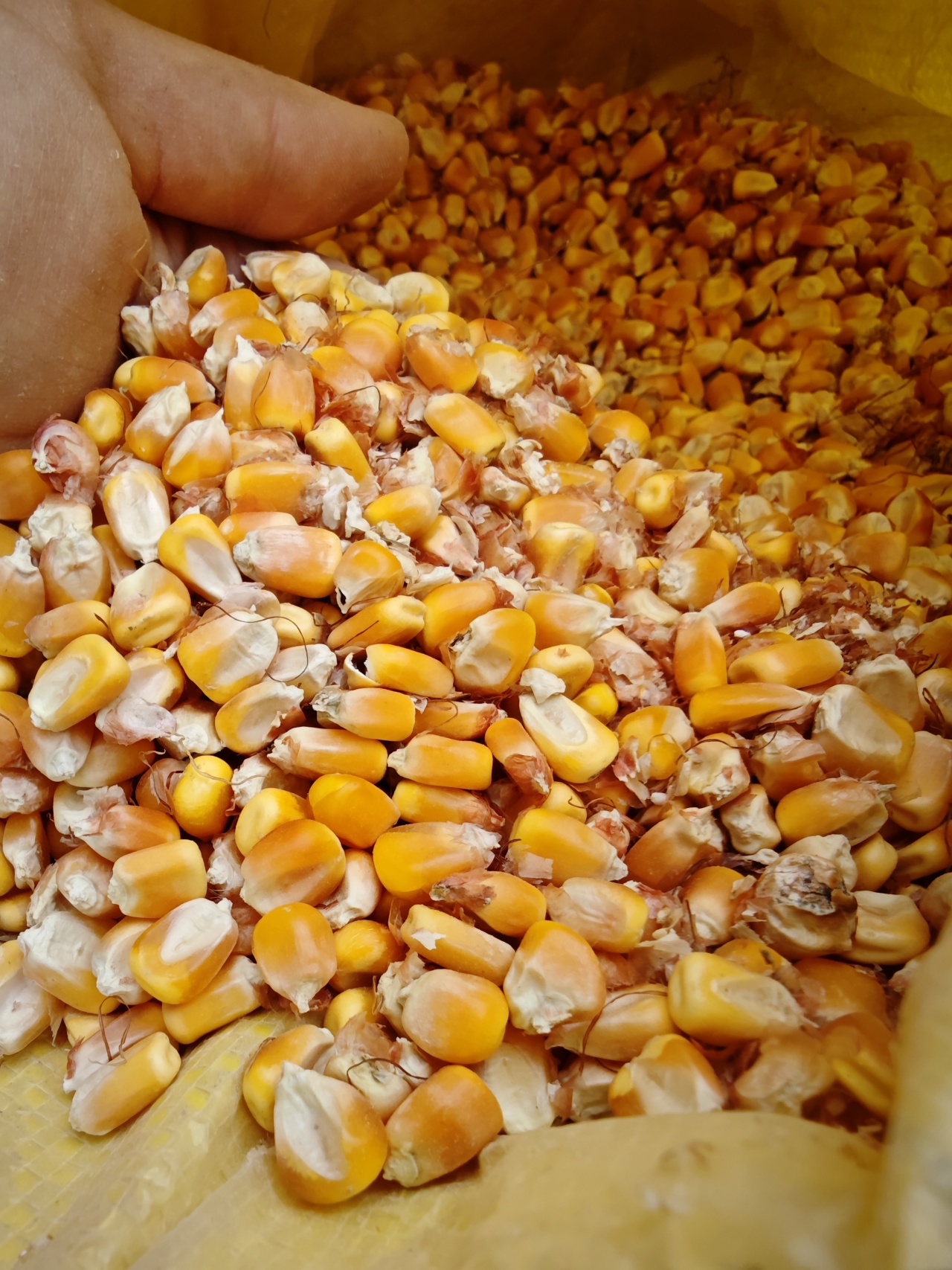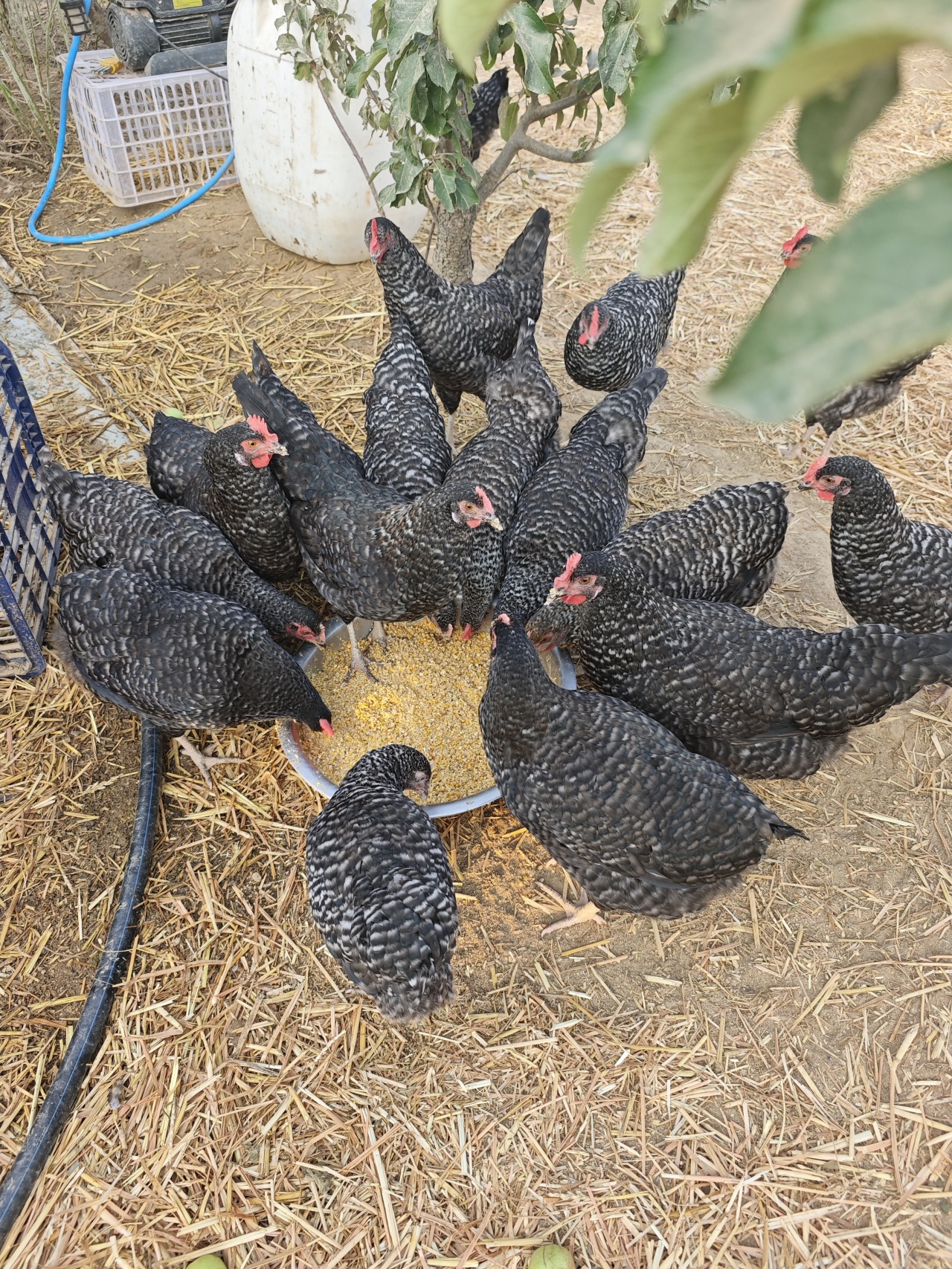 鸡饲料:用自己家种植的玉米、谷物、麸皮、豆油饼(农场种植豆子,在小作坊那加工豆饼,主要是菜籽油饼和芝麻油饼),混合打碎,自配饲料,平时喂一些自家地里的杂草、蔬菜、水果皮等。