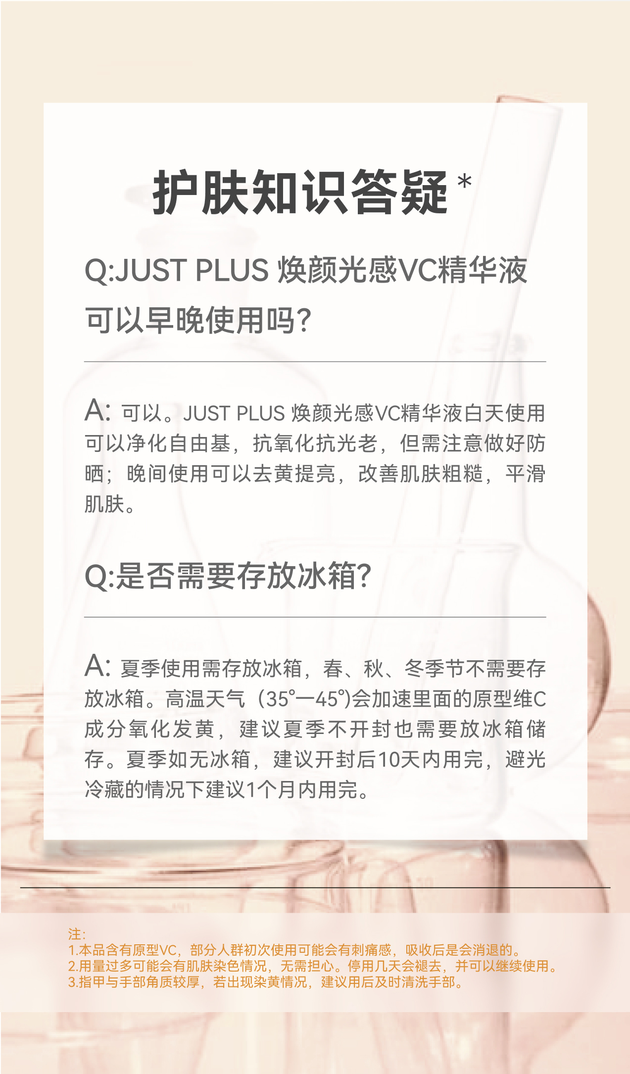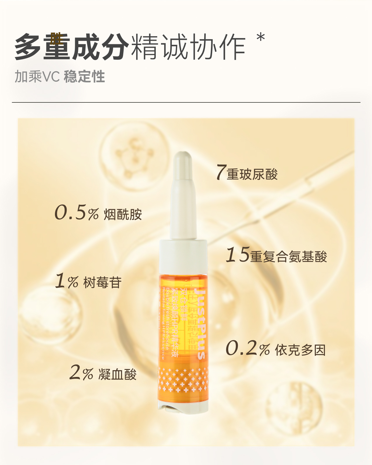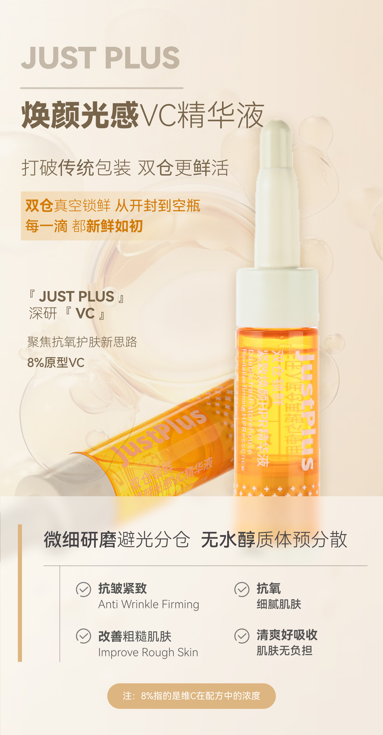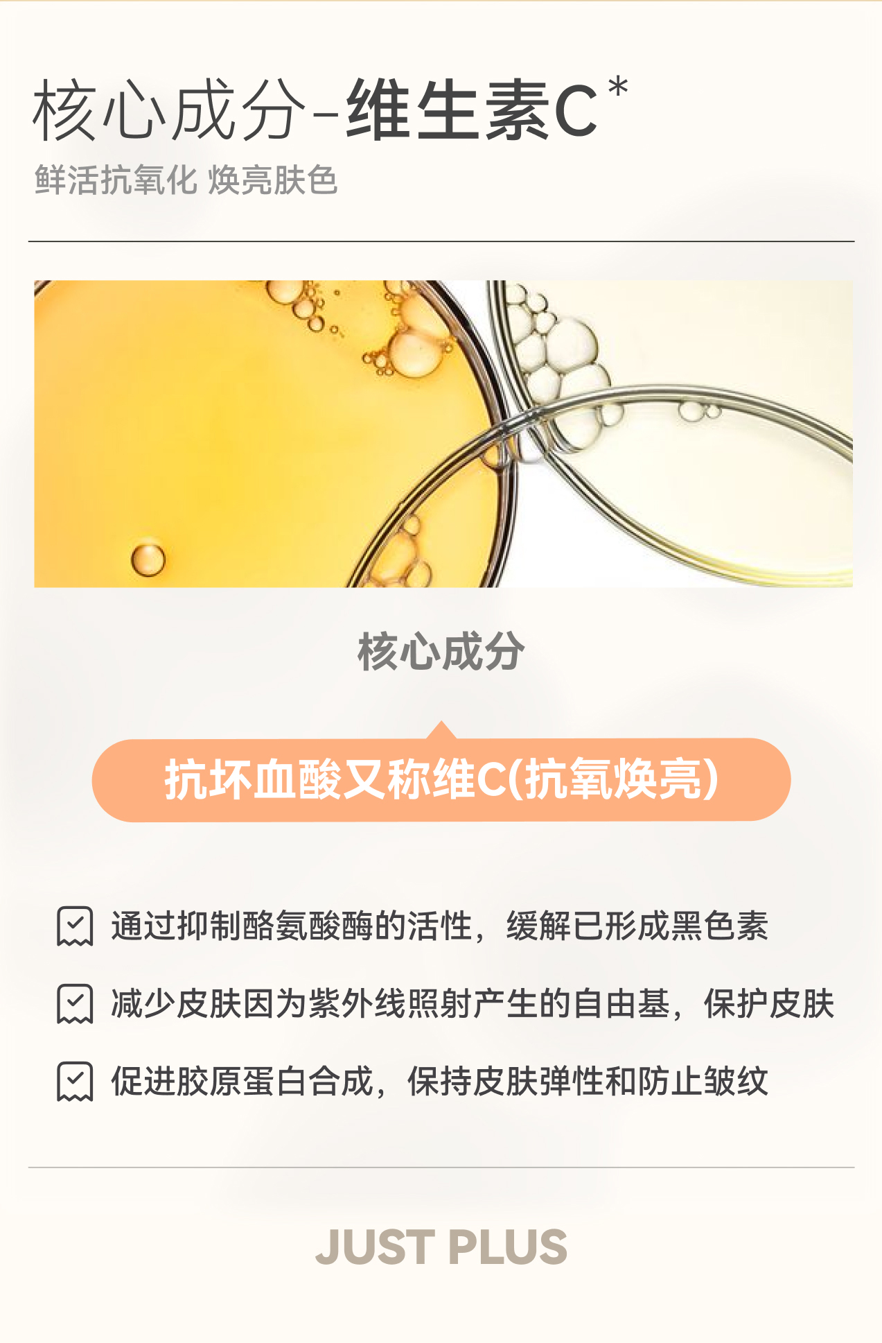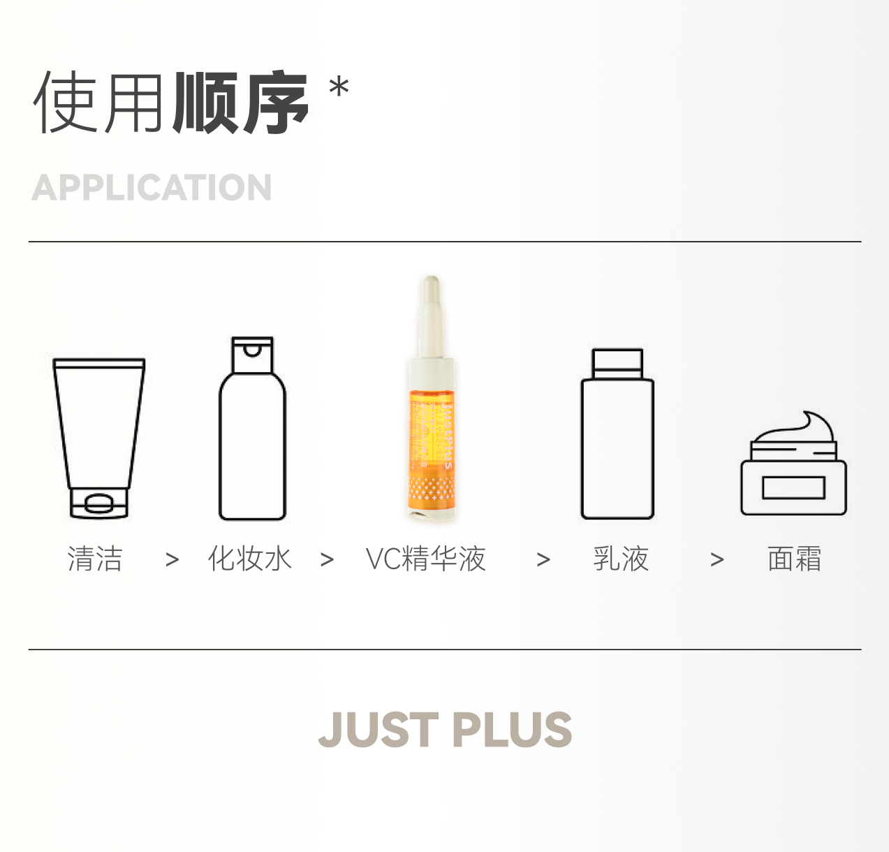 【JUST PLUS美白VC精华】创新双仓锁鲜技术 减少自然氧化 肤感优化,清爽不油腻 吸收快 采用8%原型VC和多种美白成分协同 帮助改善肤色暗沉、焕亮美白、淡化斑点、痘印等 一盒10ml*4支