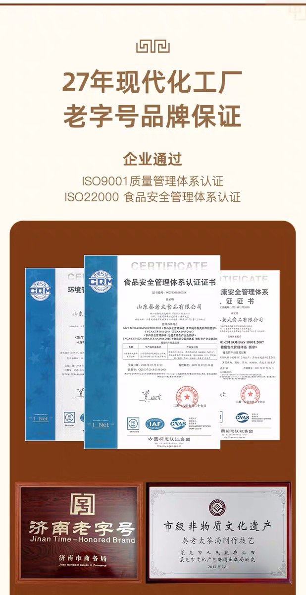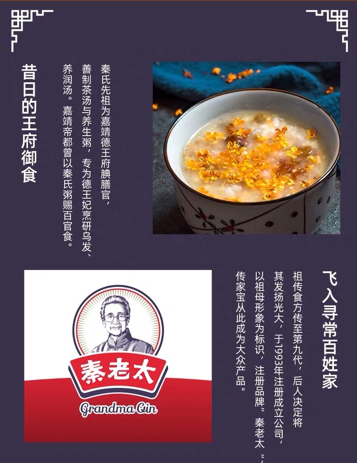 - 秦老太创始于1993年,专注谷物轻食餐。秦老太茶汤,2012年被正式授予非物质文化遗产。进入新时代,秦老太人怀揣匠心精神,以 “为家人制造食品”为理念,传承中华食养文化!