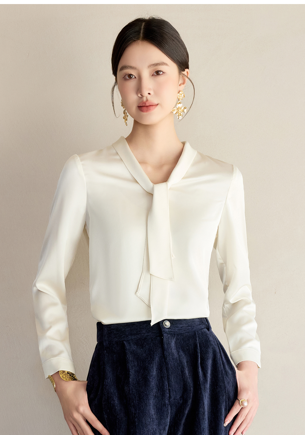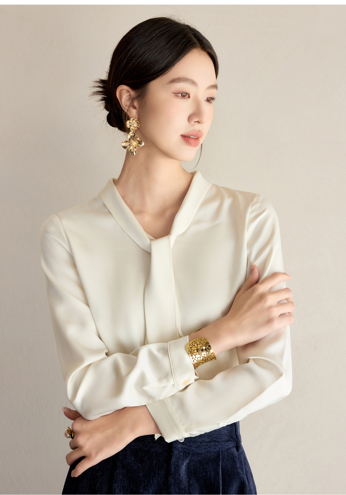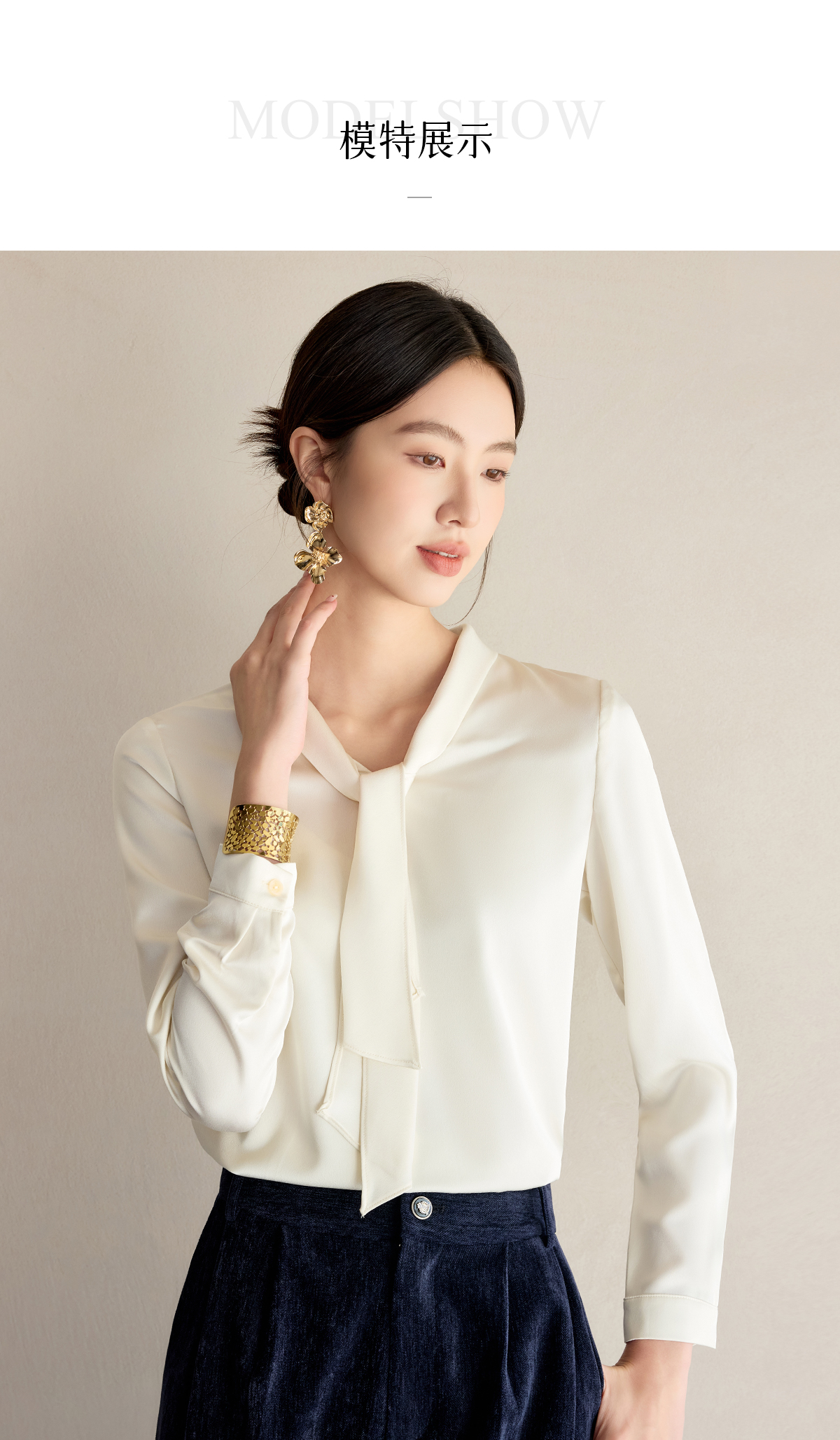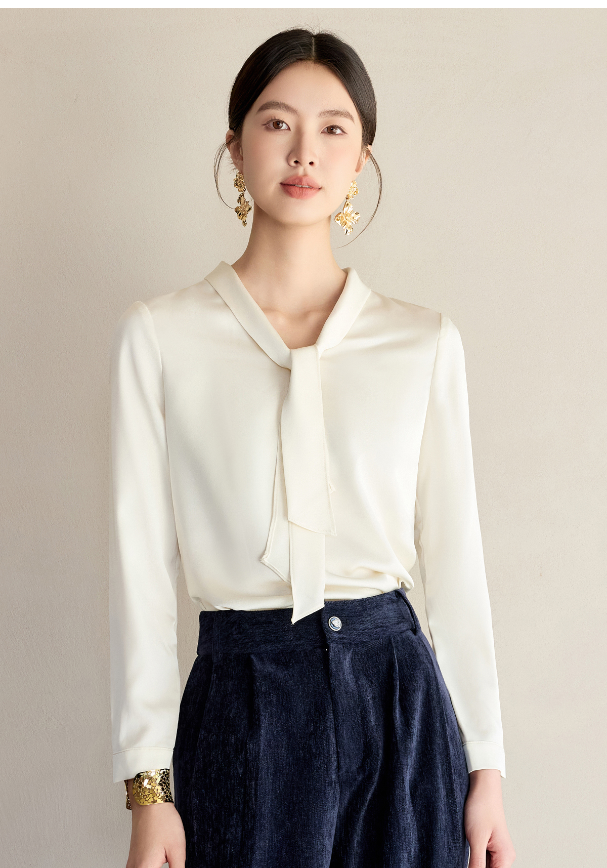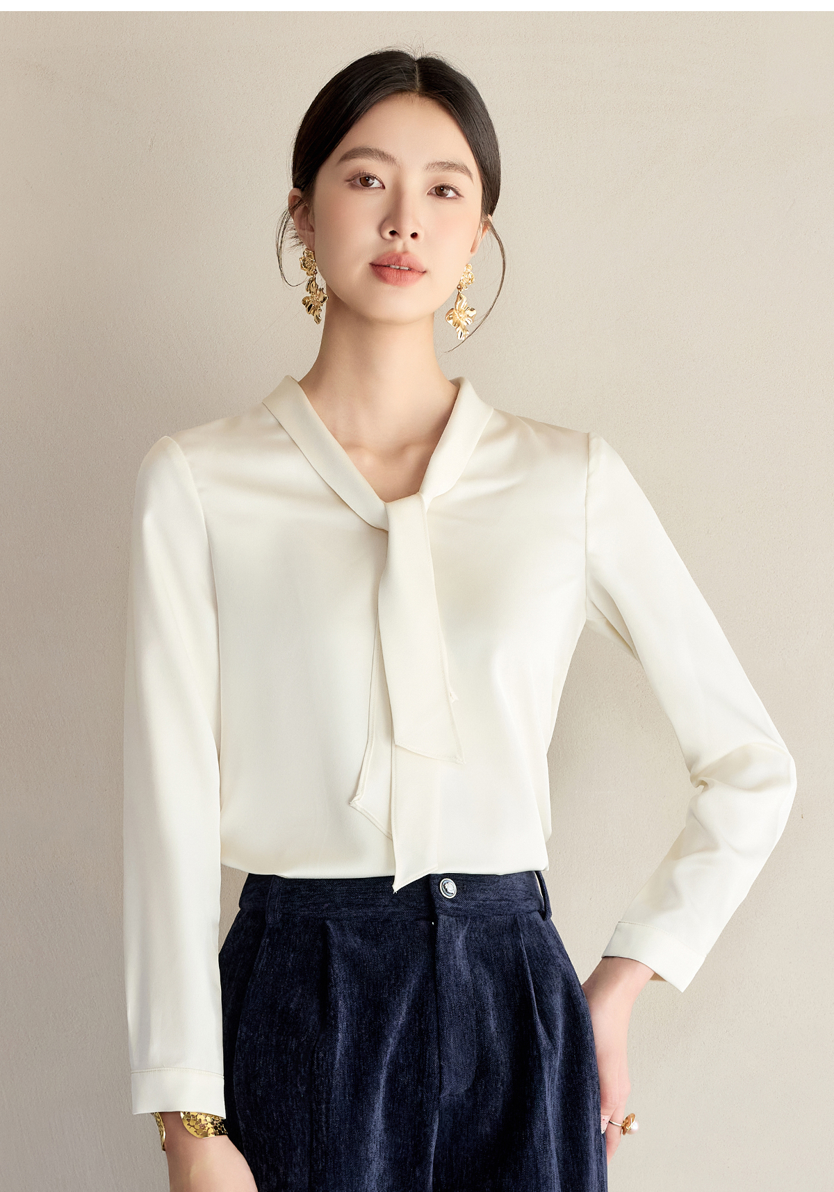 艾尚臣通勤杏色衬衣设计感小众法式小衫飘带衬衫女长袖面试上衣春