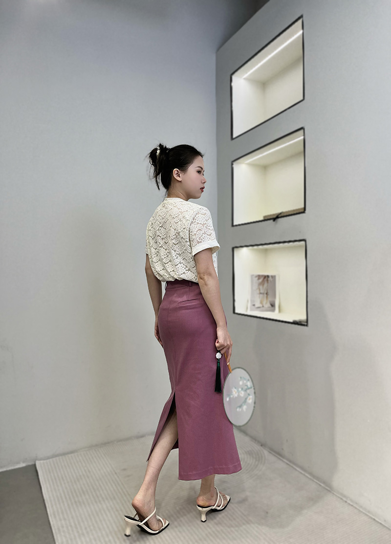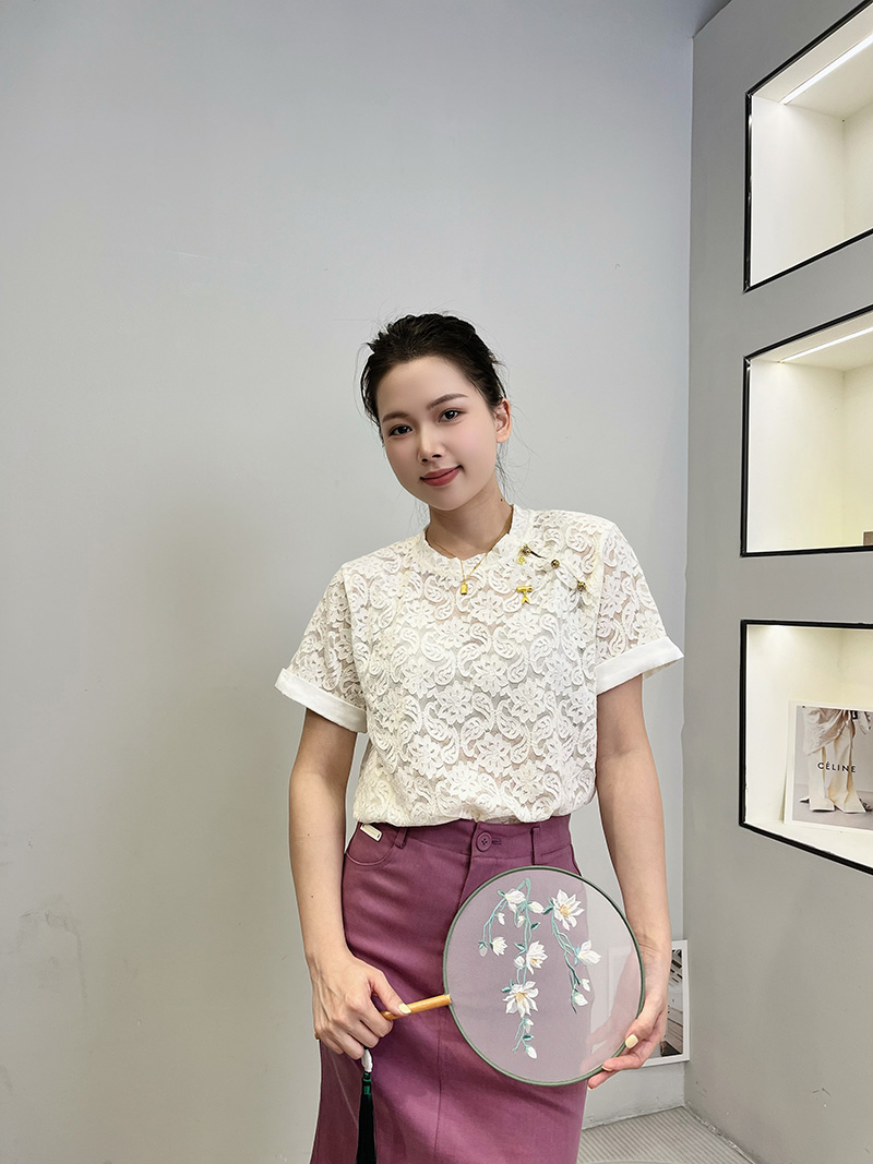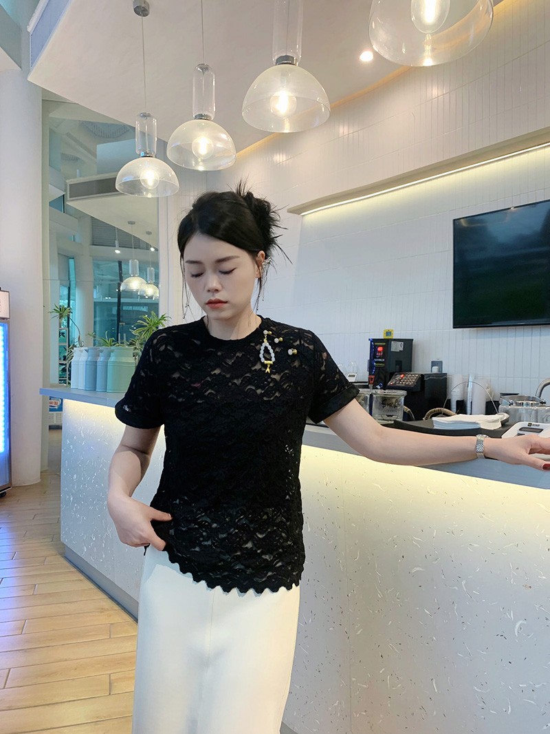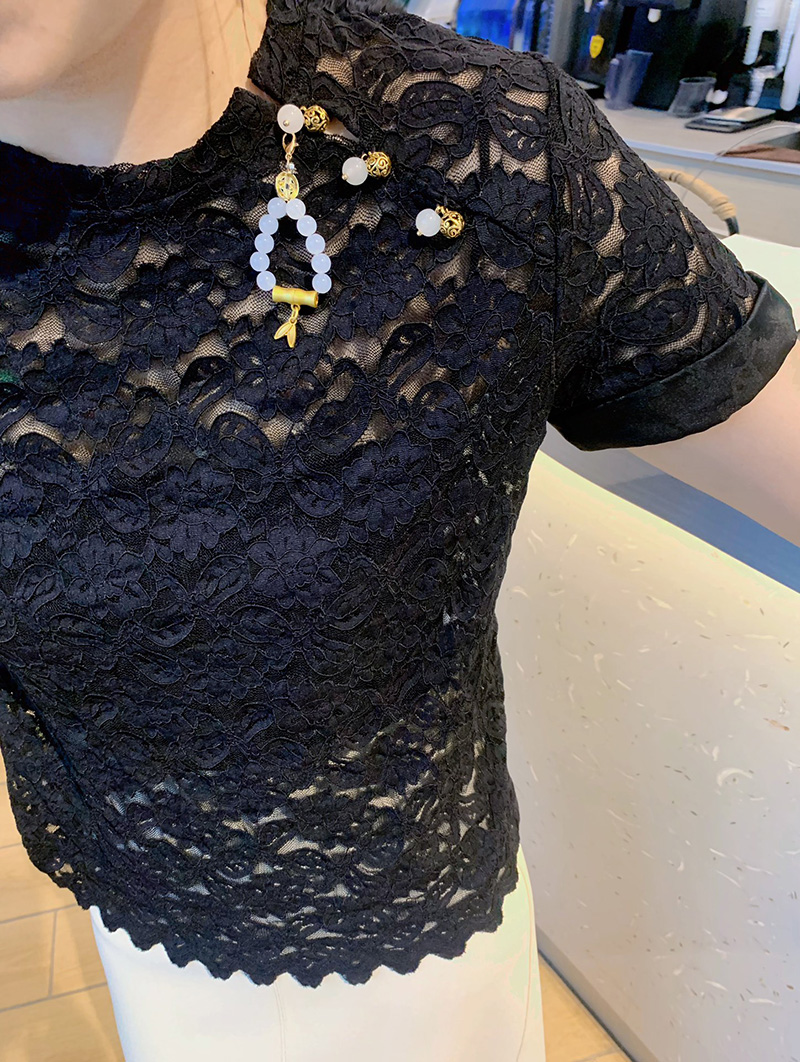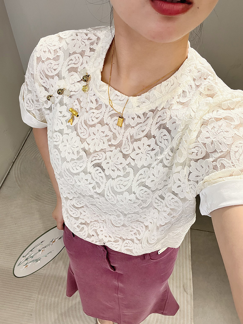 圆领装饰订珠蕾丝花短袖衫 3522040012
