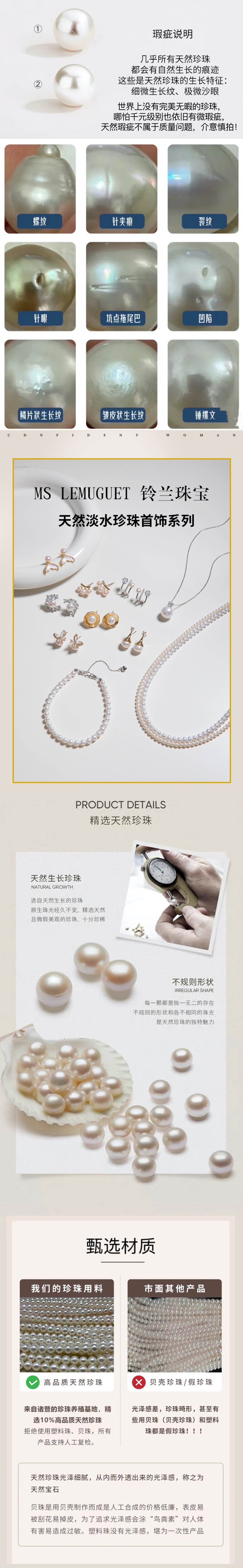 天然淡水珍珠属于自然生长的珍珠即便是千元万元的产品也不可避免会有生长纹、斑点、螺纹等小瑕疵,请和产品价值对等看待,没有完美无瑕的珍珠,除非人造珍珠;