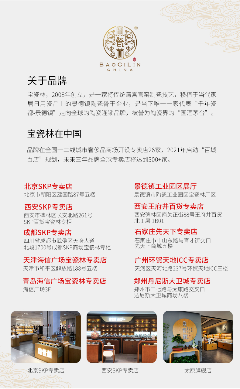 - 宝瓷林,2008年创立,是一家将传统清宫官窑制瓷技艺,移植于当代家居日用瓷品上的景德镇陶瓷骨干企业,是当下唯一一家代表“千年瓷都-景德镇”走向全球的陶瓷连锁品牌,被誉为陶瓷界的“国酒茅台”。