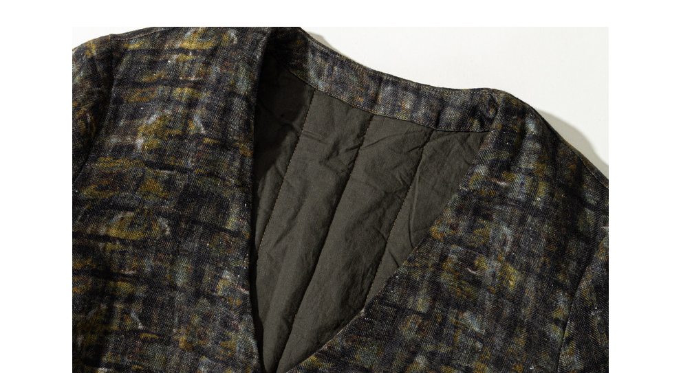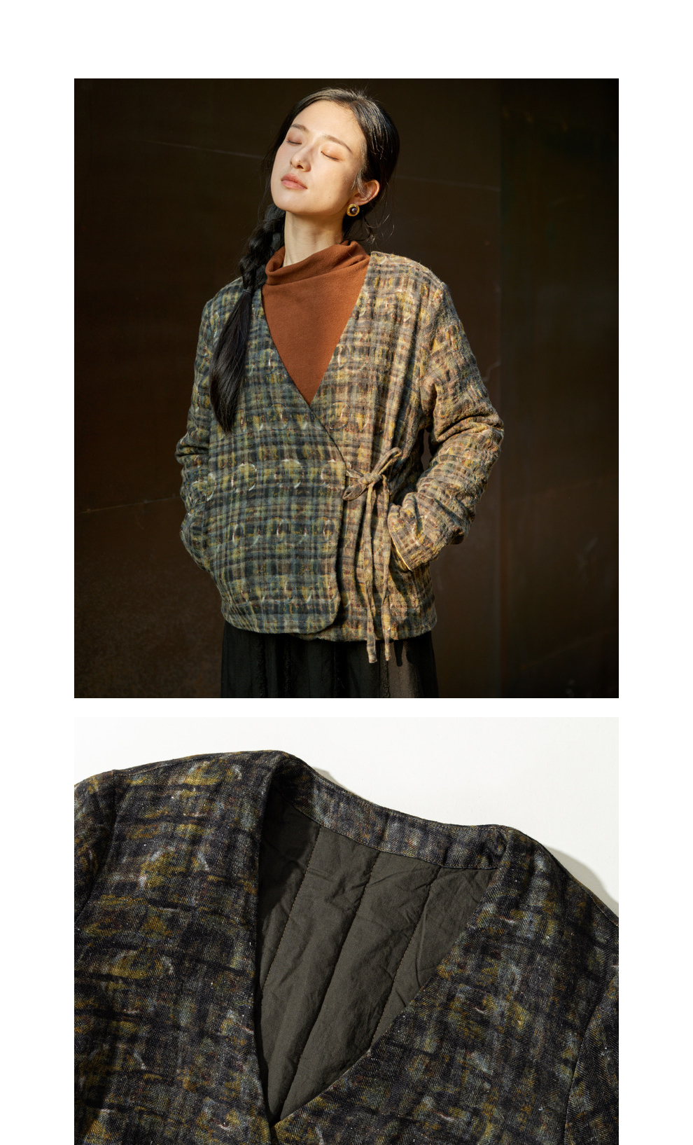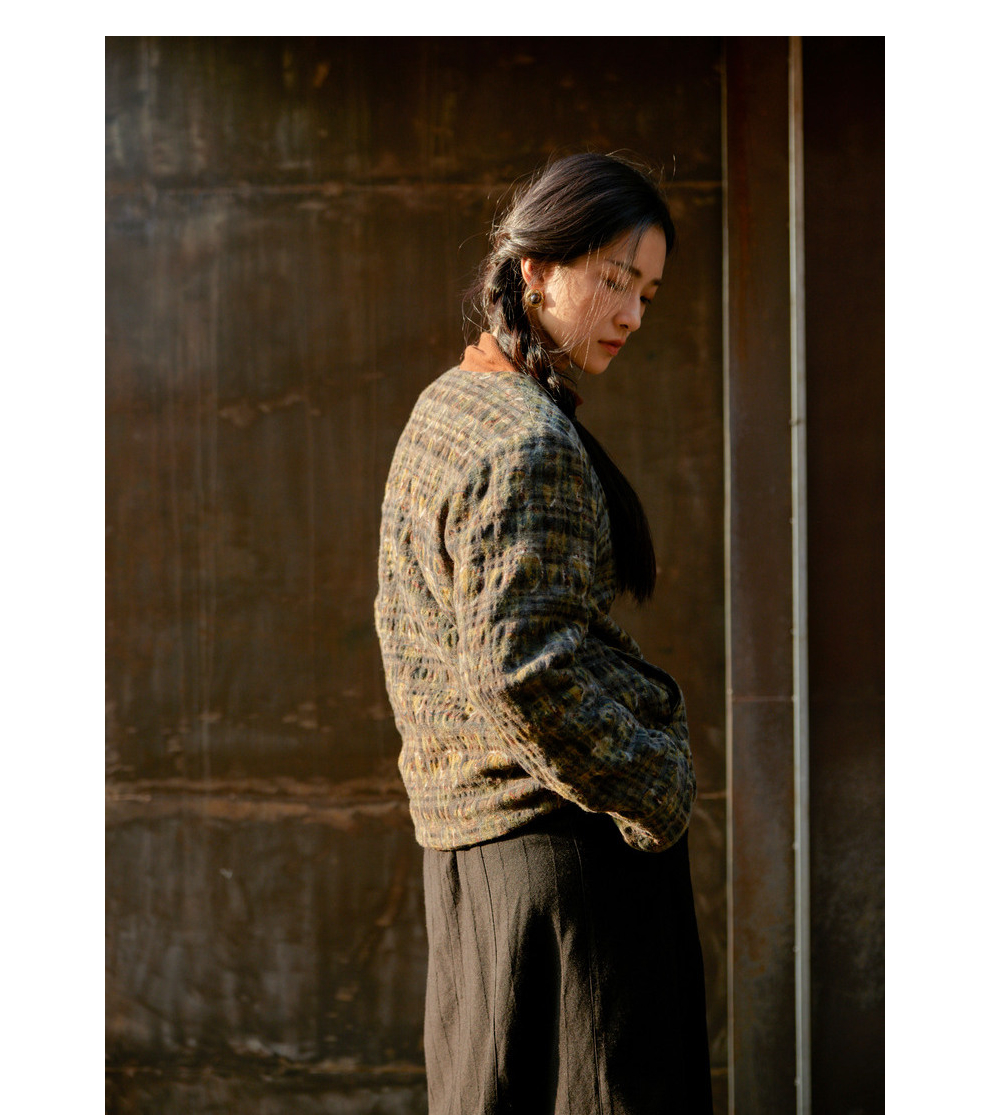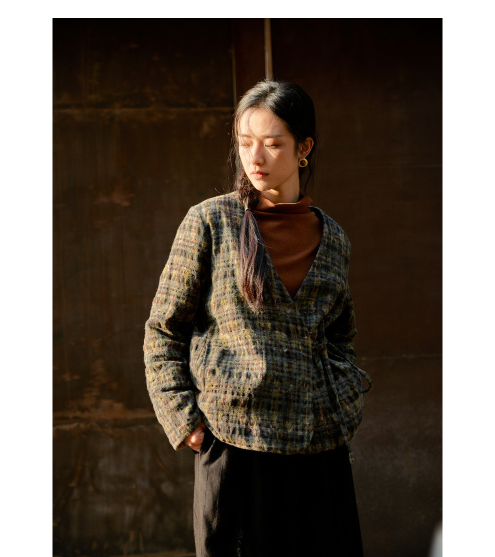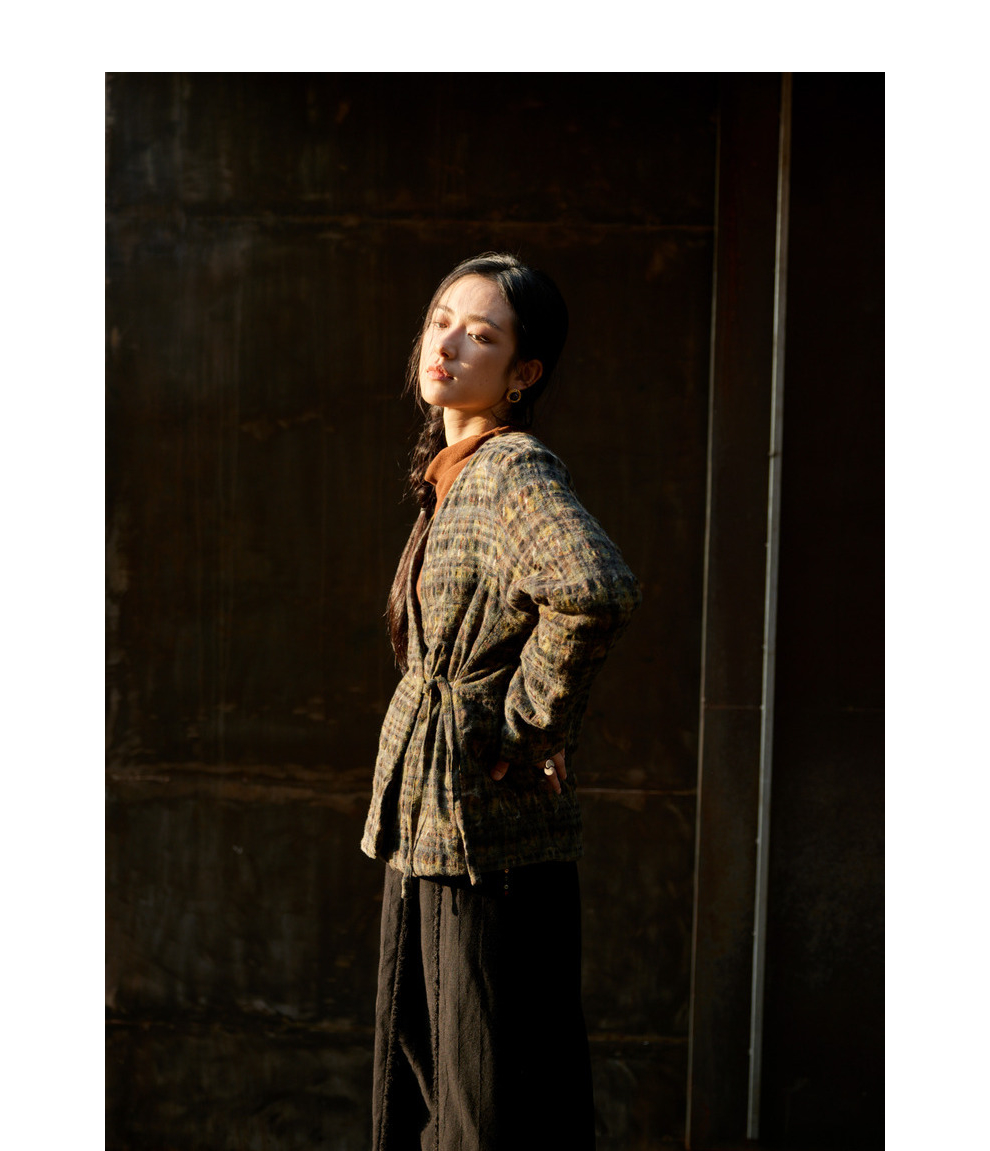 绽放850/【IP兰州系列】人字纹亚麻真丝拼接斜开襟新中式棉服棉衣