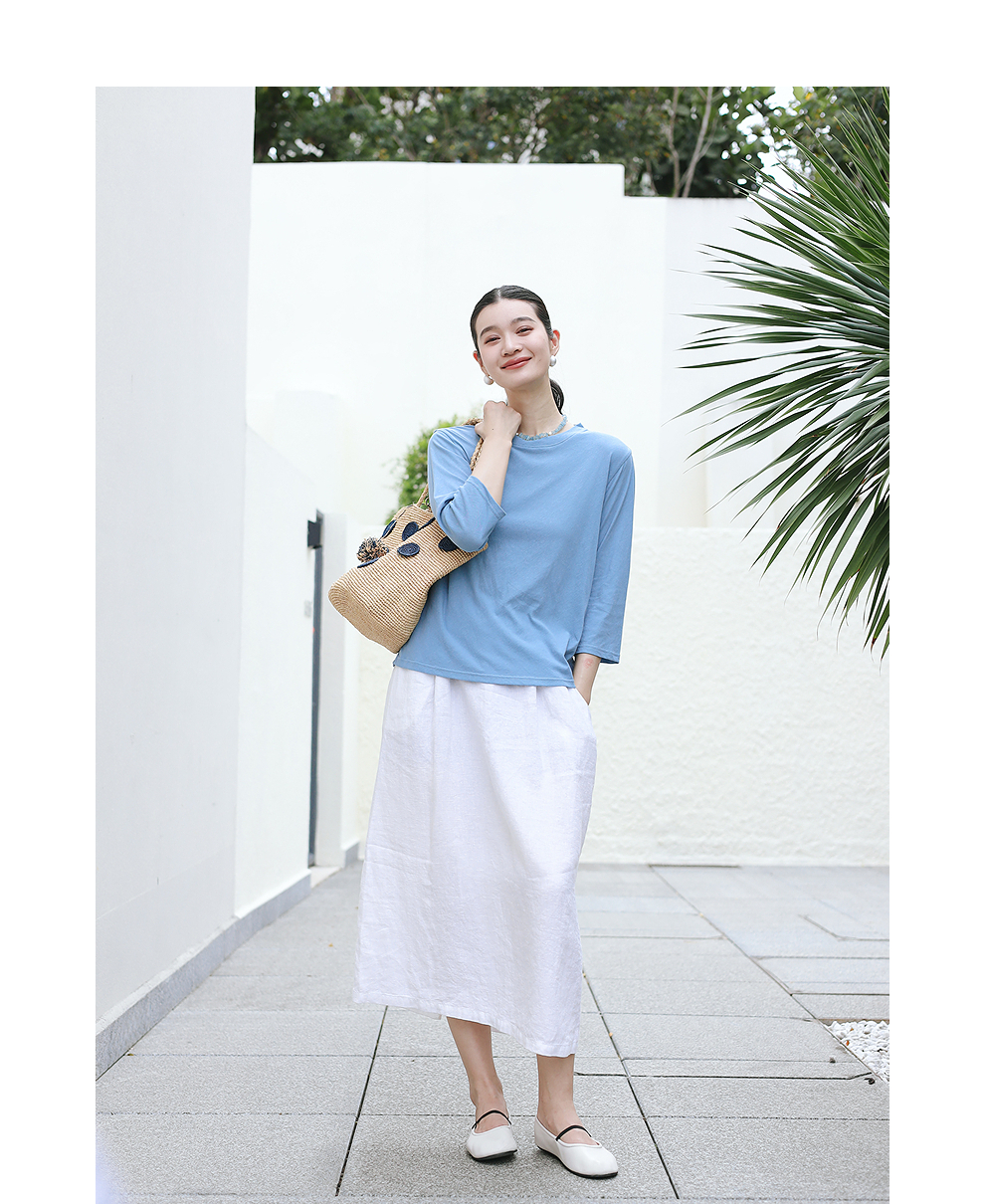 绽放旅行女装207朵/QQ糖T恤棉高支薄小圆领落肩七分袖百搭上衣