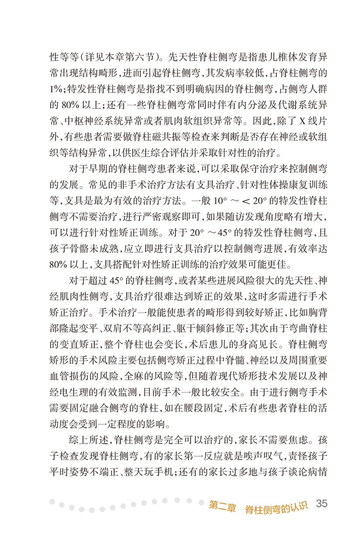 本书在编写筹备过程中,参考了目前已经出版的相关著作和国外不同医院的脊柱侧弯科普宣传手册。脊柱侧弯的治疗并不单纯是脊柱科医师的工作,同时需要不同学科,包括脊柱科、康复科、麻醉科、儿童呼吸科、放射科、支具矫形、公益慈善等方面的共同合作。因此我们邀请以上领域的专家,全面更新了脊柱侧弯在各个领域的知识,形成基于最新证据的科普内容;另外还加入脊柱侧弯患者的典型案例,帮助患者重拾回归正常生活的信心,同时加入先天性脊柱侧弯规范诊疗步骤、特发性脊柱侧弯规范诊疗步骤,形成全面、实用、适用的科普读物。