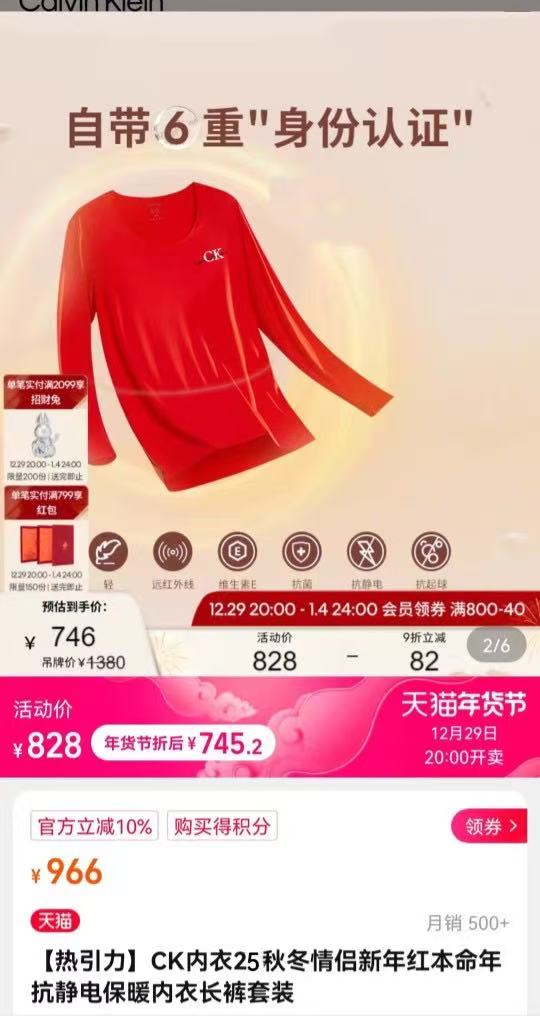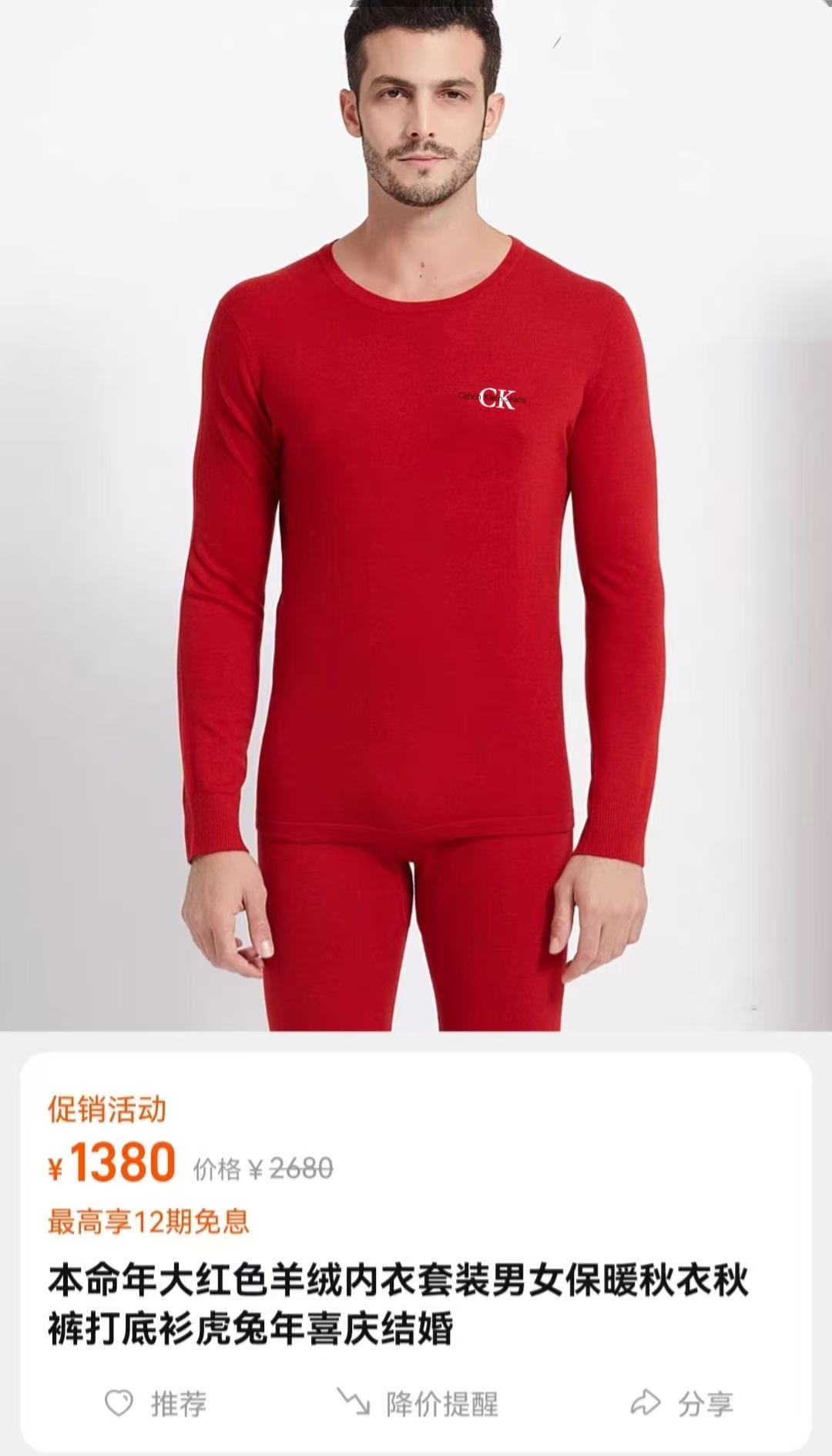 新年鸿运款【限定情侣本命年红保暖内衣套装】情侣款&男女款同步上线,不止本命年要冲的红运战袍!精选绵羊毛+蚕丝加绒面料,内里蚕丝加持,轻薄如云朵却自带发热力,秋冬打底不臃肿、保暖不压身~ 吸湿排汗超能打,全天亲肤无束缚,弹力巨能拉,显瘦贴合不勒肉!胸前精典热印logo,质感拉满堪称轻she级保暖,红色象征鸿运当头、好运连连,是新年喜庆氛围组,更是四季保暖刚需款!超值秒杀价闭眼入!穿红迎福,让一整年都自带好彩头,情侣同穿更显甜蜜,千万别错过这场红运福利~
