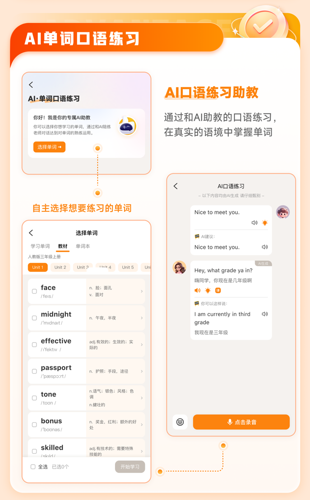 2、体验流程:开通权益后,下载【超会记单词APP】-使用下单号码登录APP-点击记单词-选择教材进行使用