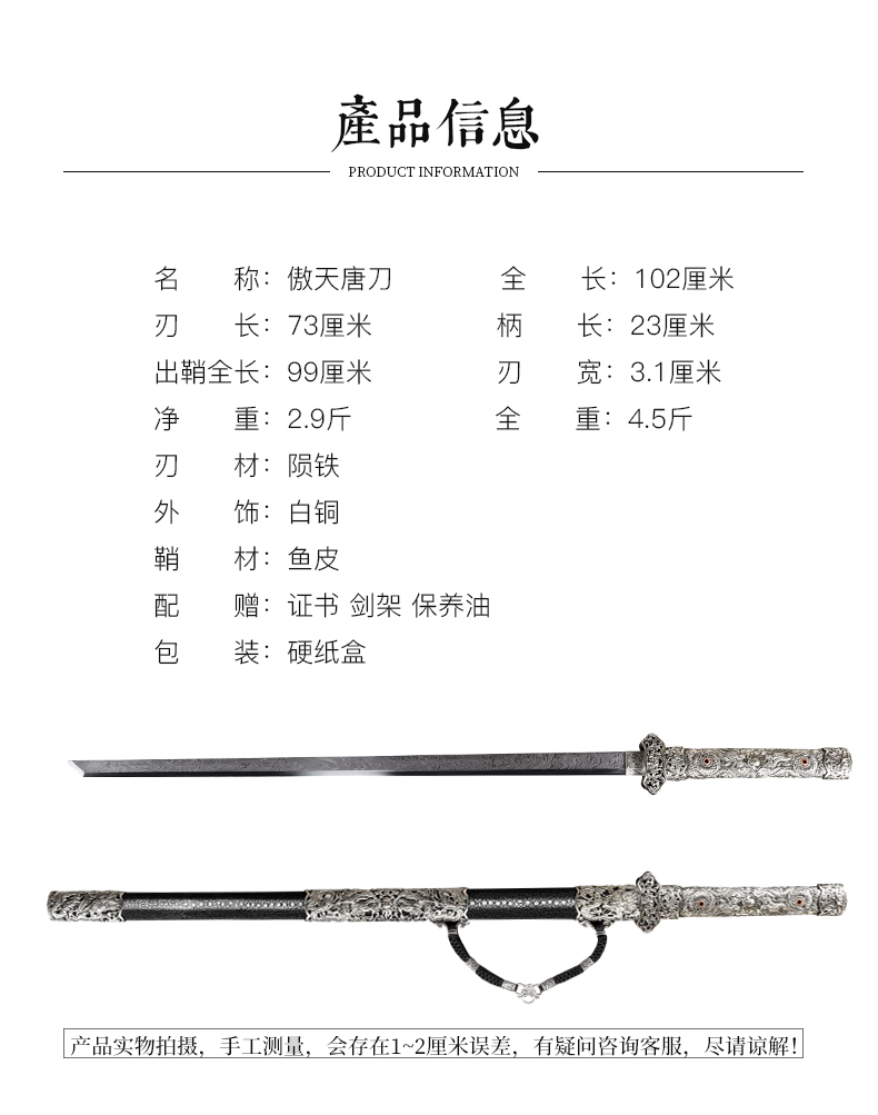 傲天唐刀 汉唐刀剑 龙泉沈广隆宝剑 一体刀剑传统宝剑 未开刃