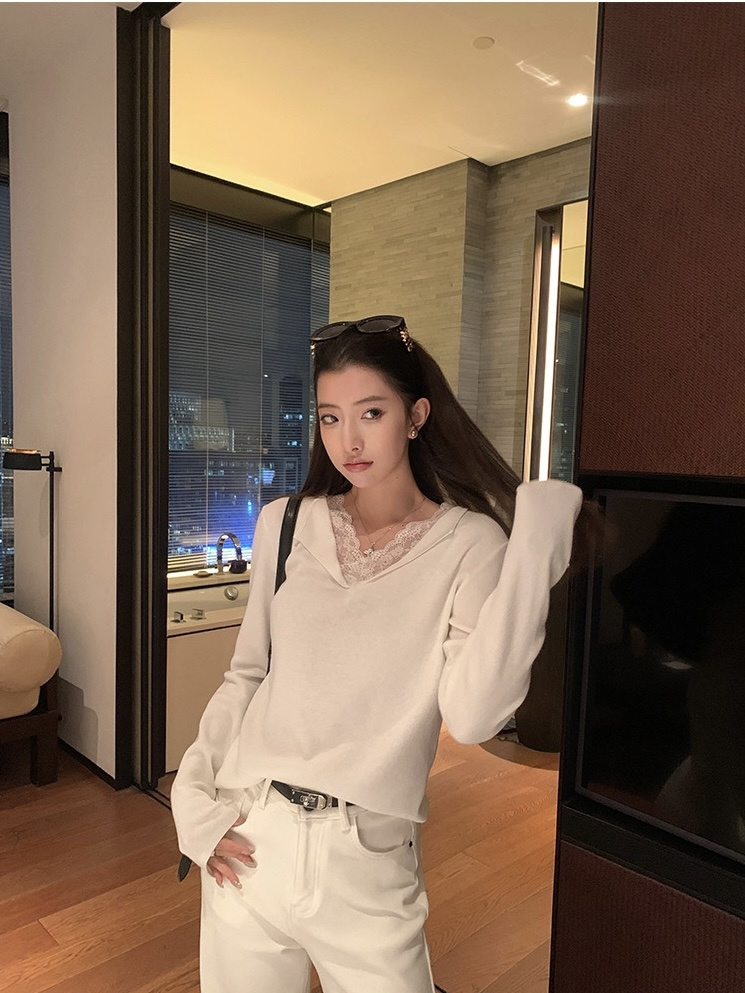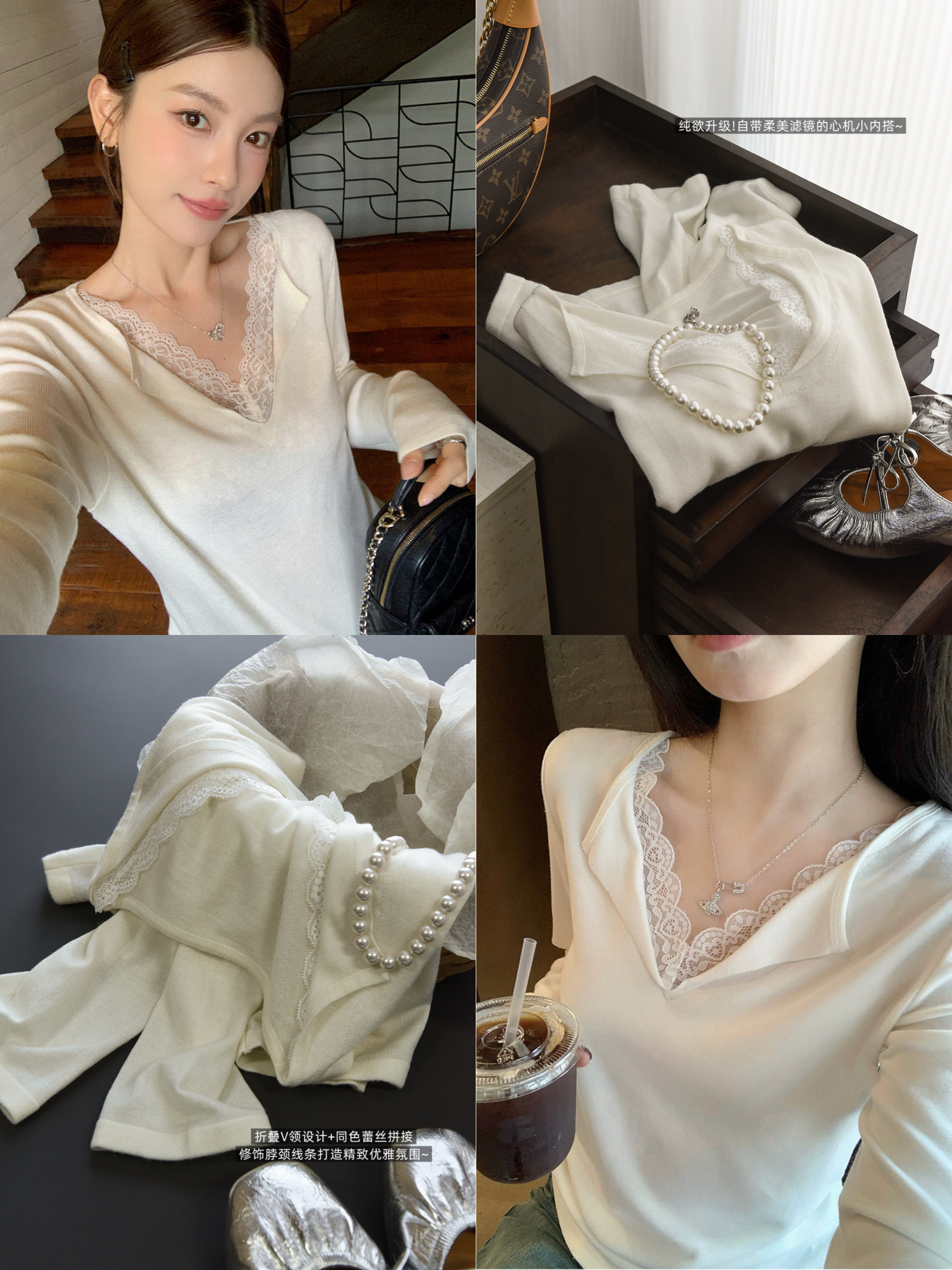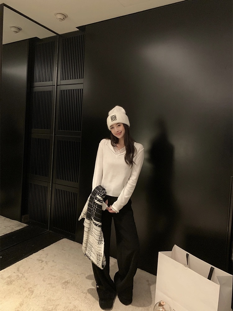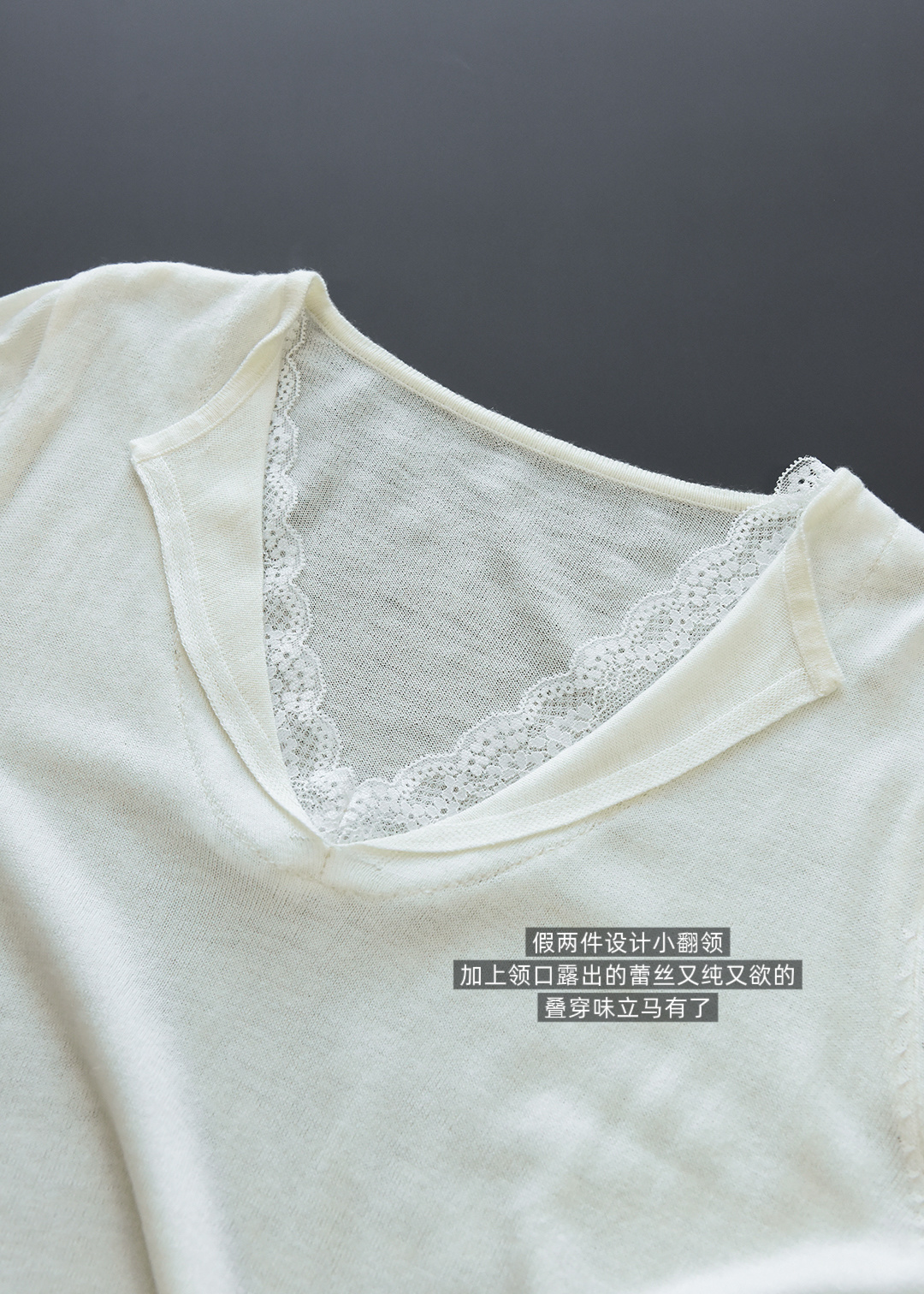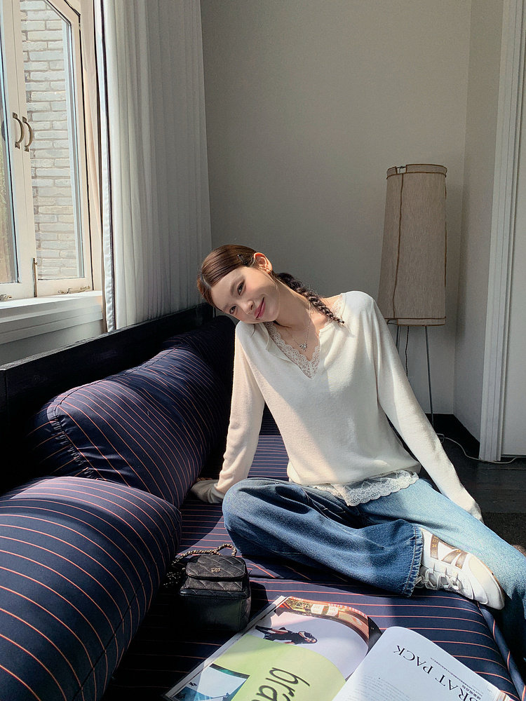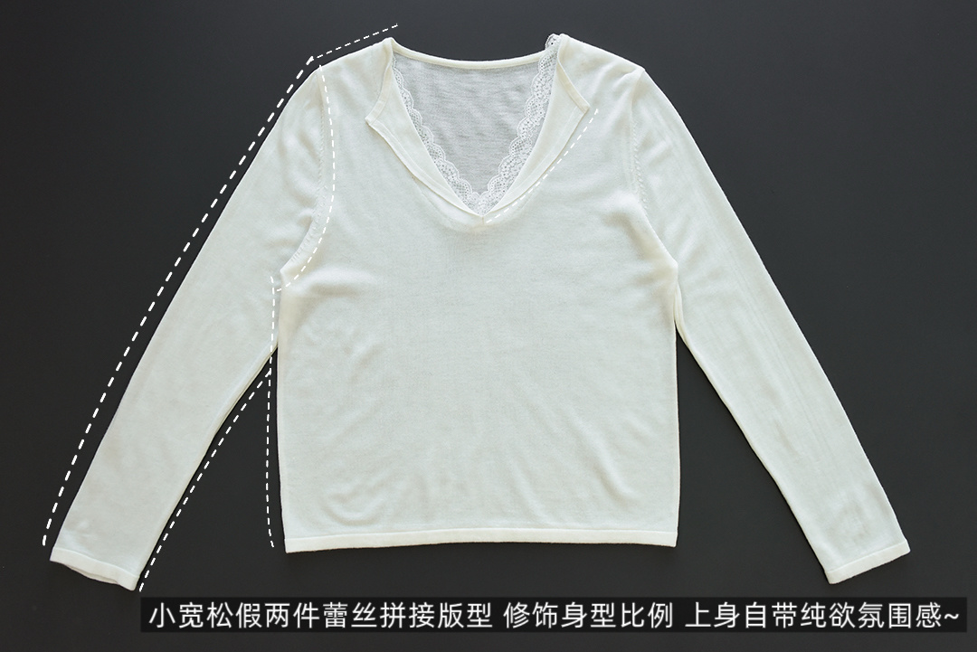 假两件小翻领加上领口露出的蕾丝拿捏纯欲比例,多一分柔美浪漫~超细羊毛混纱线,织面更紧实舒适柔软到不可思议~
