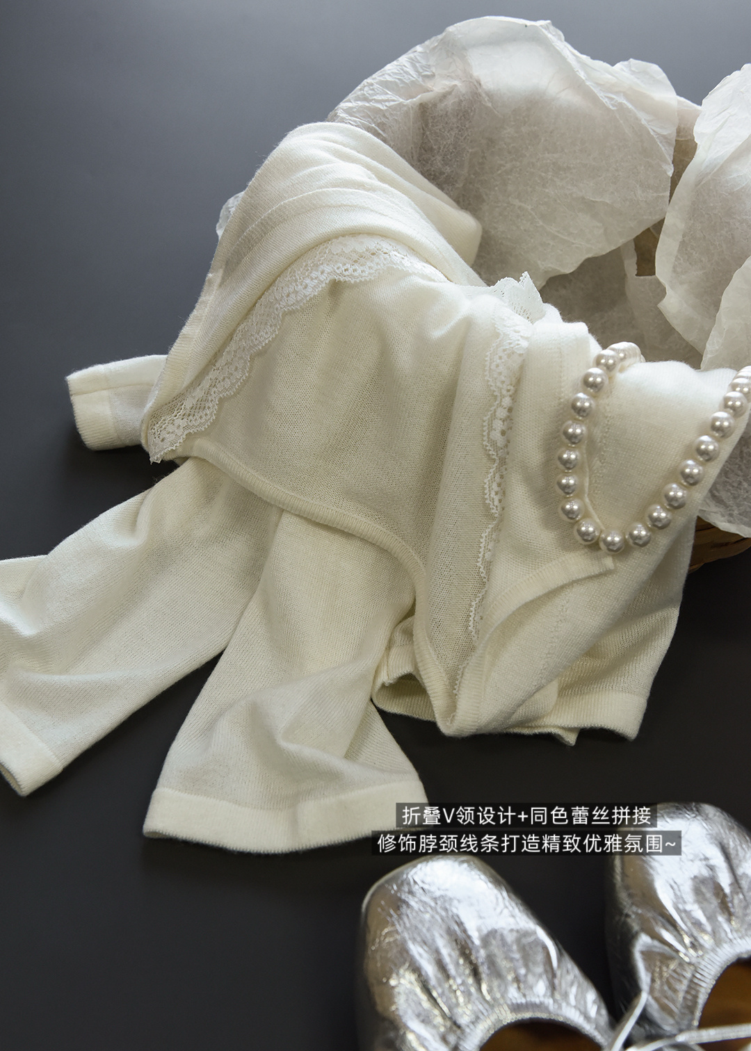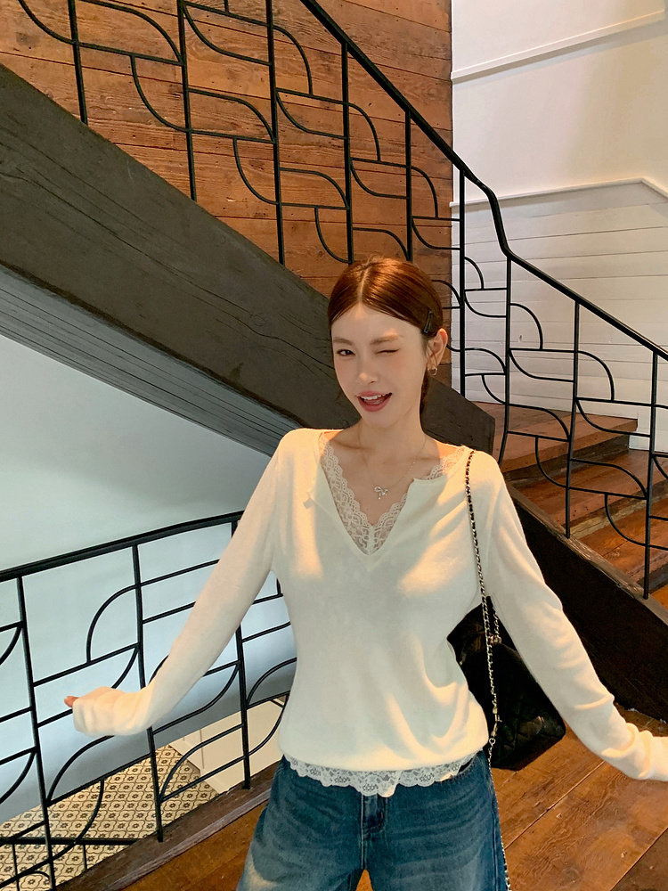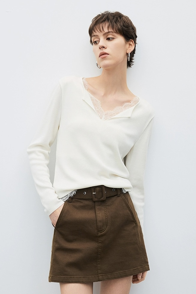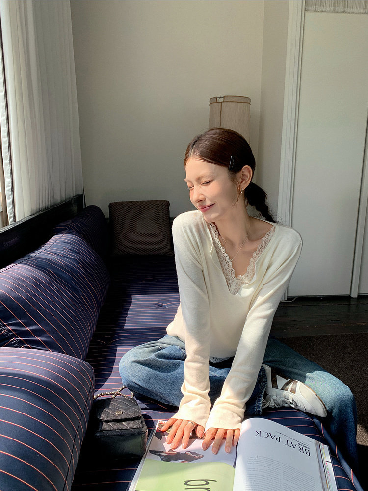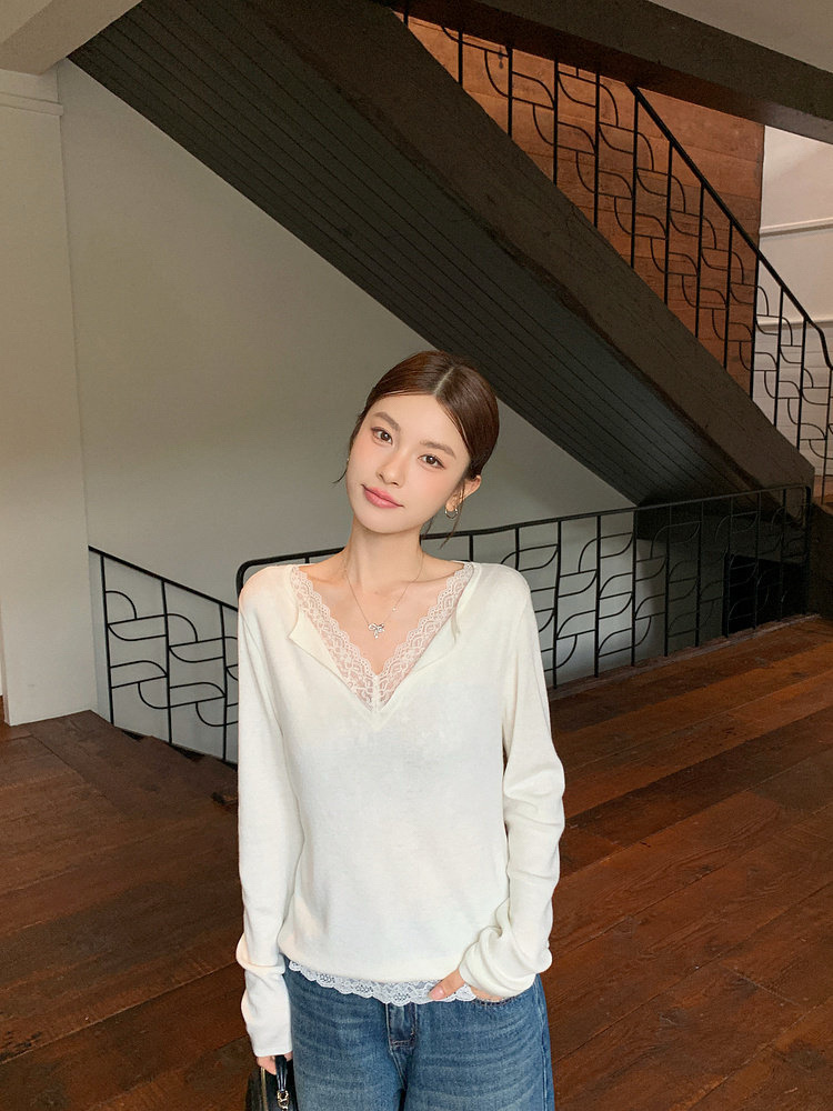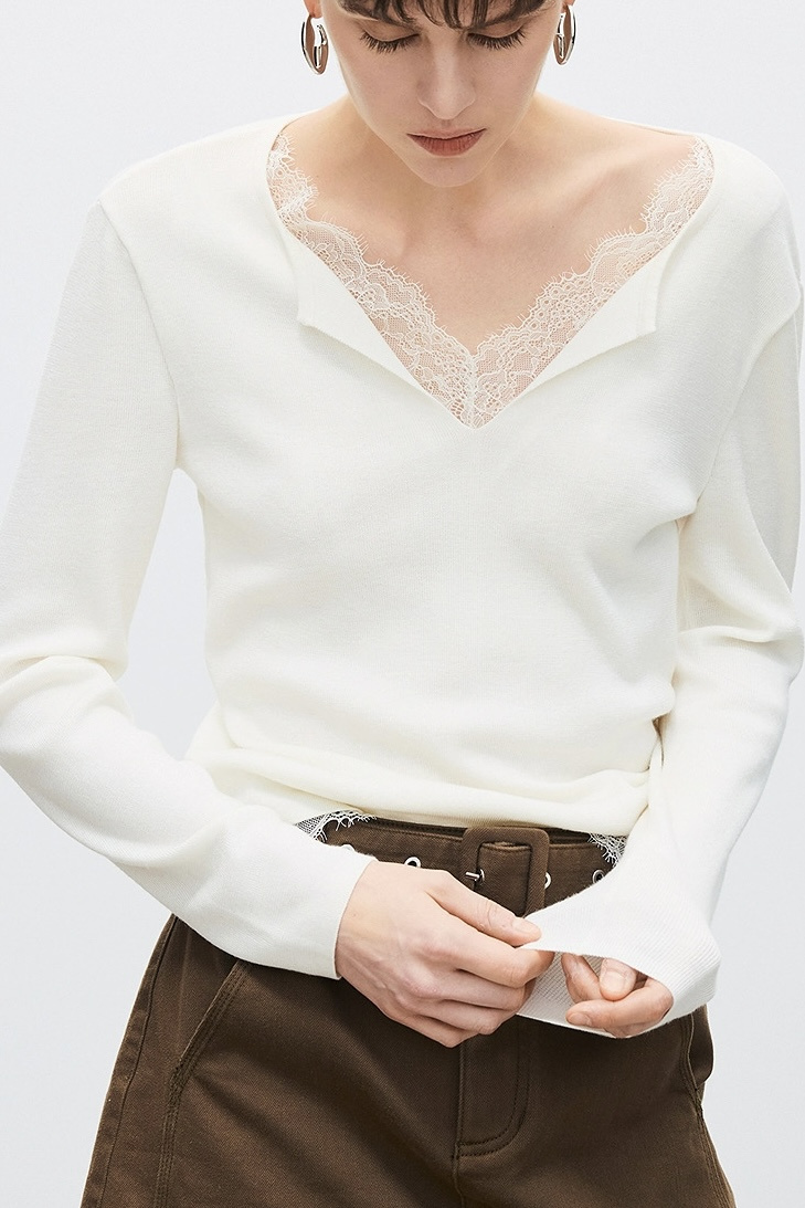 假两件小翻领加上领口露出的蕾丝拿捏纯欲比例,多一分柔美浪漫~超细羊毛混纱线,织面更紧实舒适柔软到不可思议~