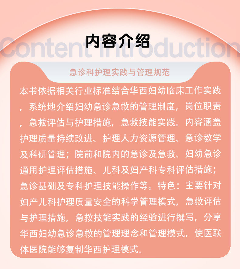 本书依据相关行业标准结合华西妇幼临床工作实践,系统地介绍妇幼急诊急救的管理制度,岗位职责,急救评估与护理措施,急救技能实践。内容涵盖护理质量持续改进、护理人力资源管理、急诊教学及科研管理;院前和院内的急诊及急救、妇幼急诊通用护理评估措施、儿科及妇产科专科评估措施;急诊基础及专科护理技能操作等。 特色:主要针对妇产儿科护理质量安全的科学管理模式,急救评估与护理措施,急救技能实践的经验进行撰写,分享华西妇幼急诊急救的管理理念和管理模式,使医联体医院能够复制华西护理模式。