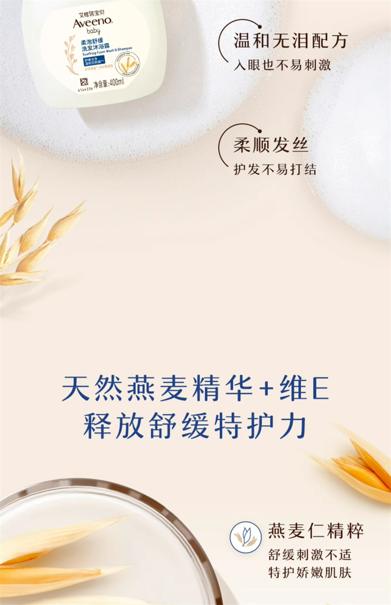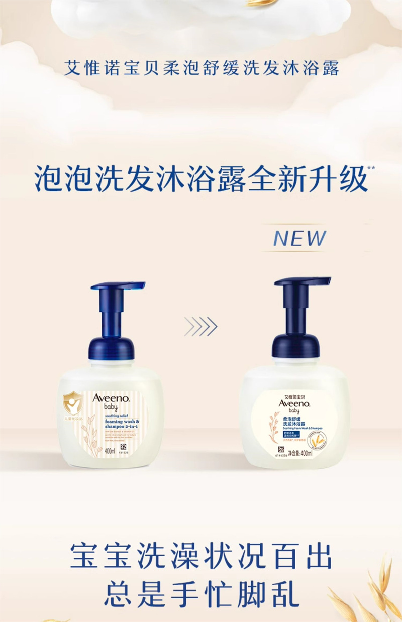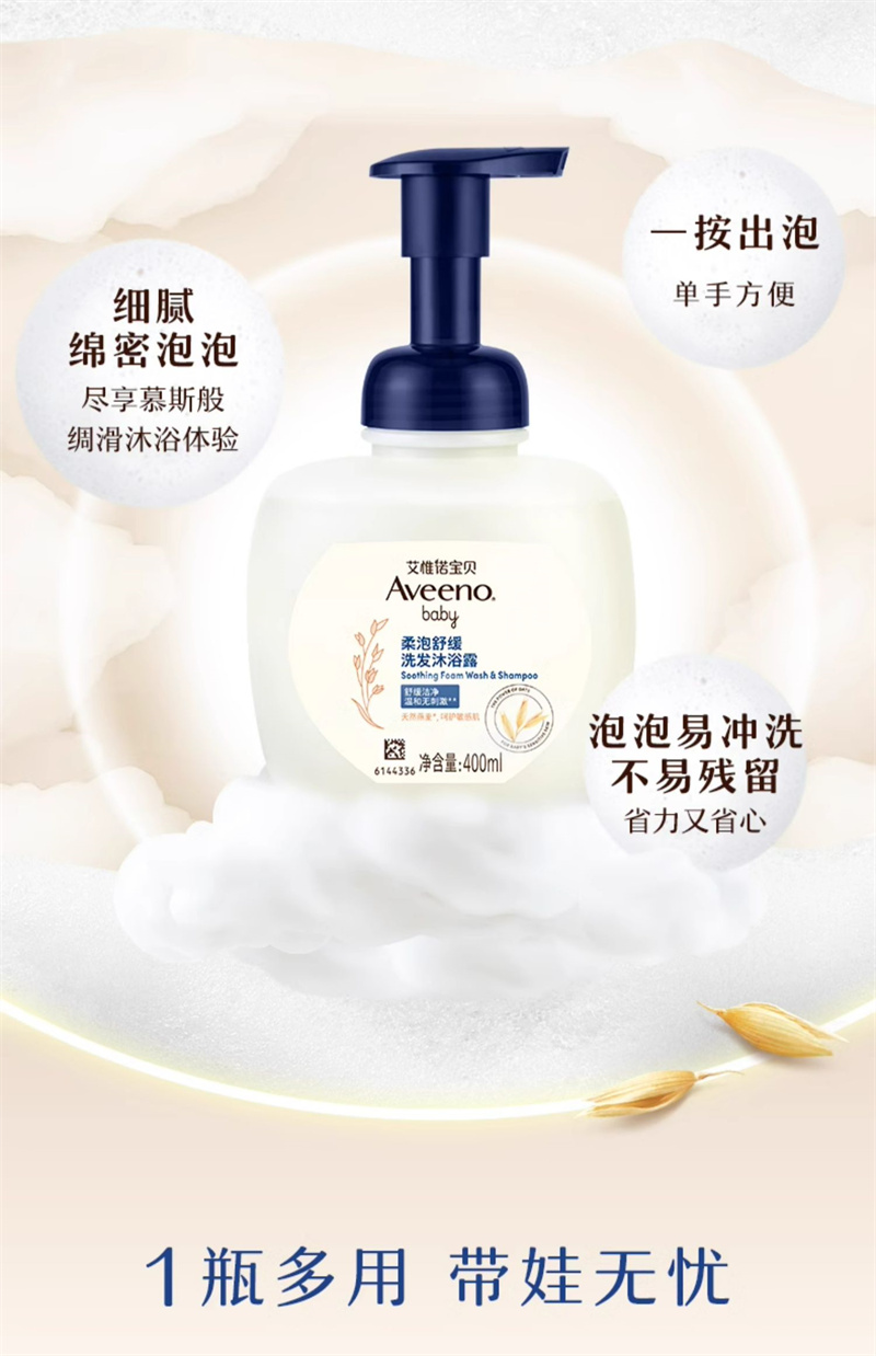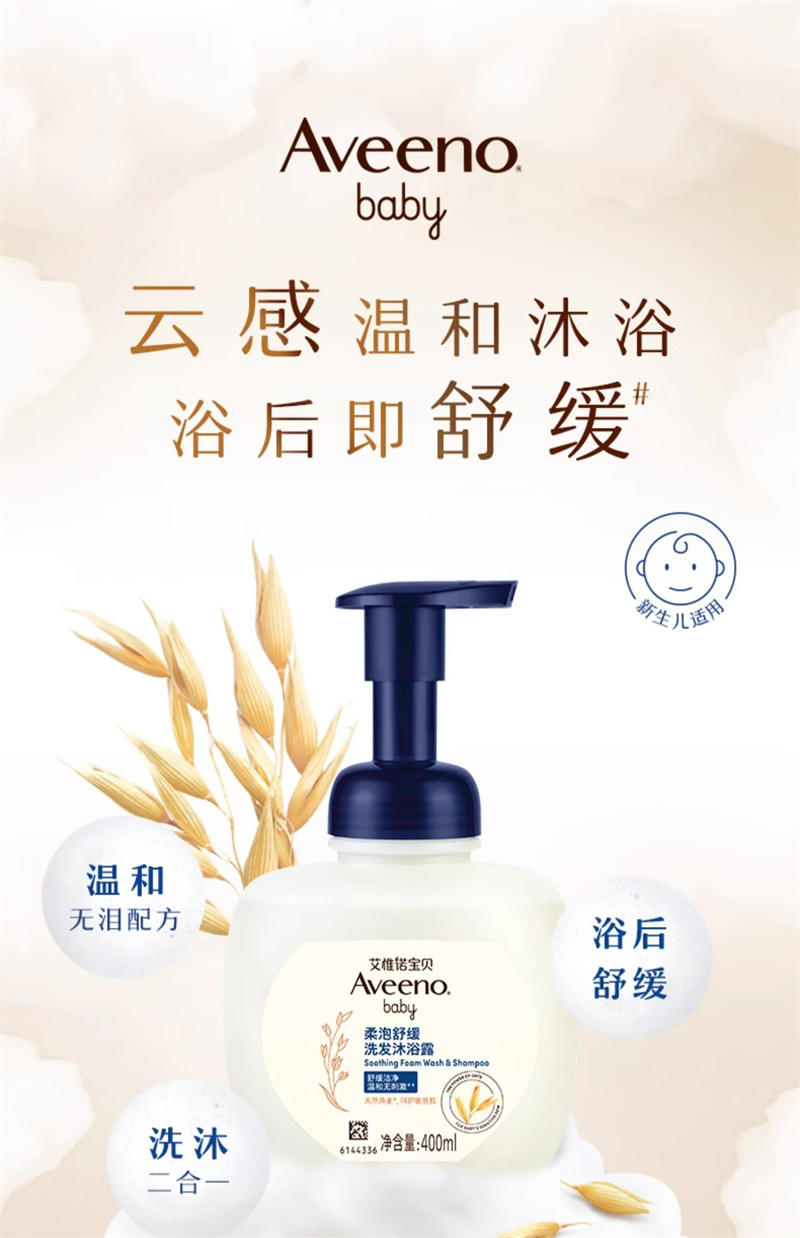 【1:1送水凝保湿霜10g】Aveeno艾惟诺宝贝柔泡舒缓洗发沐浴露二合一400ml