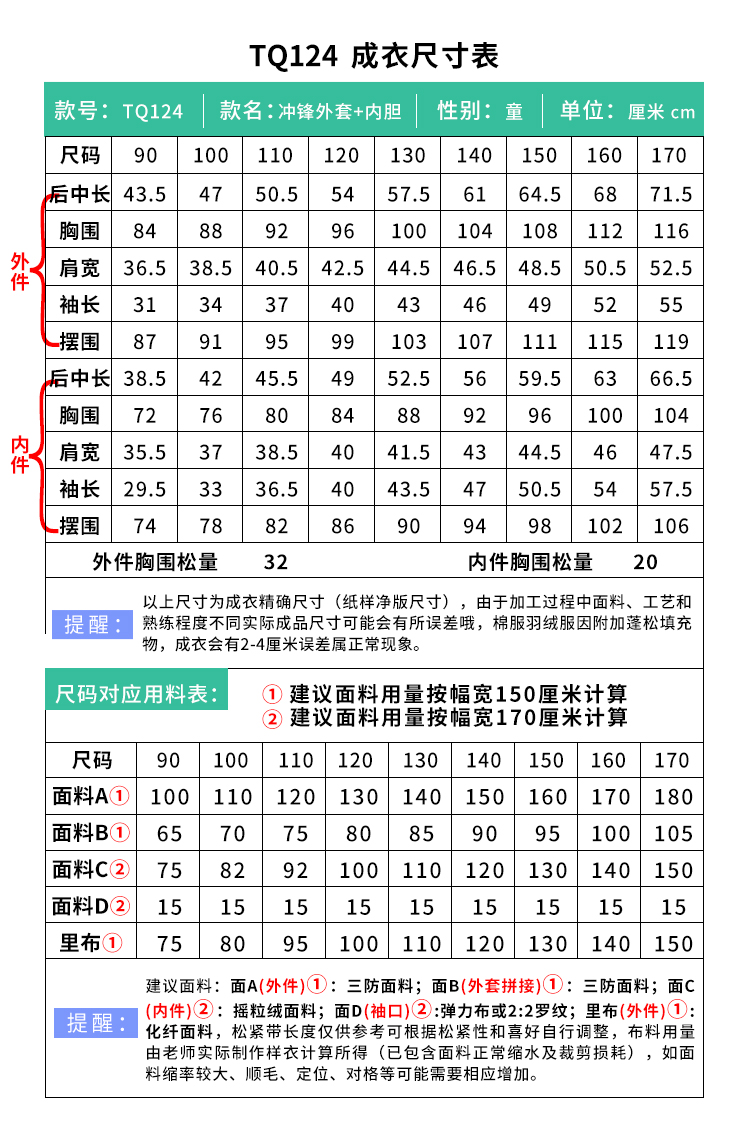 裁缝学苑TQ124女童冲锋衣外套纸样儿童三合一可拆卸加厚抓绒新款打板图纸