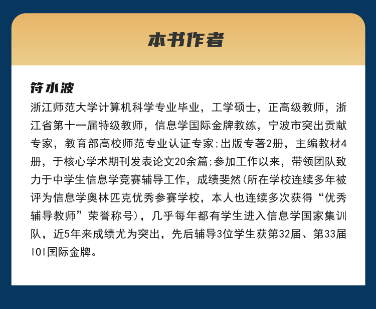 符水波,浙江师范大学计算机科学专业毕业,工学硕士,正 高级教师,浙江省第十一届特 级 教师,信息学国际金牌教练,宁波市突出贡献专家,教yu部高校师范专业认证专家;出版专著2册,主编教材4册,于核心学术期刊发表论文20余篇;参加工作以来,带领团队致力于中学生信息学竞赛辅导工作,成绩斐然(所在学校连续多年被评为信息学奥林匹克优秀参赛学校,本人也连续多次获得“优秀辅导教师”荣誉称号),几乎每年都有学生进入信息学国家集训队,近5年来成绩尤为突出,先后辅导3位学生获第32届、第33届IOI国际金牌。