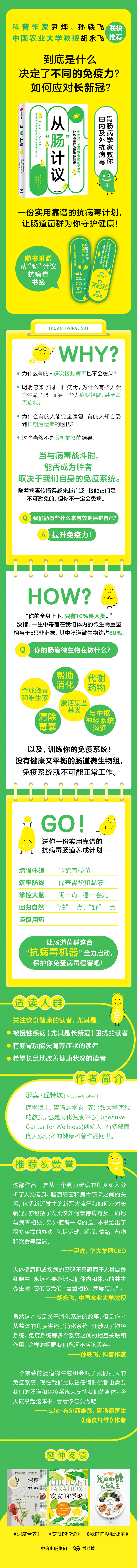 这本书是帮助我们认识肠道菌群并守护其生态平衡的有效助力,能够为我们提供实操性强、有扎实科学依据背书的健康计划。它简明易懂,来自美国著名的肠胃病专家,作者写得实用透彻,不会让我们产生畏难心理。这份抗病毒肠道计划温和不过激,和我们的日常生活息息相关,不管是整体健康尚可的读者,还是有某些基础疾病的读者,都可以从中找到切实可行、适合自己的建议和方法。
