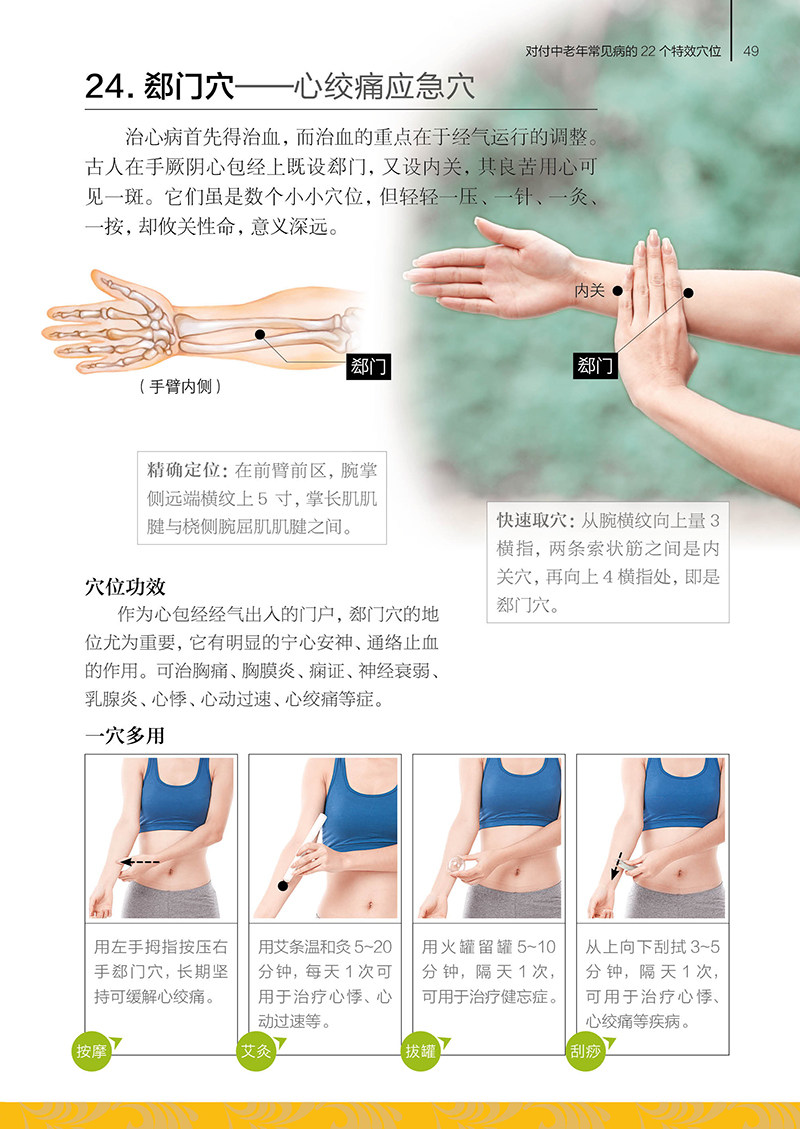 作为心包经经气出入的门户,郄门穴的地位尤为重要,它有明显的宁心安神、通络止血的作用。可治胸痛、胸膜炎、痫证、神经衰弱、乳腺炎、心悸、心动过速、心绞痛等症。