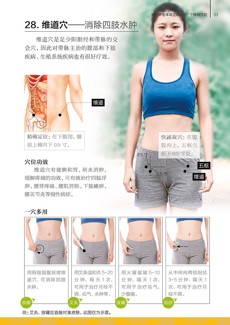 艾灸:用艾条温和灸5~20分钟,每天1次,可用于治疗痛经、水肿等。