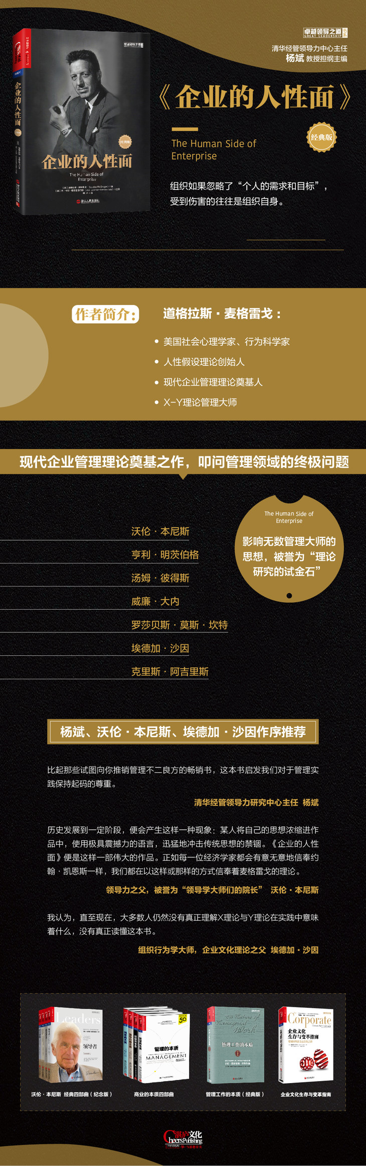 ◆ 《企业的人性面:经典版》叩问管理领域的终极问题:人到底是创造价值的机器,还是可以根据需要削减的成本?“Y理论”强调个人目标与组织目标的融合,正如麦格雷戈所说:“如果组织忽略了个人需求和目标,受到伤害的往往是组织自身”。借助本书,作者强化了研究人性假设的重要性,告诫实践者成功管理的因素虽然有很多,但首要能力莫过于拥有前瞻性和控制人性的行为。