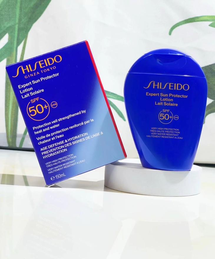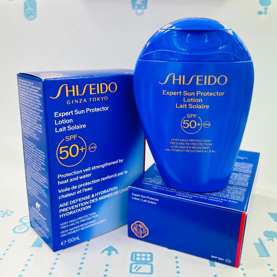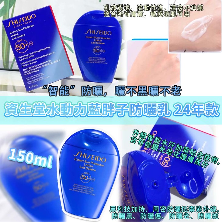 👑资生堂水动力蓝胖子防晒霜(黄字)50ml/150ml 👍“智能”防晒,晒不黑晒不老 😎升级智能水汗加乘贴合技术:WETFORCE 💦遇水后防晒网更紧密,更均匀,即遇水成墙 🍀智能抵御光老化,含有修护光老化护肤成分 🙌黑科技加持,周密防晒抵御紫外线,防晒黑、防晒伤、防晒老、防晒斑 🌊乳液质地,流动性强,清爽不油腻 👏🏻不闷痘、不泛白、易清洁 💛适合所有肤质,敏感痘肌可用