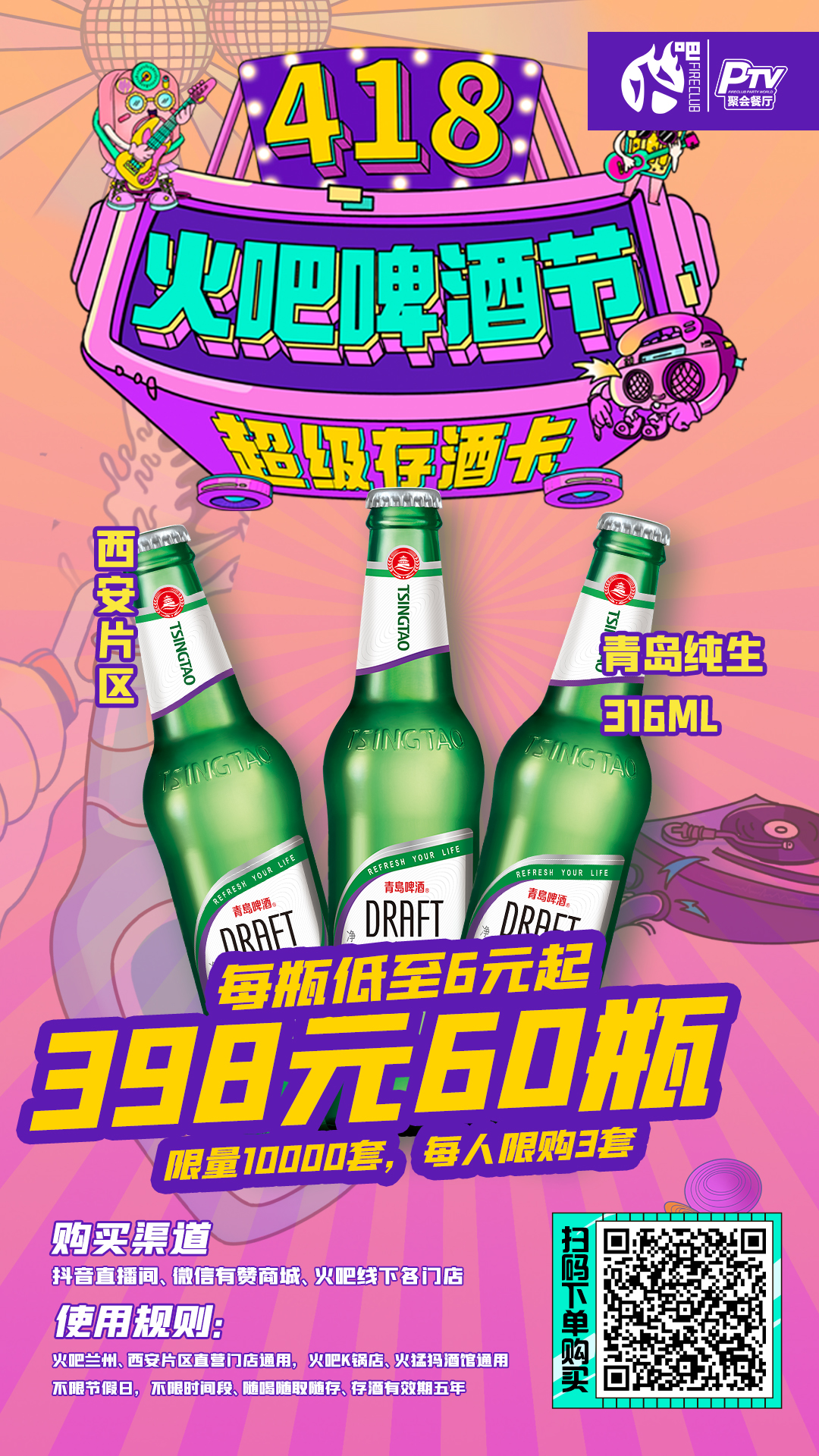西安片区-4月18日火吧啤酒节—超值存酒卡来了—398元60瓶青岛纯生啤酒