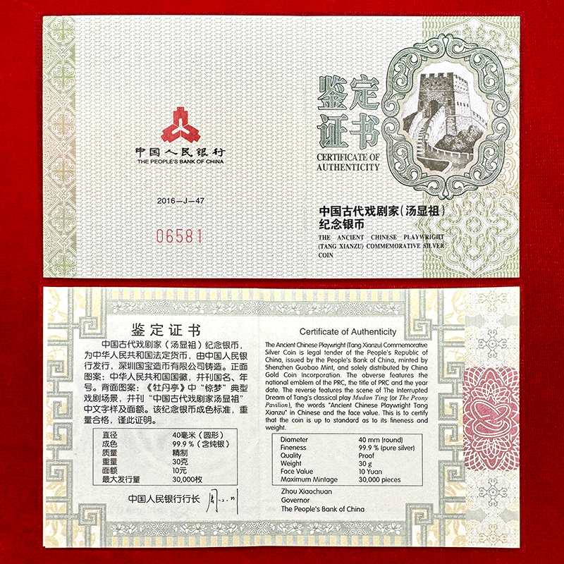 中国古代戏剧家(汤显祖)银币 纯银30克 封装评级 带礼盒 带证书