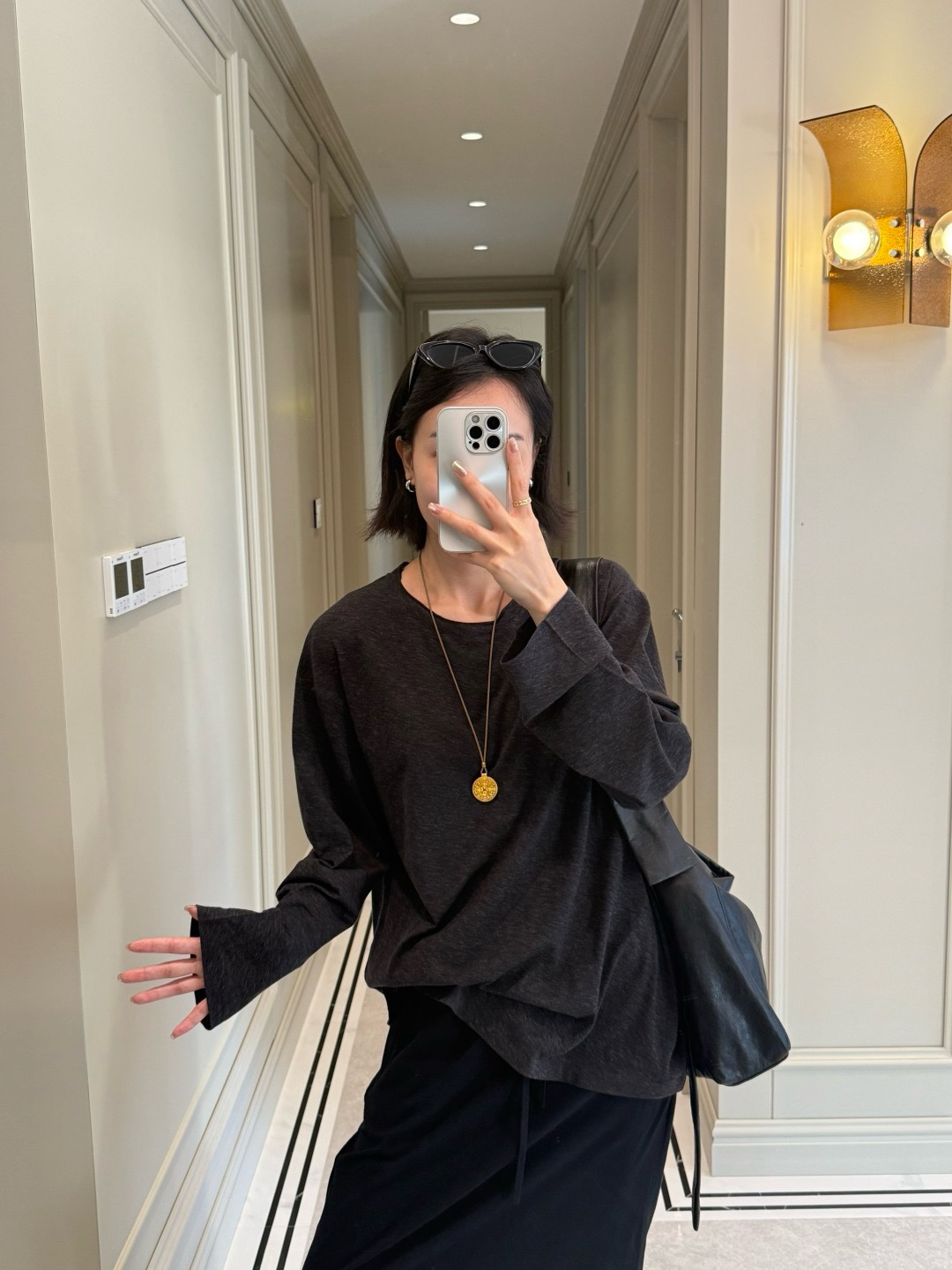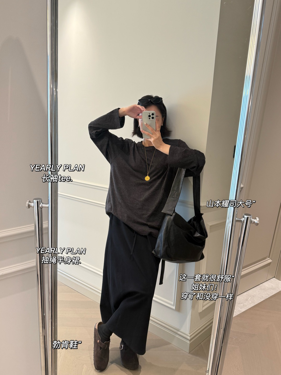 纯元~! 韩国进口面料 🇰🇷 YEARLY PLA*N 混纺毛边圆领长袖tee打底➕垂感针织抽绳半身裙 🤍~!