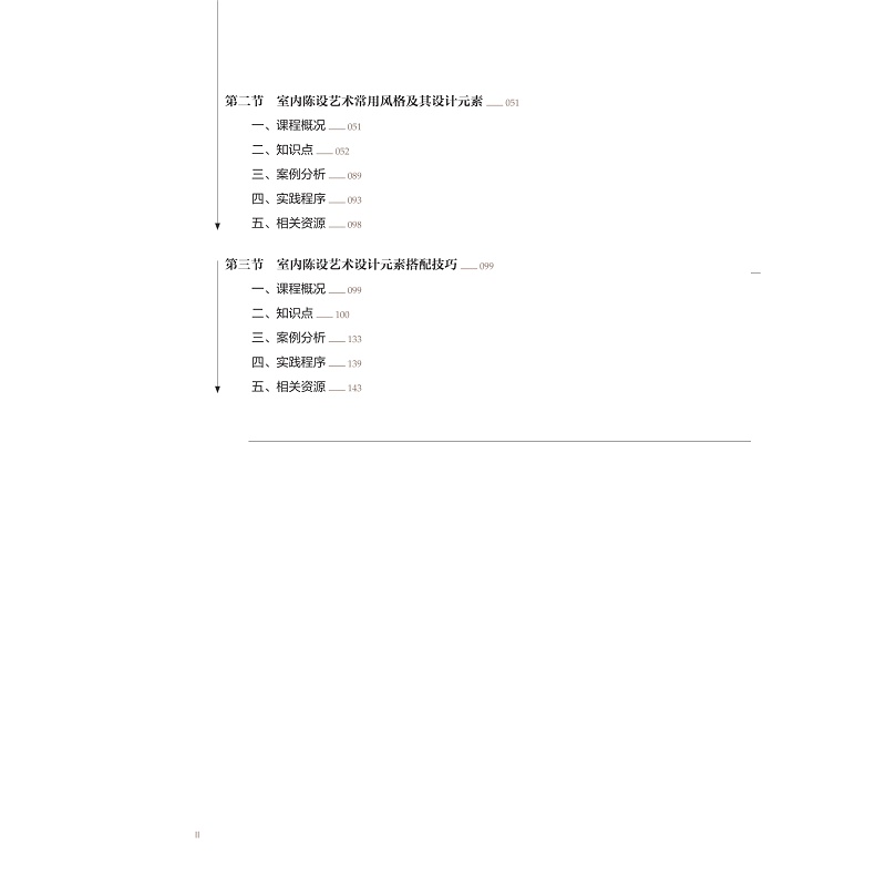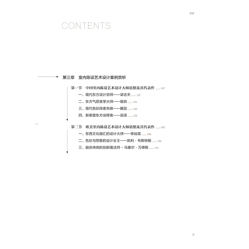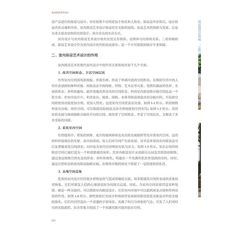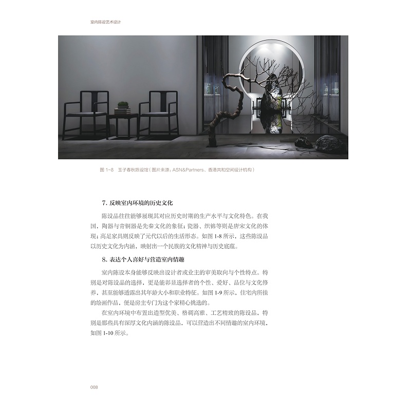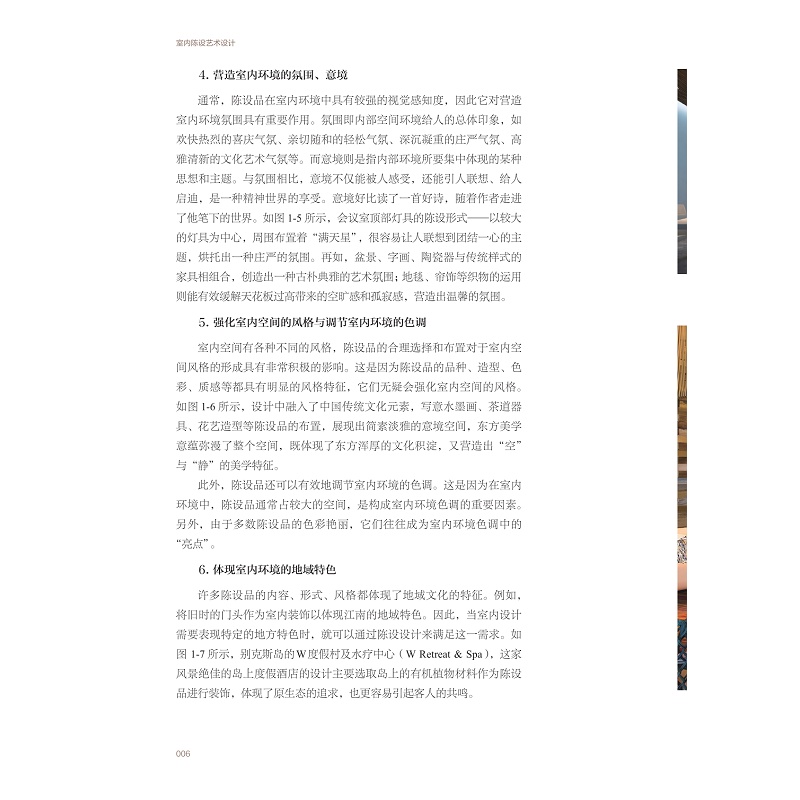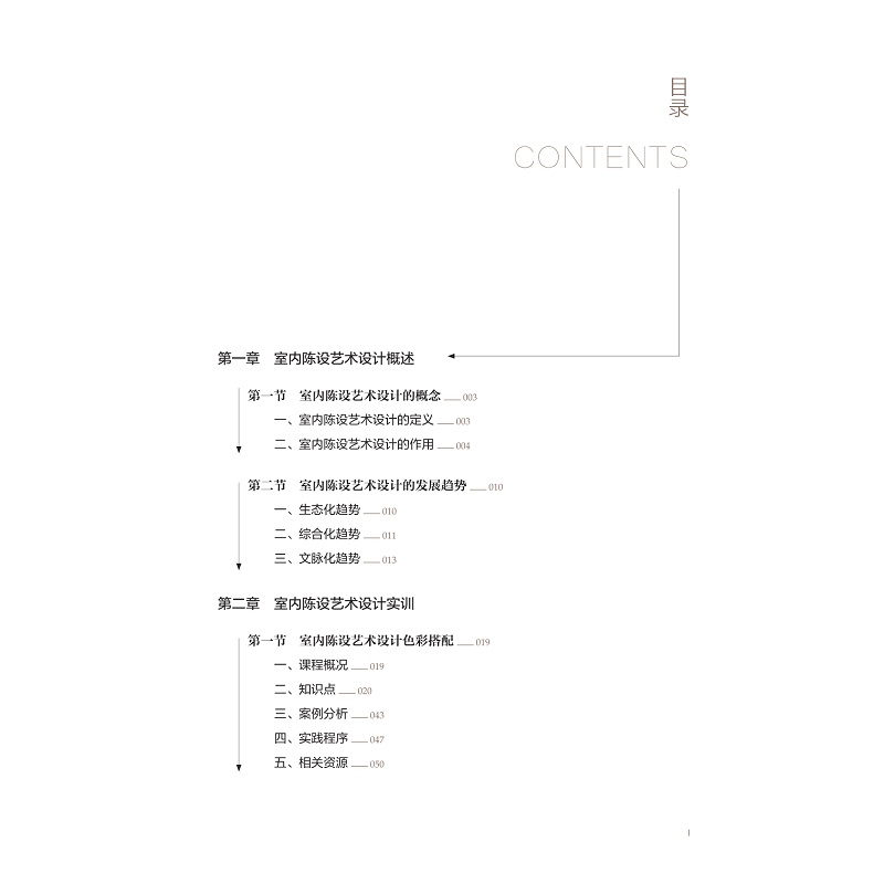 《室内陈设艺术设计》的编写以学生中心,对传统的教学内容做了更新,将中国特色社会主义建设的最新理论成果和实践经验引入课堂、写入教材,转化为优质教学资源;同时坚持产出导向,突出“艺工结合”的特色,产教深度融合,打造具有真实企业情景的项目化、任务驱动式理实一体化教材。.教材内容共分三章:第一章为室内陈设艺术设计基础理论,解析陈设艺术设计概念,介绍陈设艺术设计历史与发展,以及陈设艺术设计的功能和原则等内容;第二章为陈设艺术设计项目实训,主要包括陈设色彩搭配设计、陈设风格空间设计、陈设元素设计搭配、室内空间陈设艺术综合设计等四个项目的实训内容;第三章为代表作品解析,分析国内外陈设艺术设计大师的思想及其代表作品。