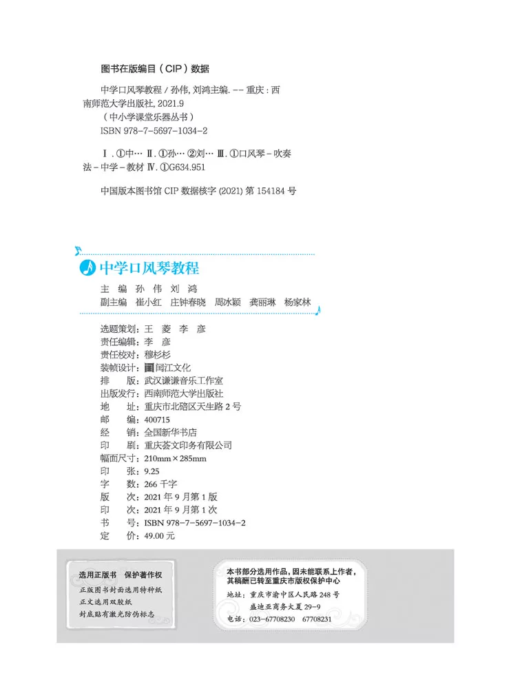 *书名:中学口风琴教程 | *ISBN:978-7-5697-1034-2 |
