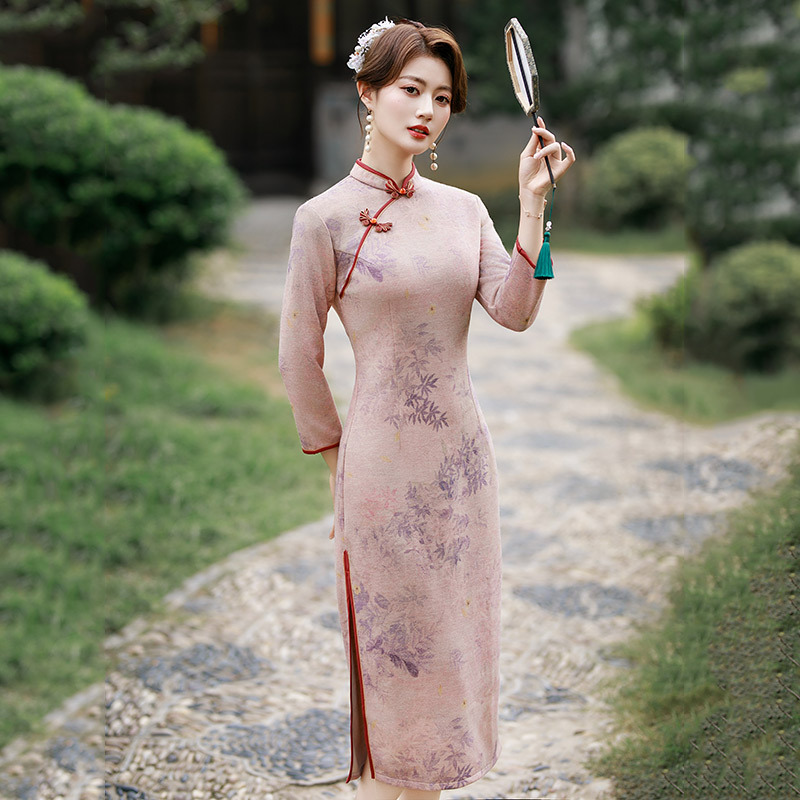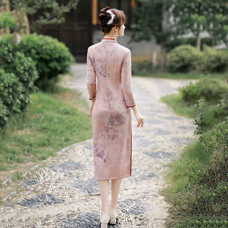 SC22064新款春季印花麂皮绒长款七分袖显瘦旗袍中国风气质修身连衣裙