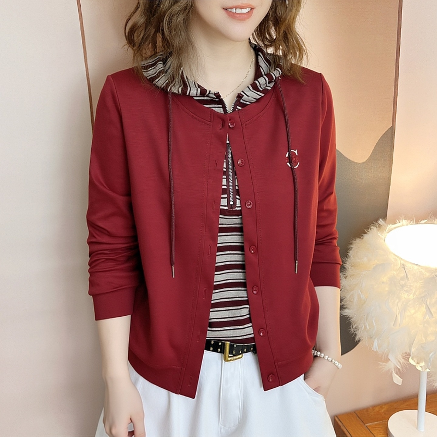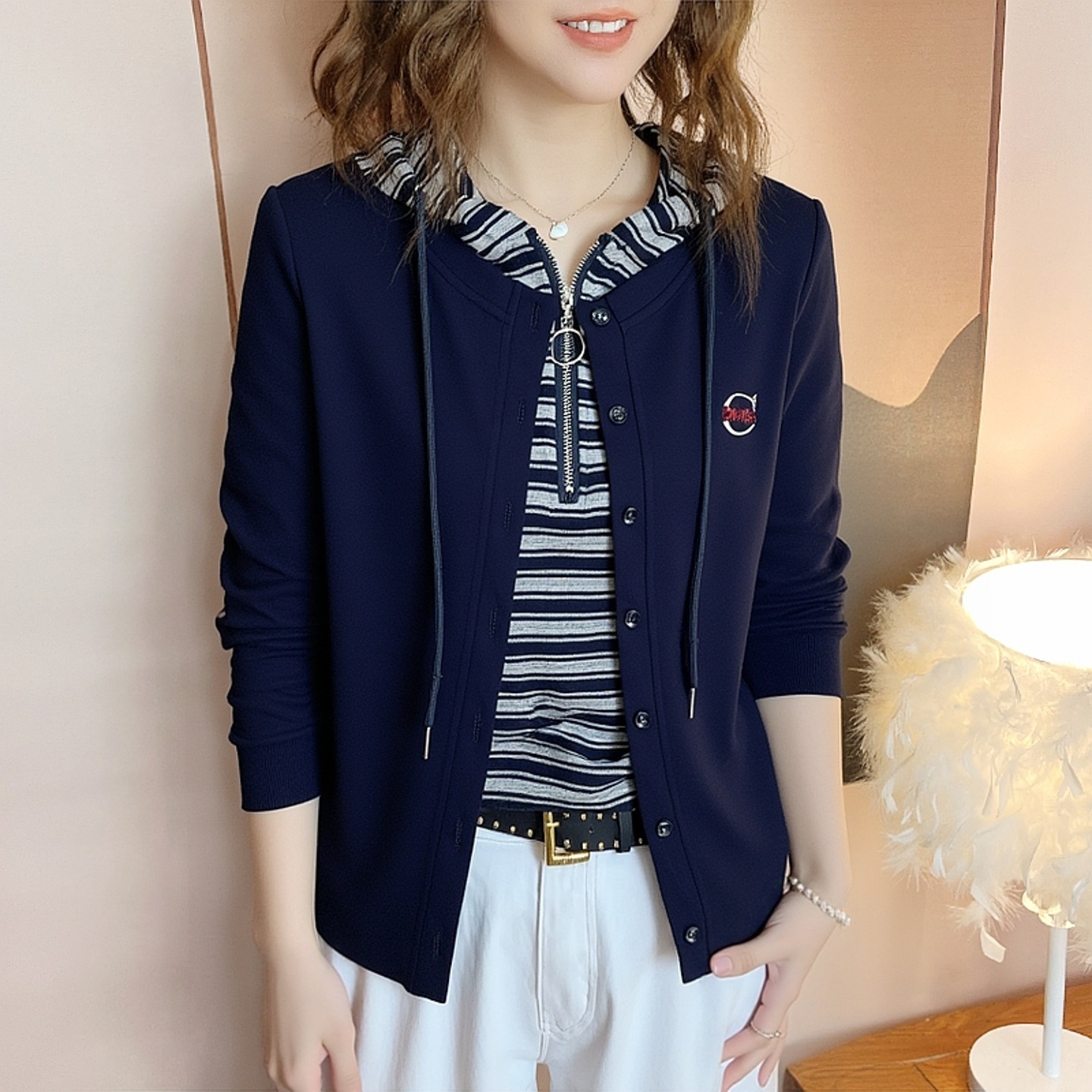 女士妈妈装减龄休闲假两件条纹拼接连帽卫衣秋季新款套头直筒外穿