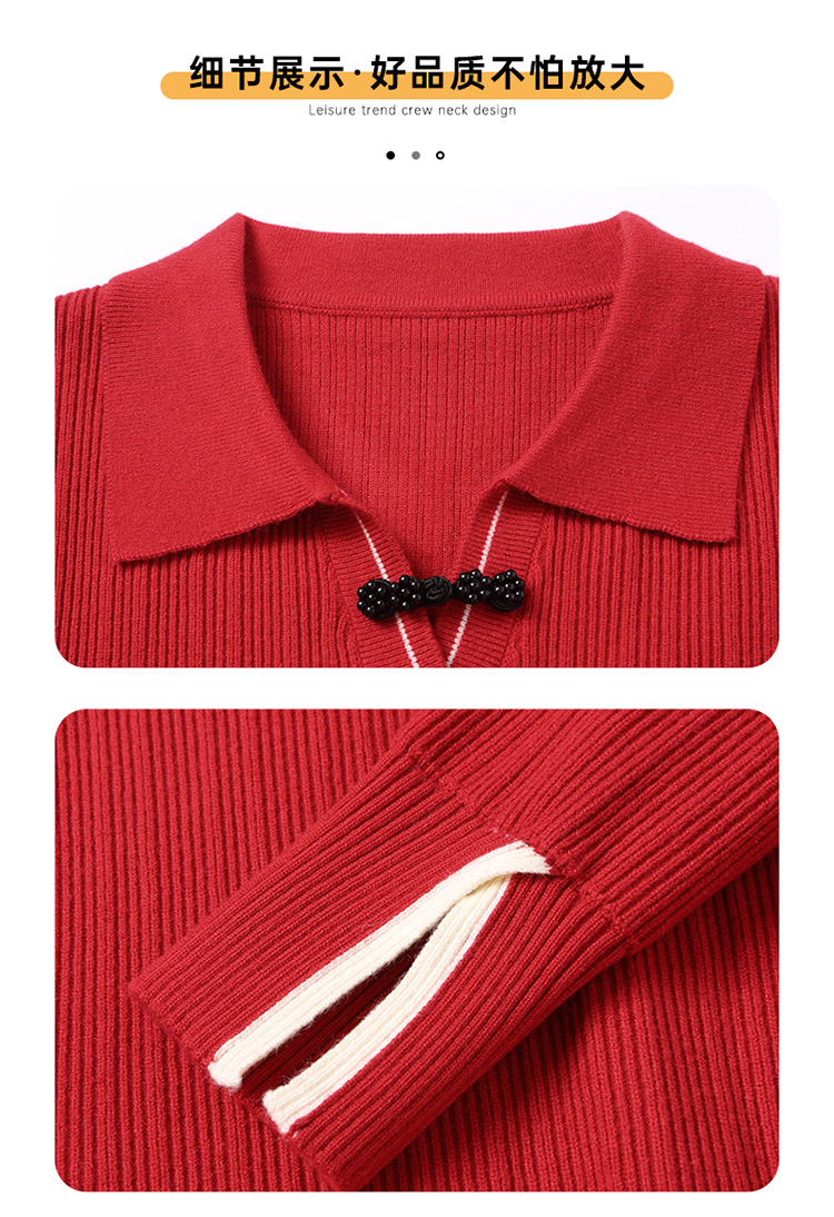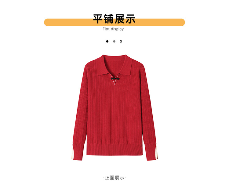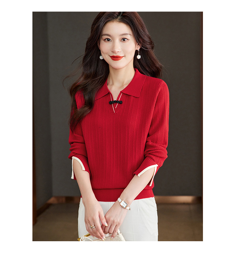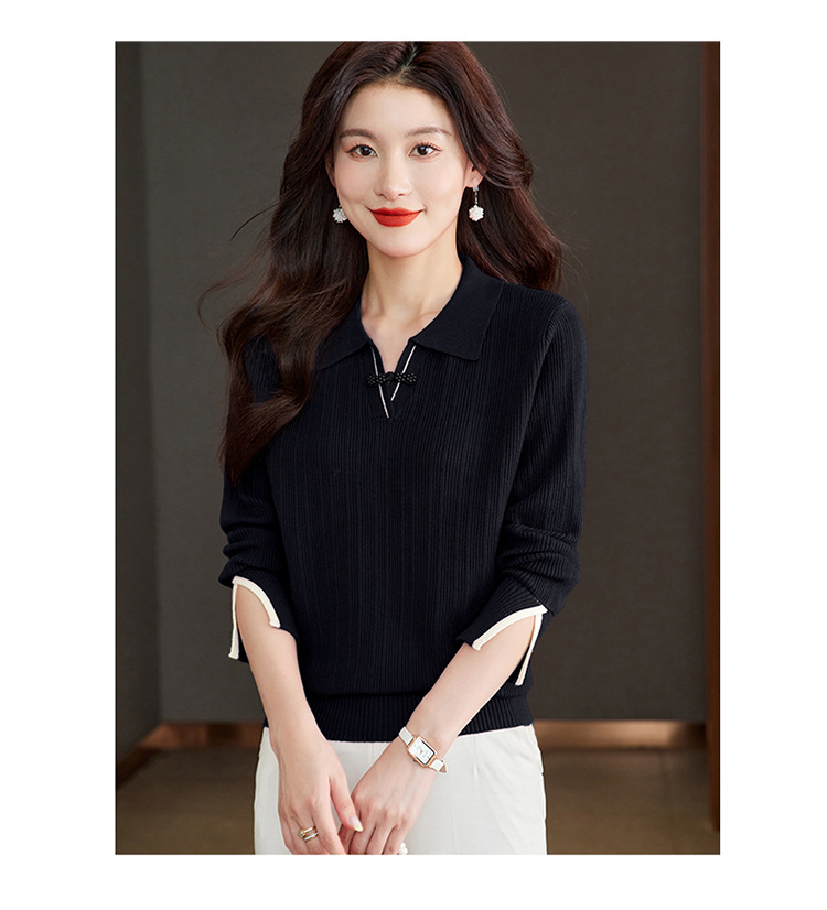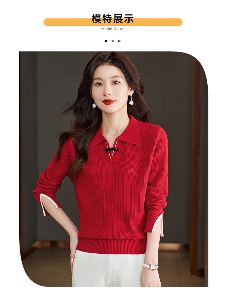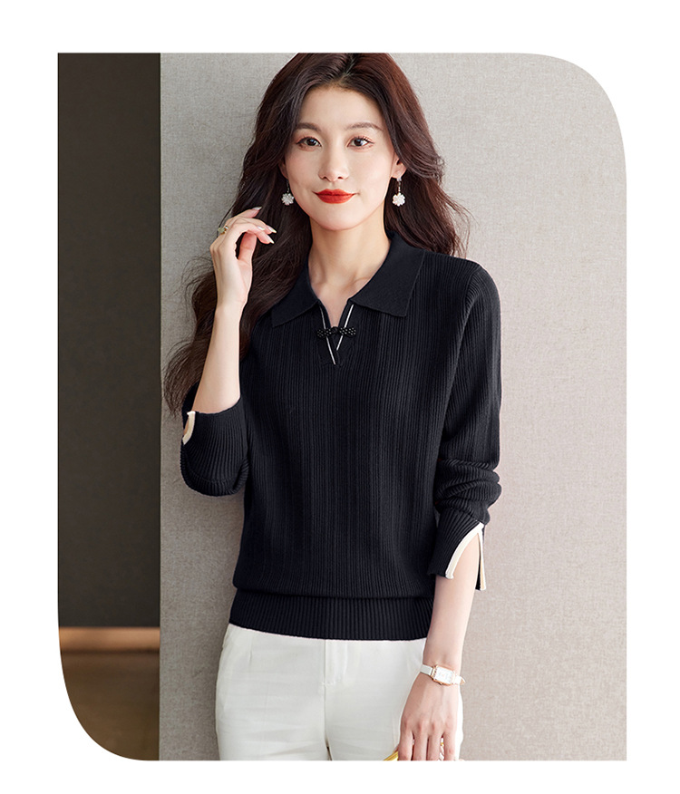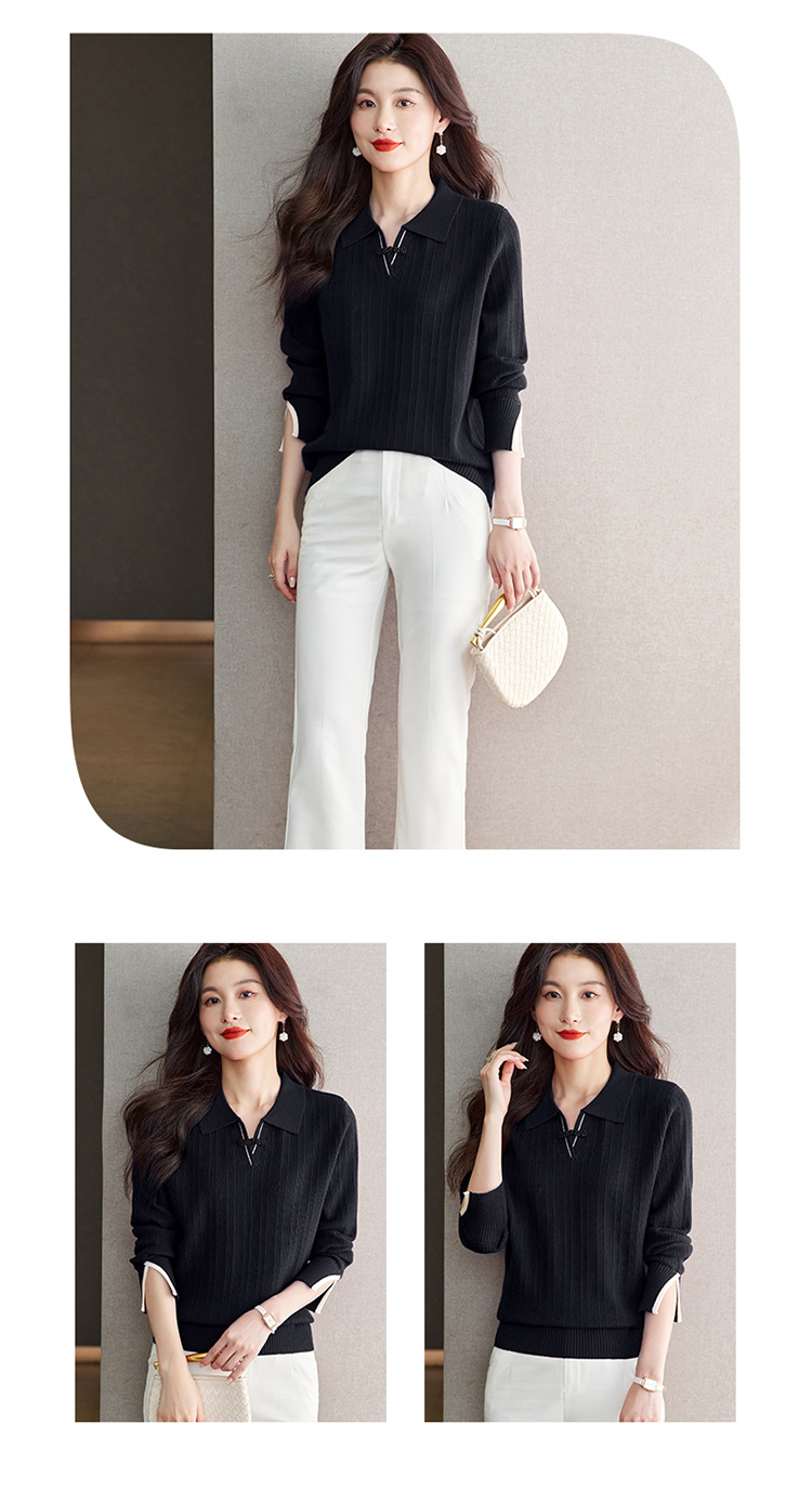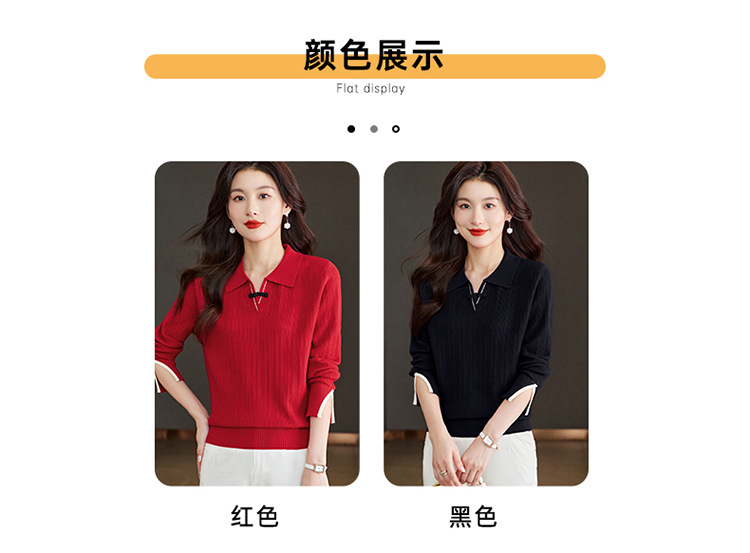 CC-66-5850翻领针织上衣女春秋宽松袖子开叉上衣polo领打底衫薄款毛衣