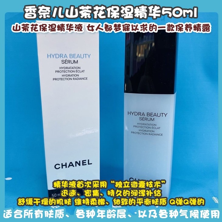 香奈儿山茶花保湿精华50ml 👍山茶花保湿精华液,女人都梦寐以求的一款保养精露😍。精华液首次采用“独立微囊技术”,迅速、密集、持久的润泽补给💦,舒缓干燥的肌肤,维持柔嫩、细致的平衡肤质,Q弹Q弹的〰,能明显感受肌肤吸收到的最新鲜水润感👀。里面含有的山茶花精华和蓝姜精华还能帮助修护肌肤屏障。适合所有肤质、各种年龄层、以及各种气候使用✔,在美容保养界中它必须拥有名字。
