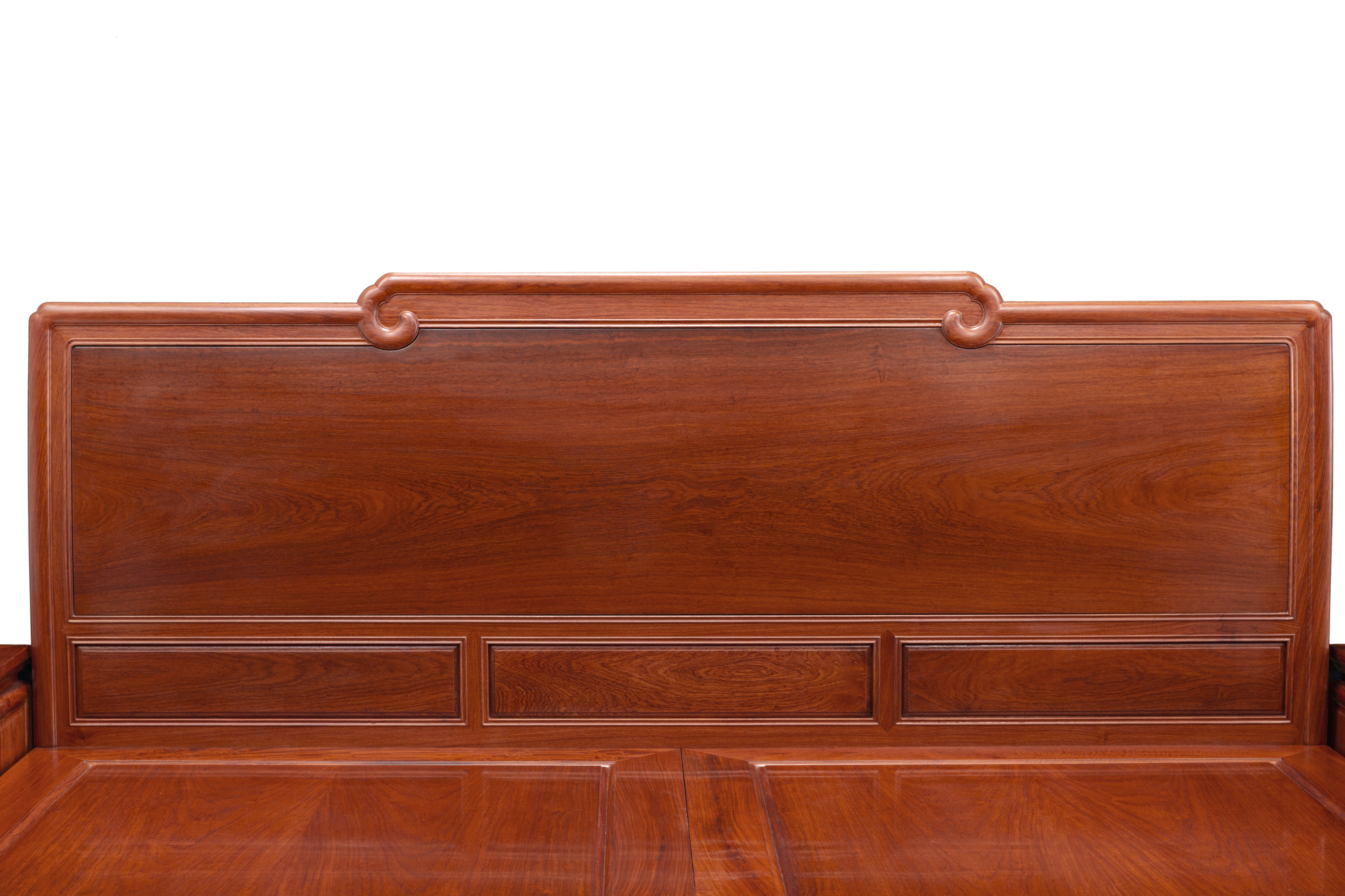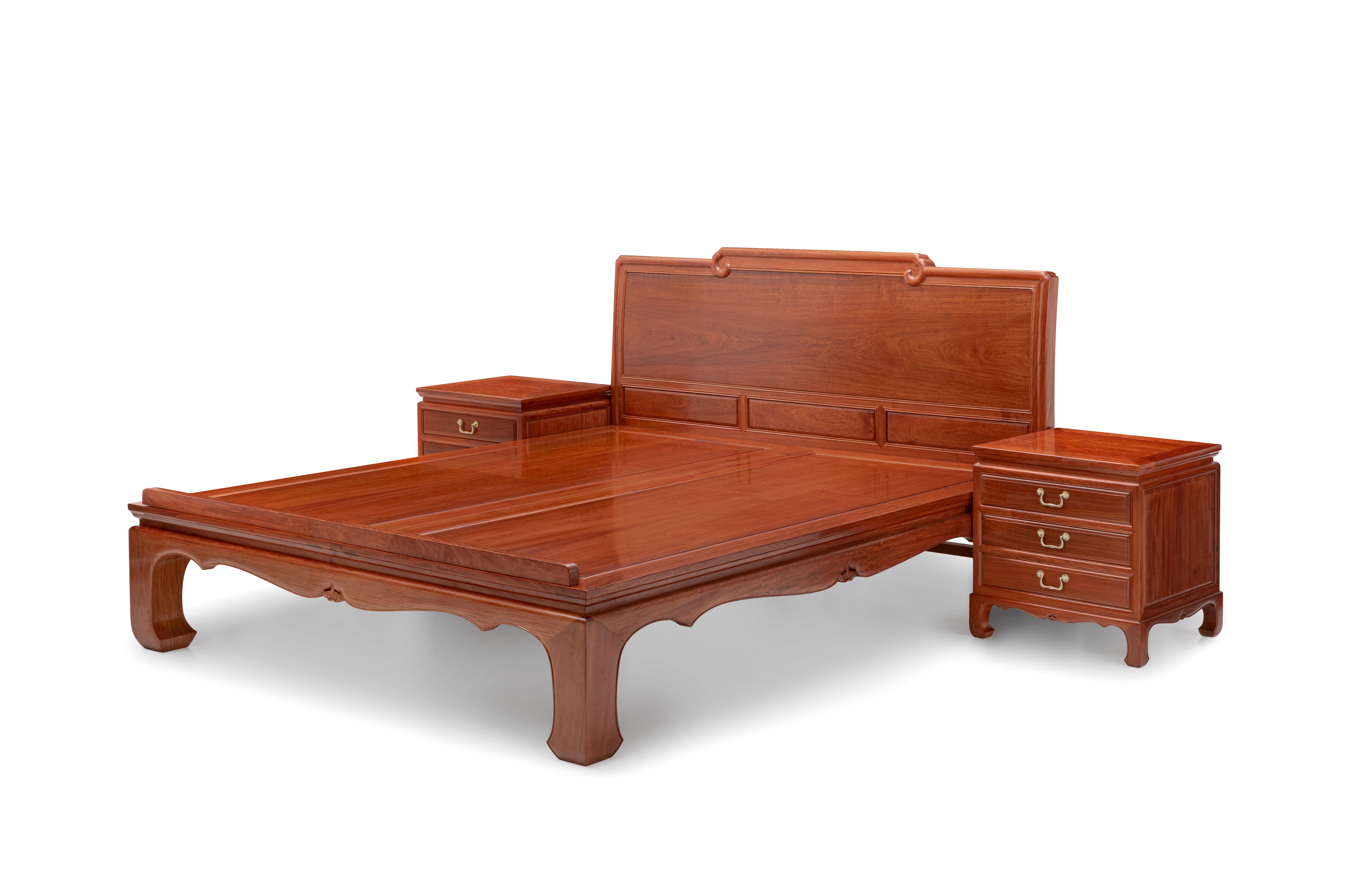 此款如意素面高低床,整体光素,床头背板中间略高,两边低,为卷云式搭脑,祥云卷曲回绕,弯靠背,倚靠舒适。床板采用攒边平装,四腿足抱肩榫结构,内翻马蹄形,坚实牢固,稳重大气。