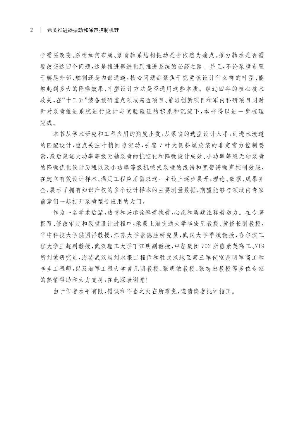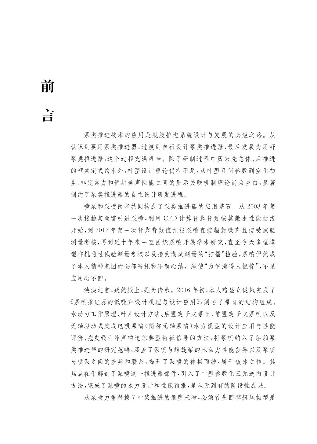 泵类推进技术的应用是舰艇推进系统设计与发展的必经之路,然而目前叶型设计理论仍有不足,从叶型几何参数到空化初生、非定常力和辐射噪声性能之间的显示关联机制理论尚为空白,显著制约了泵类推进器的自主设计研发进程。本书从泵喷的选型设计入手,到进水流道的匹配设计,重点关注叶梢间隙流动,引鉴7叶大侧斜螺旋桨的非定常力控制要素,最后聚焦大功率等级无轴泵喷的抗空化和降噪设计成效、小功率等级无轴泵喷的降噪优化设计历程以及小功率等级机械式泵喷的线谱和宽带谱噪声控制效果,在建立有效设计样本、满足工程应用需求这一主线上逐步展开,理论、数据、成果齐全,展示了拥有知识产权的多个设计样本的主要测量数据。