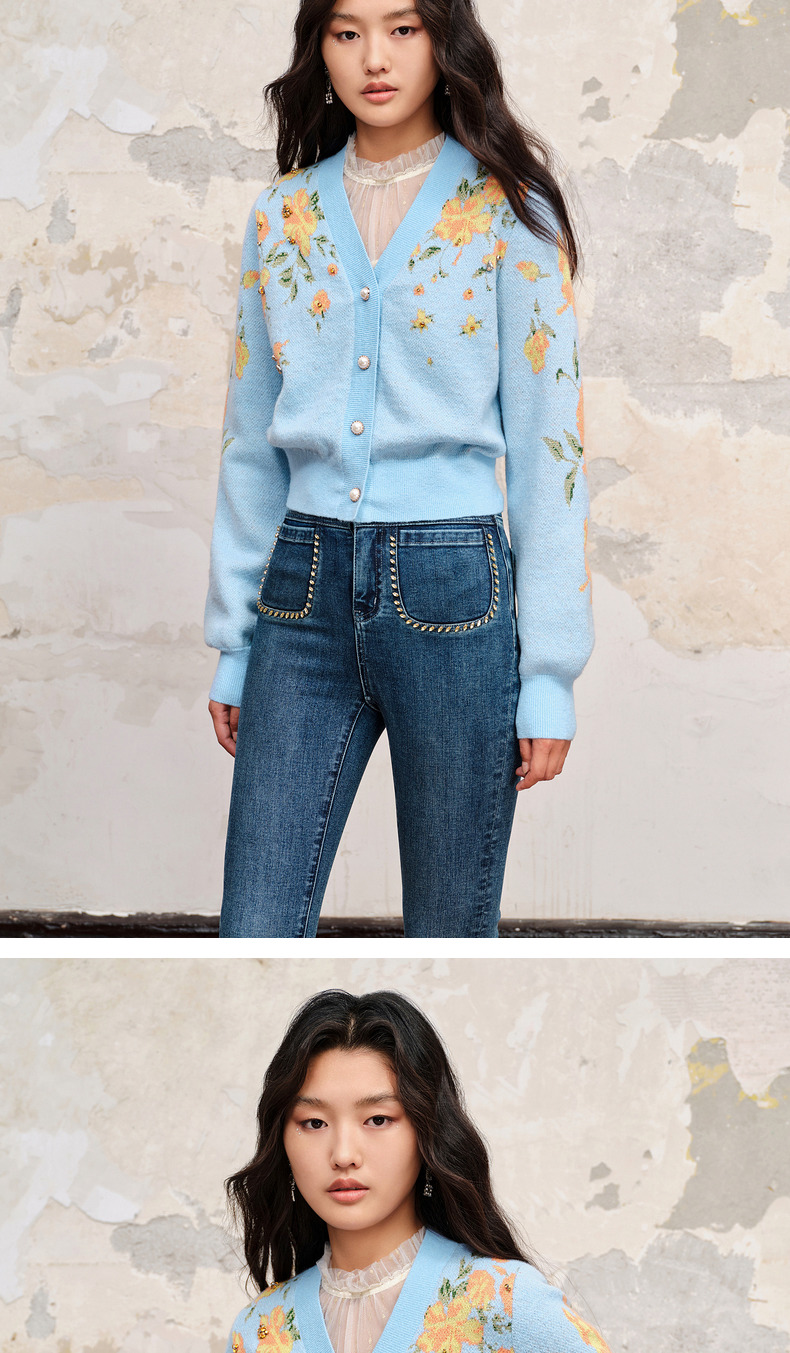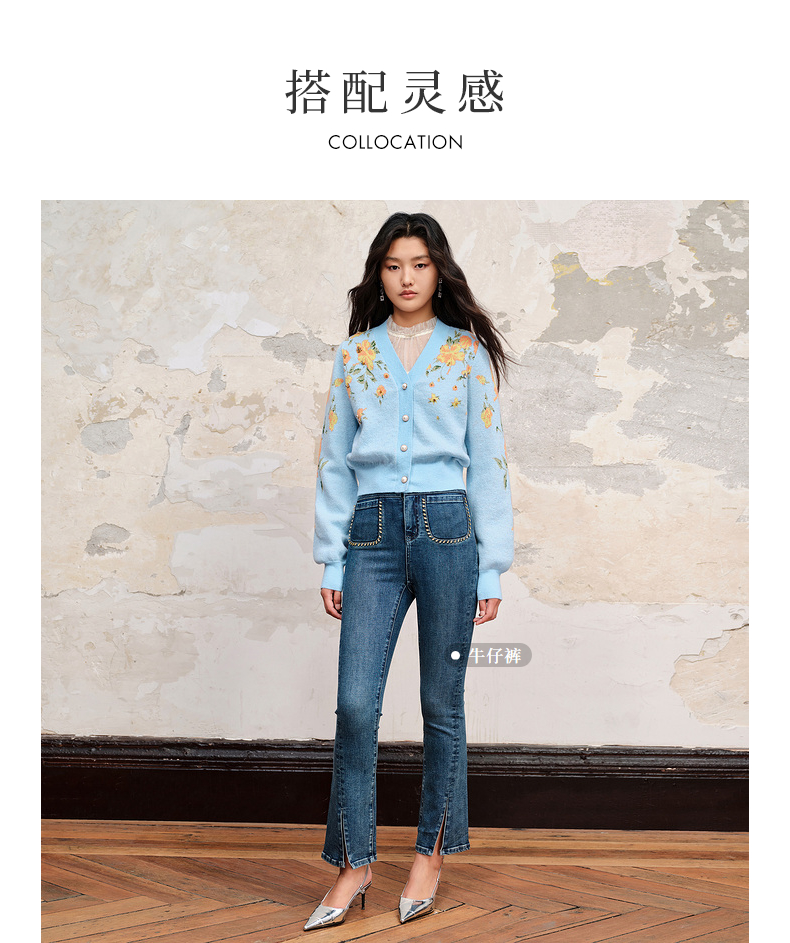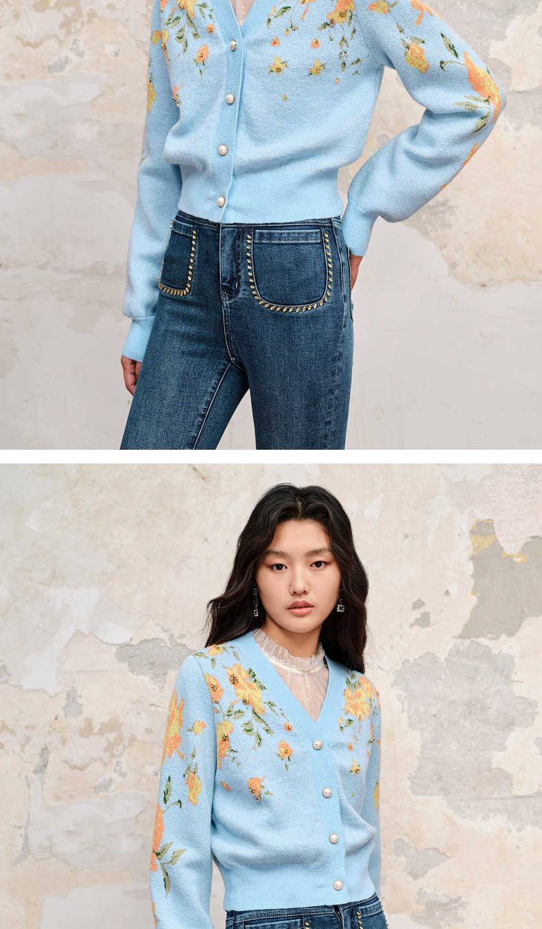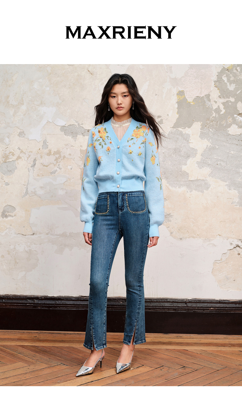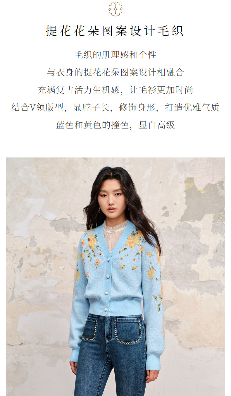 【商场同款】MAXRIENY复古提花v领针织毛衫23秋冬马海毛套头毛衣(货号:MC88JA574)