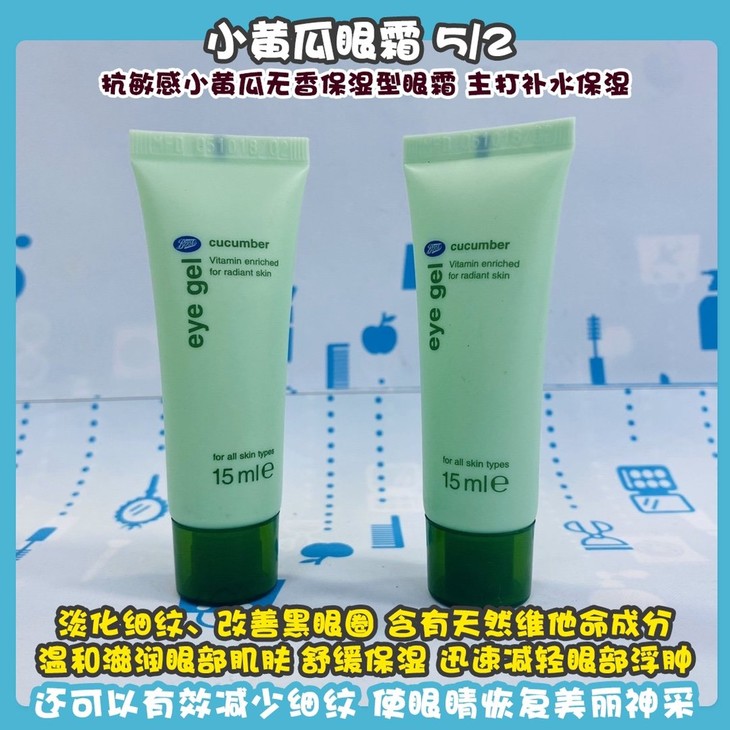 小黄瓜眼霜 5/2 👍抗敏感小黄瓜无香保湿型眼霜,主打补水保湿💦、淡化细纹、改善黑眼圈。含有天然维他命成分,温和滋润眼部肌肤👀,舒缓保湿,迅速减轻眼部浮肿✔。还可以有效减少细纹,使眼睛恢复美丽神采✨。实惠❗天然❗清爽❗你指的拥有💯