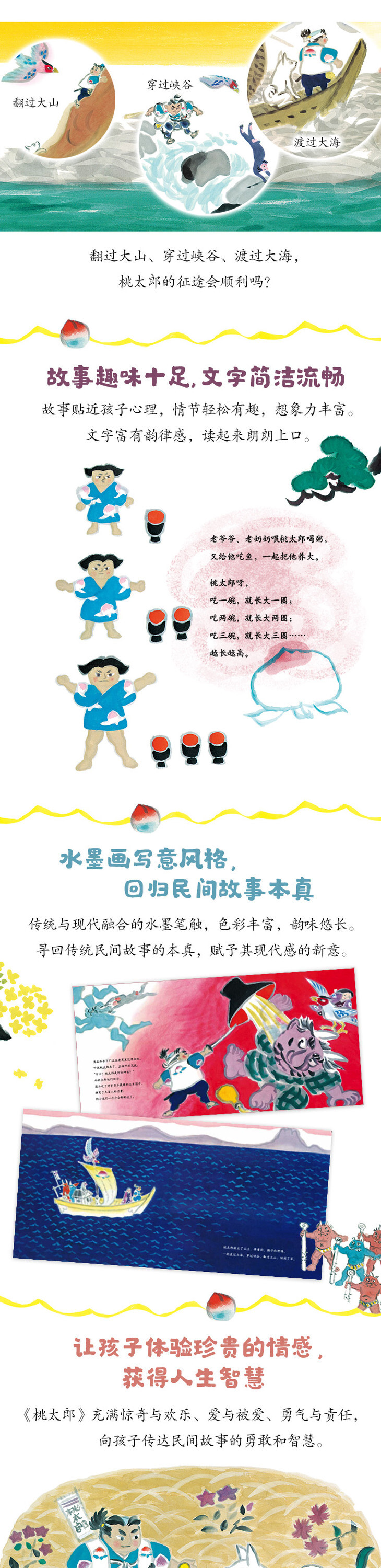 水墨画的写意手法和日本家喻户晓的民间故事的巧妙结合,符合孩子思维的故事加上富有东方韵味的绘画,给孩子美的享受。——豆瓣评论